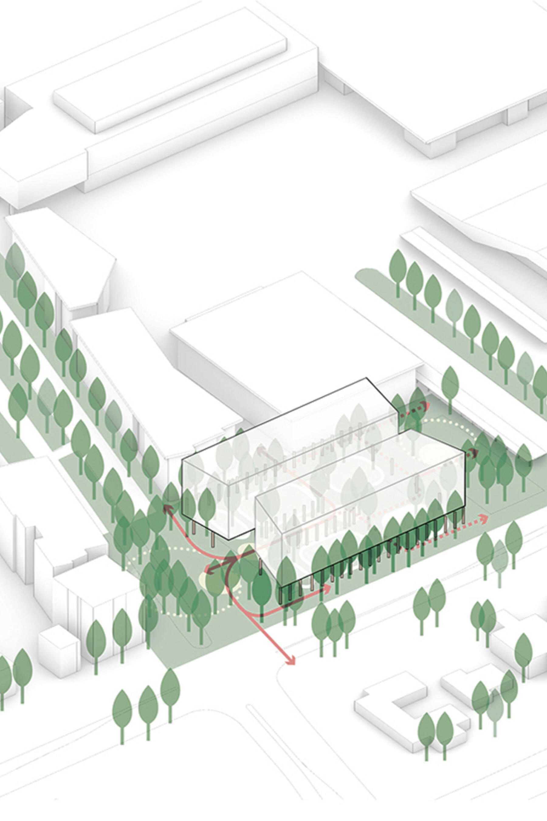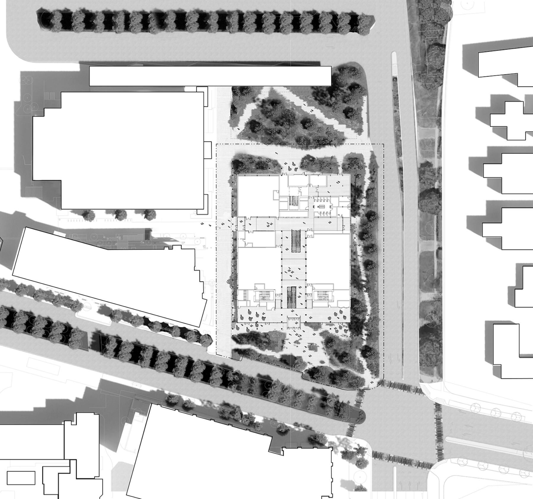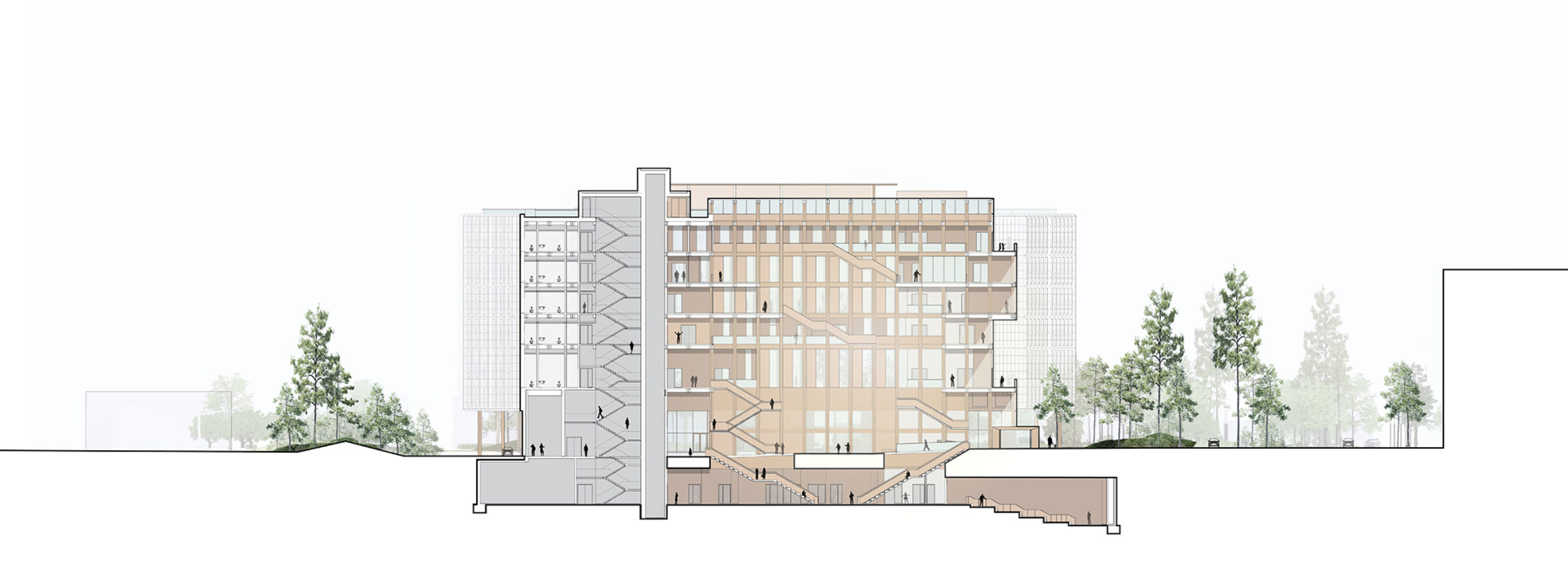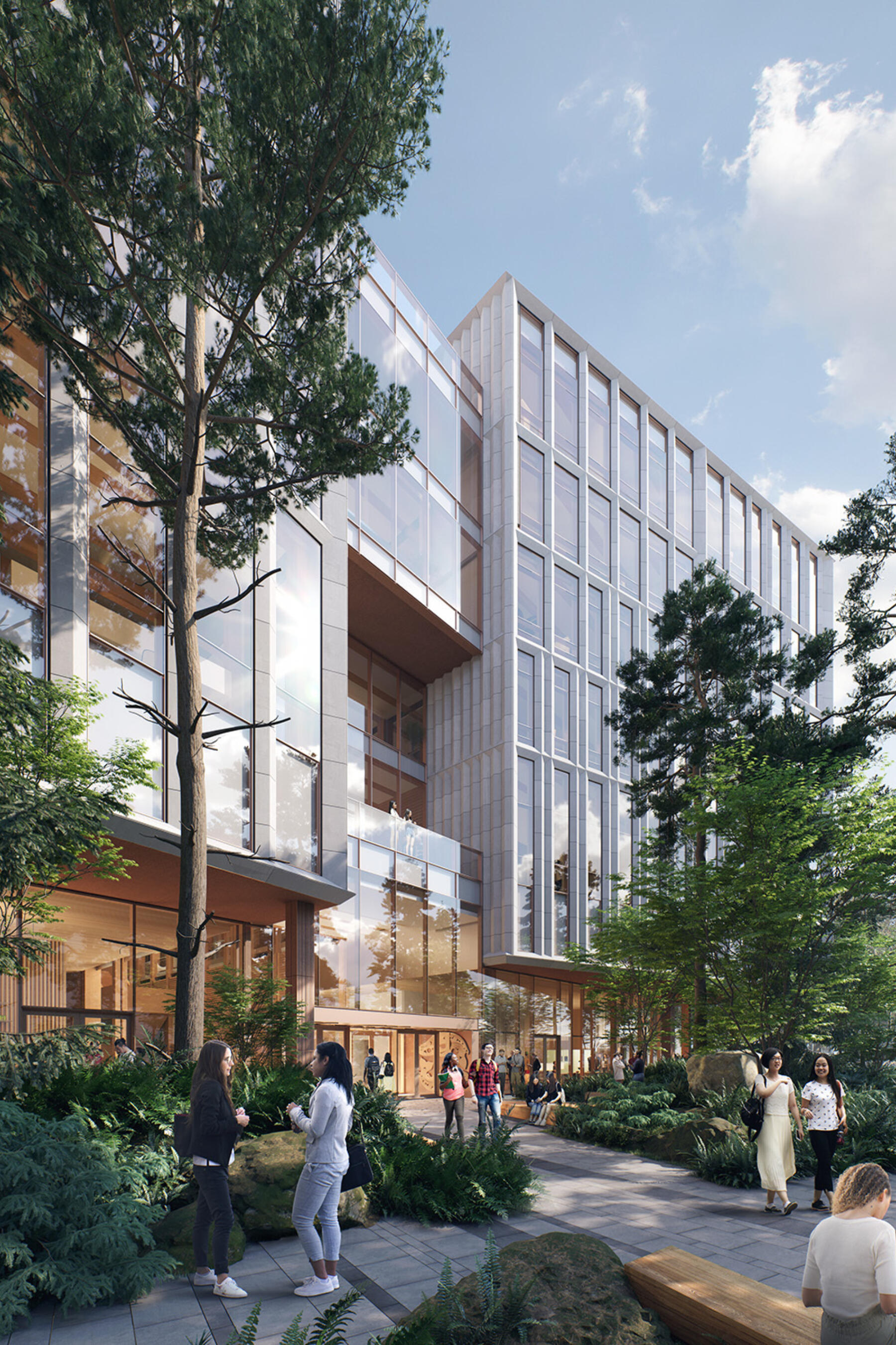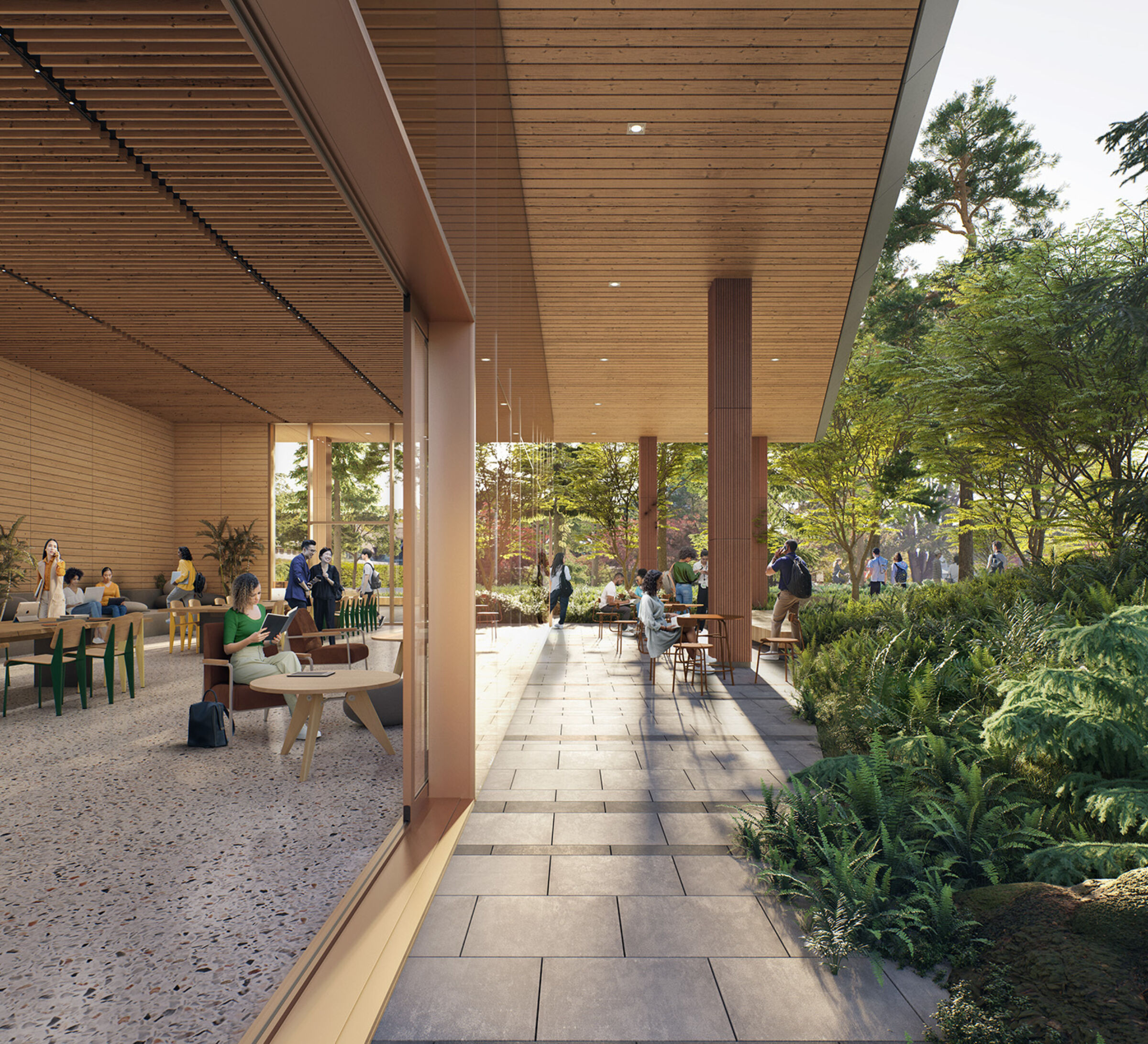 The surrounding landscape is designed as an extension of the architecture, enhancing local ecology and creating a welcoming environment with significant trees and lush ground cover. The design emphasizes biophilic principles, integrating natural materials and daylight to support well-being and comfort for all users.
