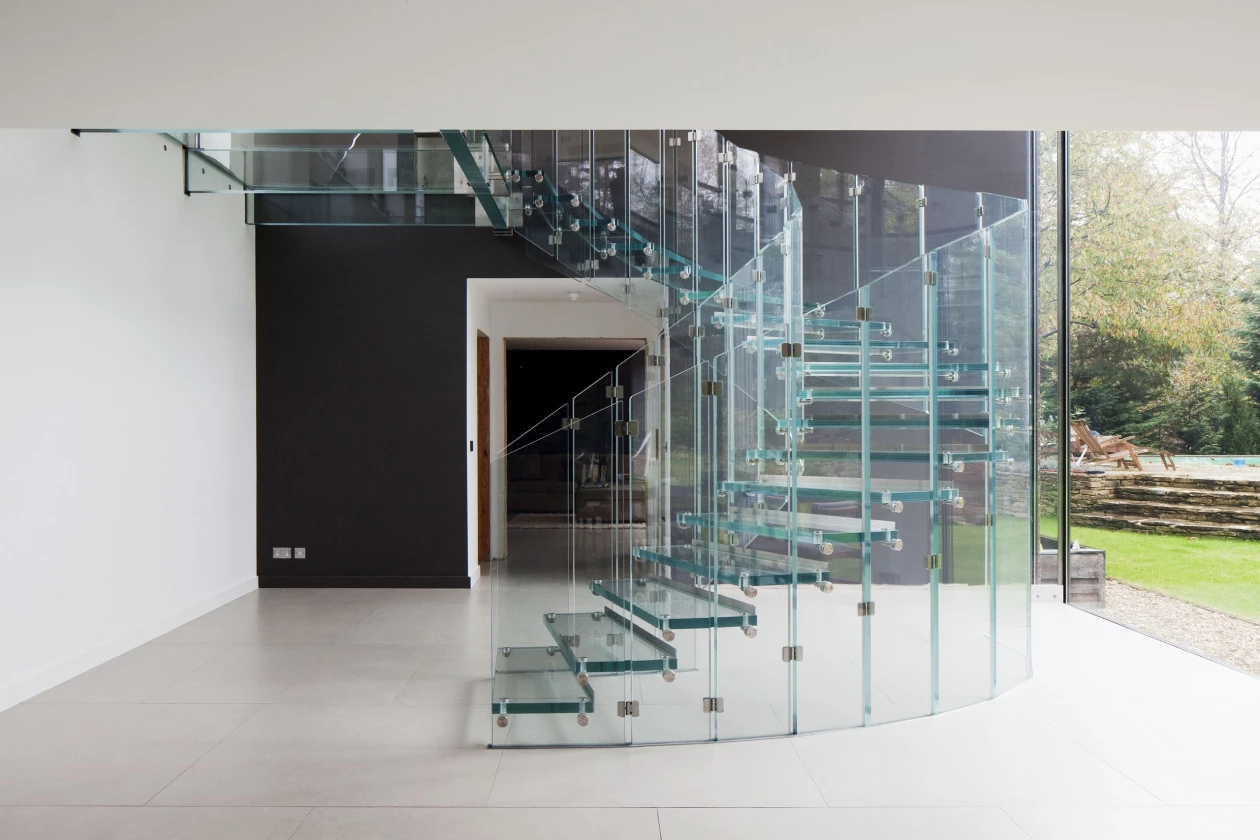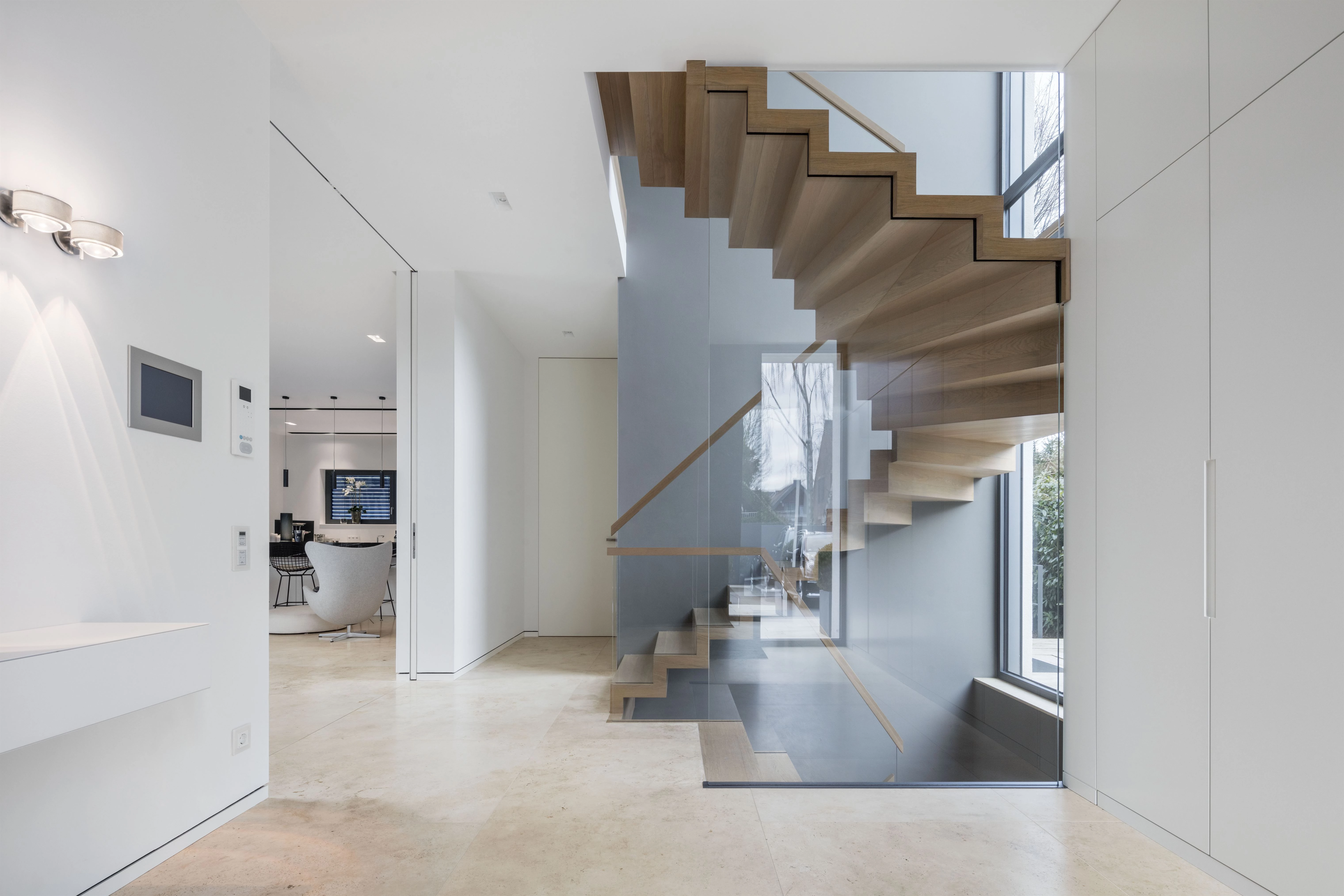 A modern interior features a wooden staircase with glass railings, a polished concrete floor, and a patterned wall, with natural light streaming in from large windows.