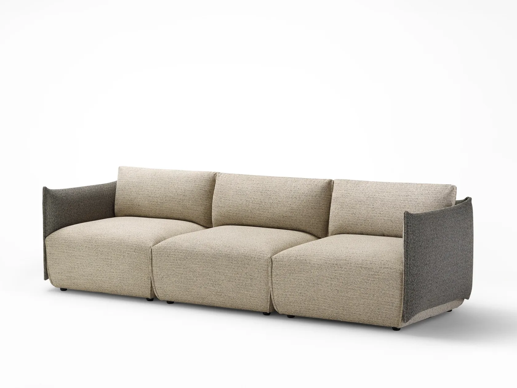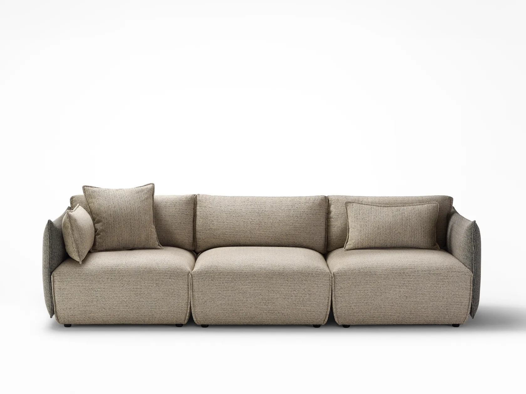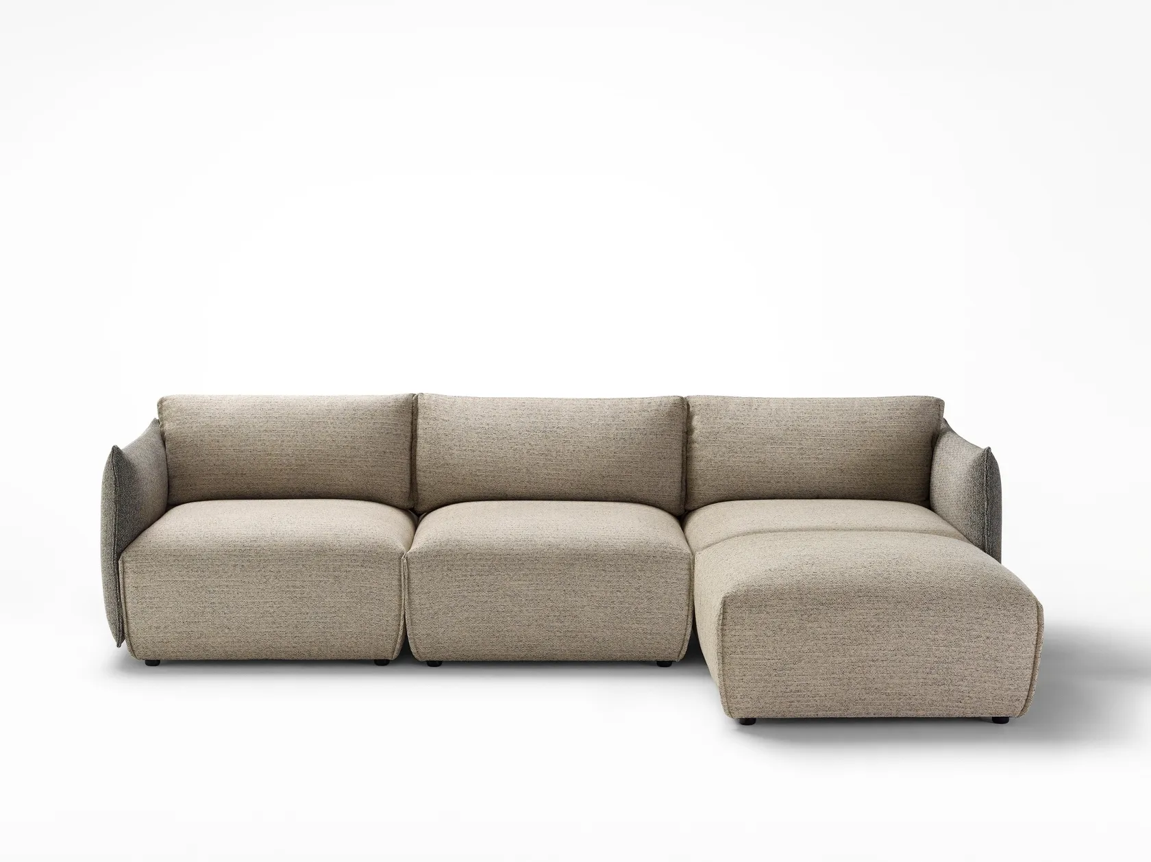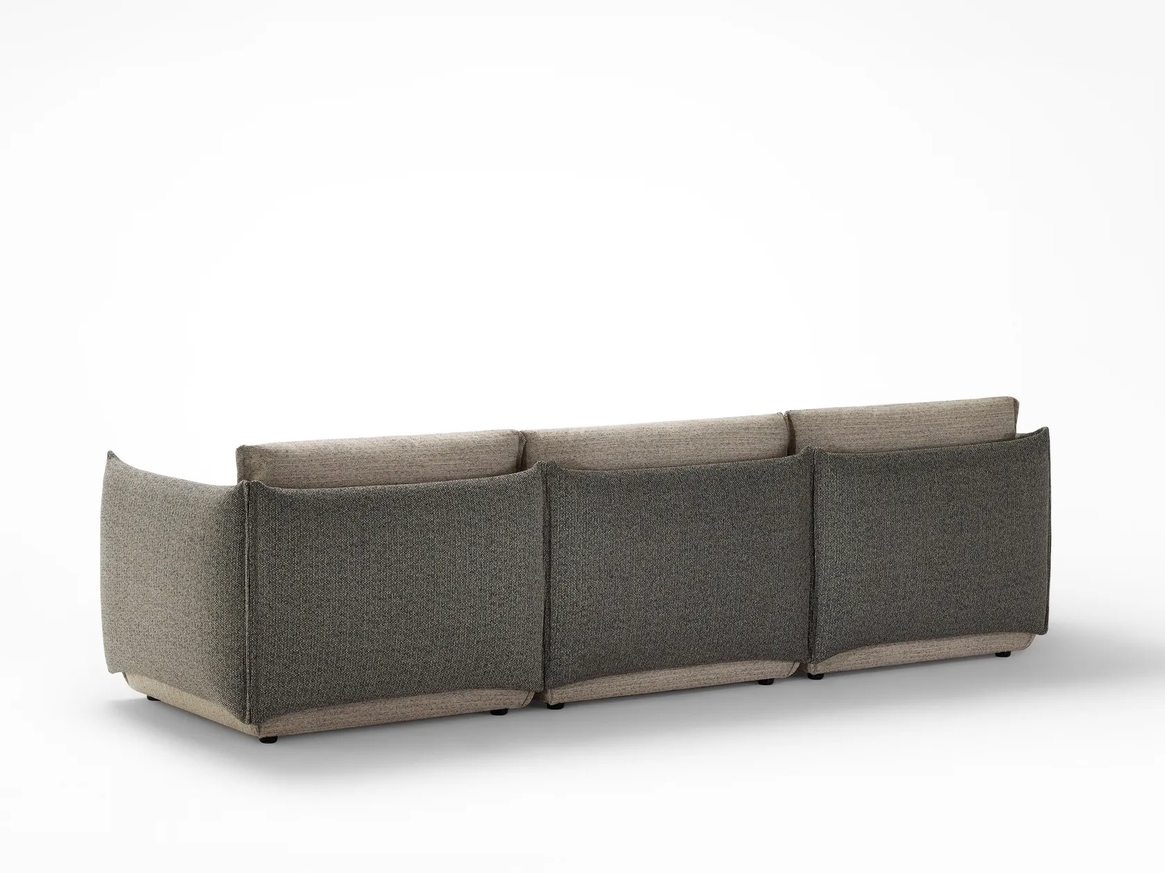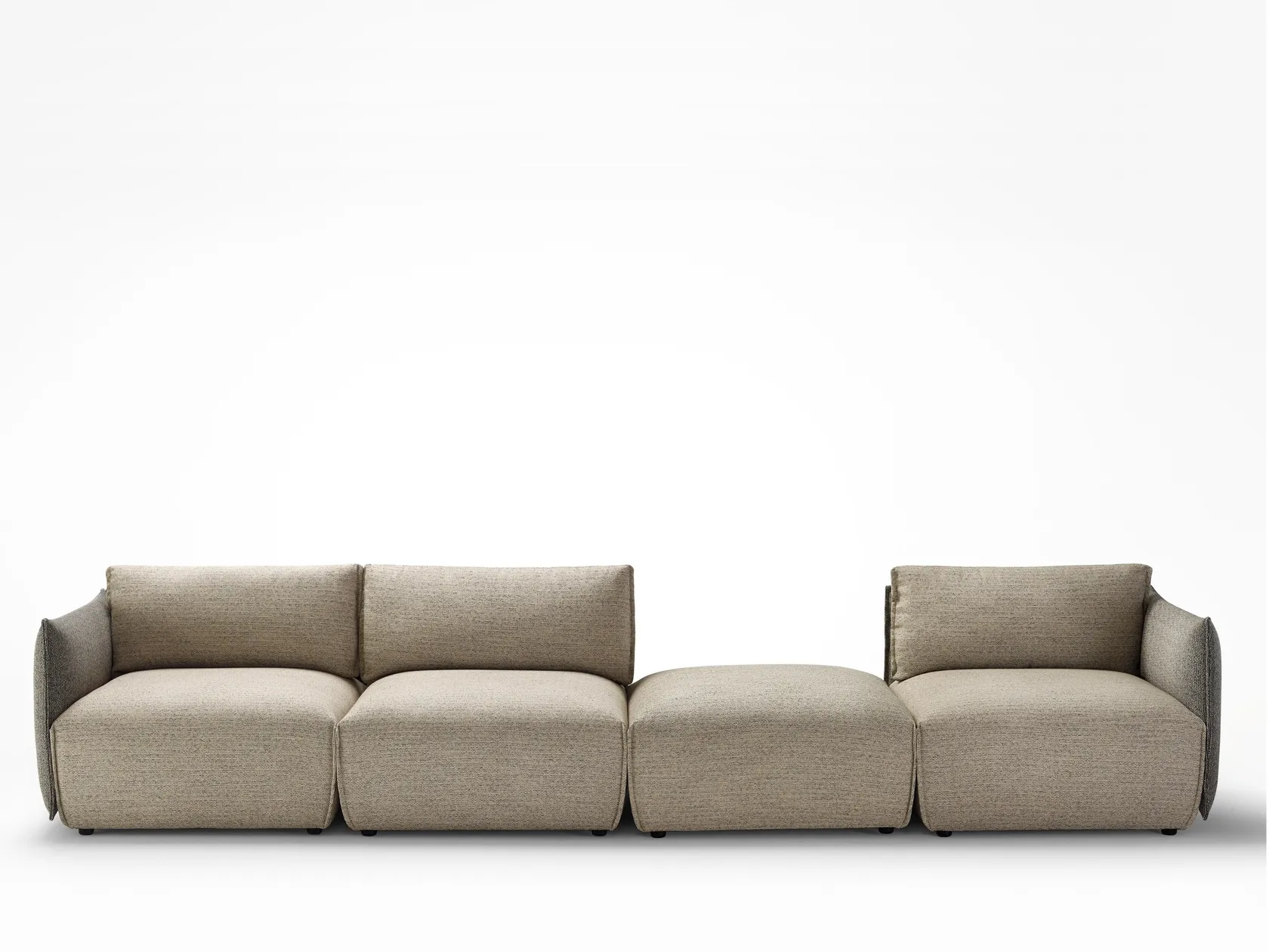 A modular sofa with a light gray fabric covering, featuring a low profile and rounded edges, consisting of multiple seating sections.