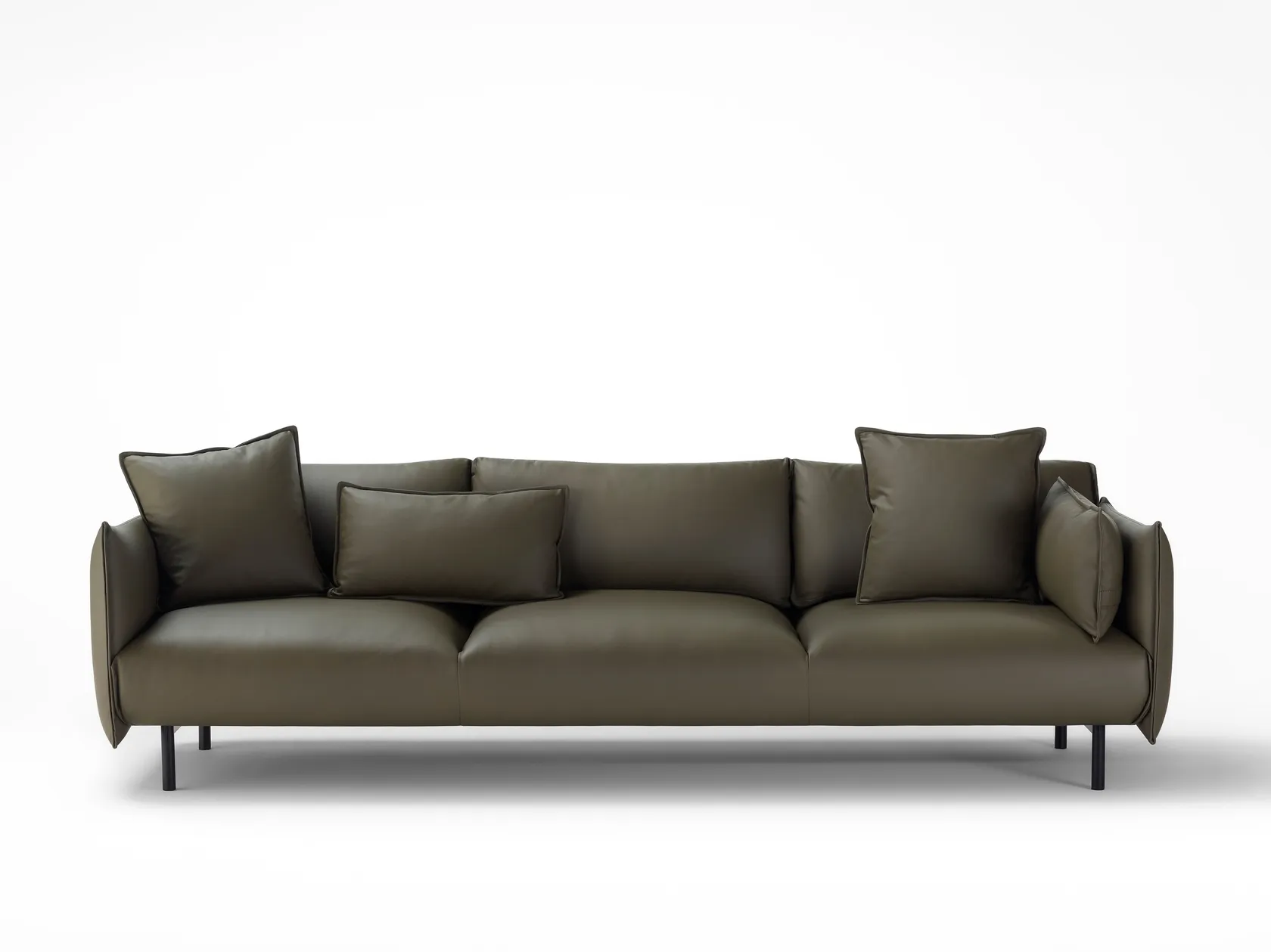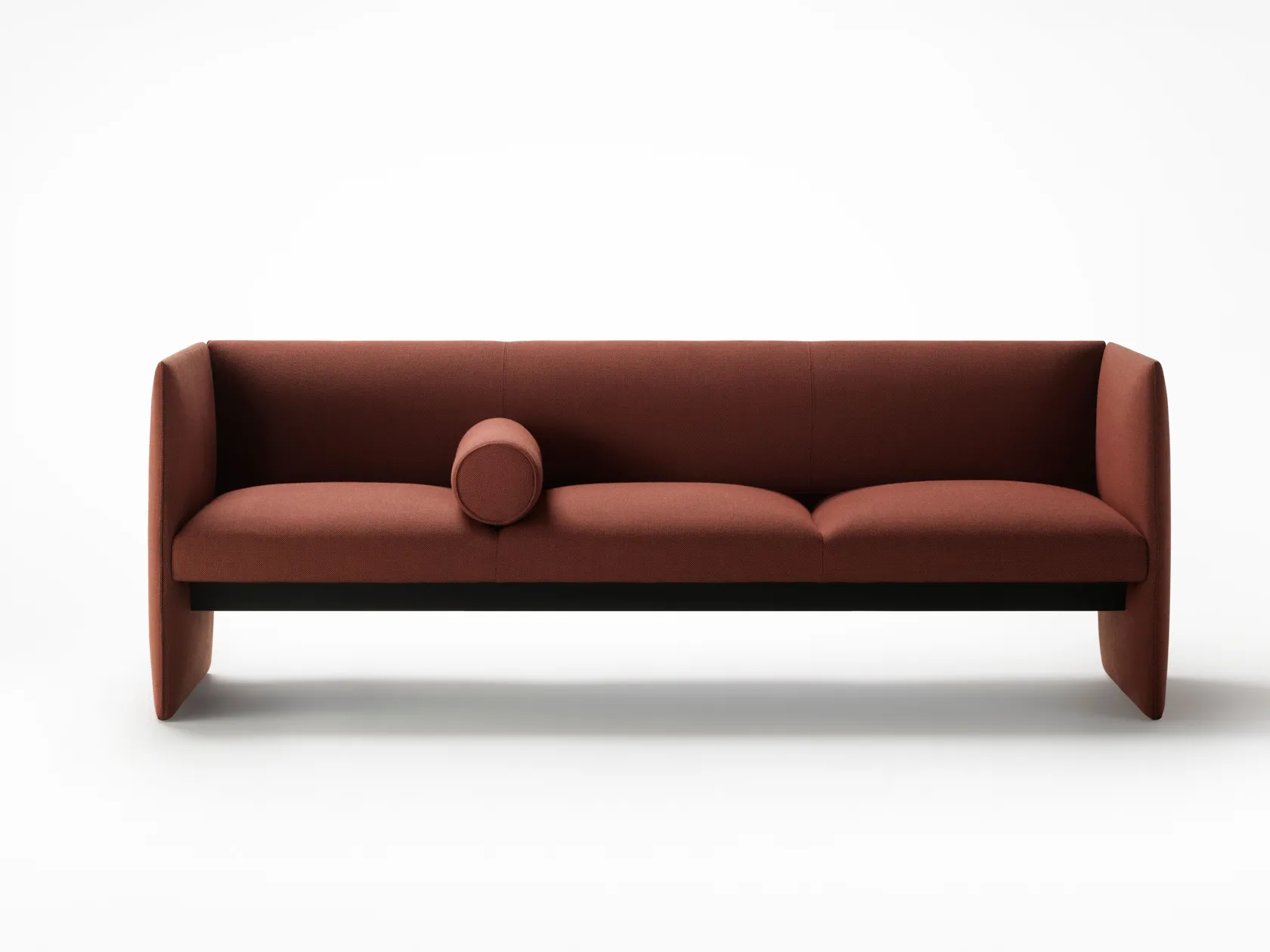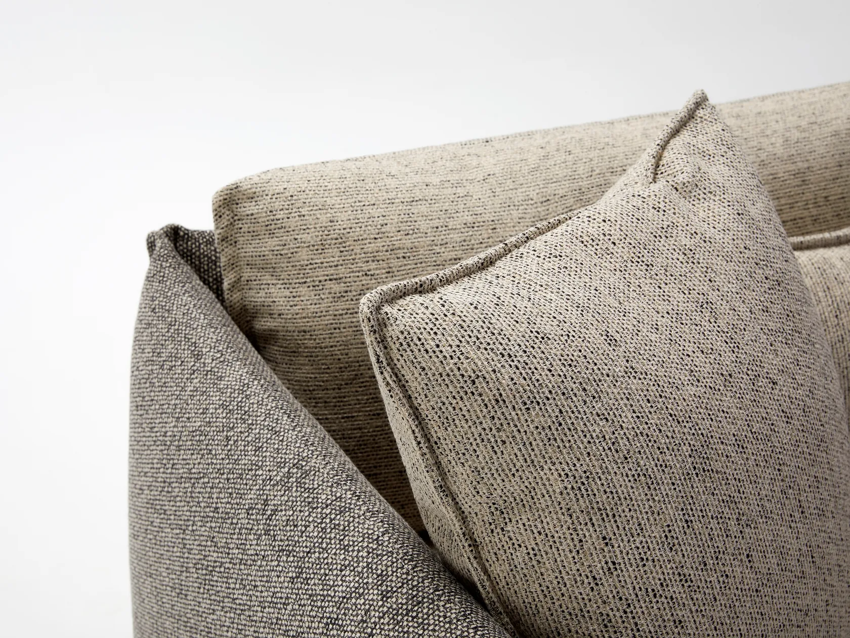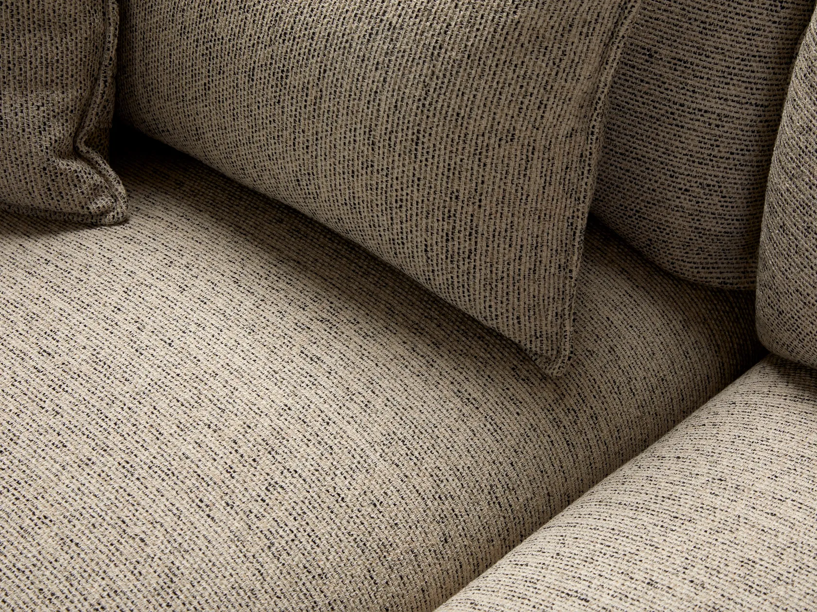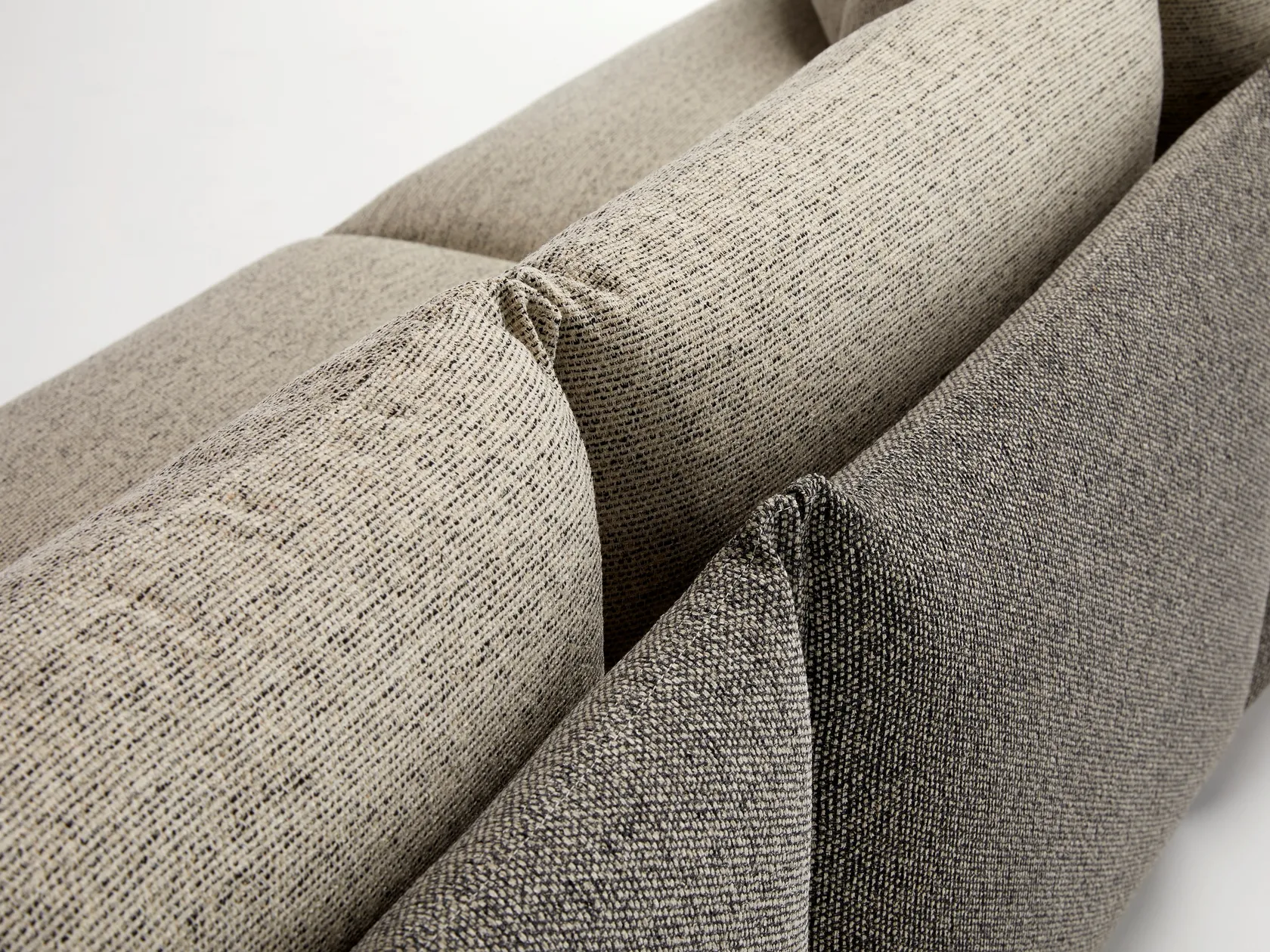 A modular sofa with a light gray fabric covering, featuring a low profile and rounded edges, consisting of multiple seating sections.