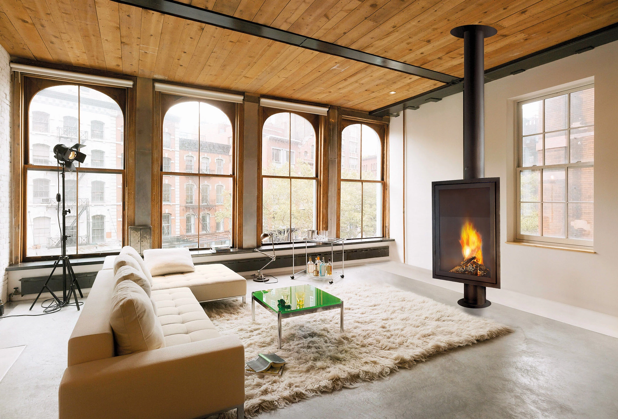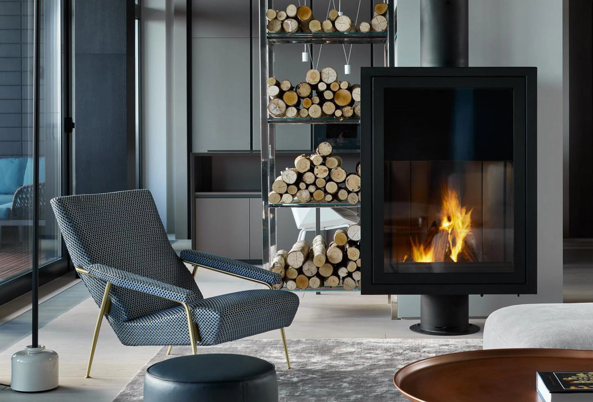 A modern living room featuring a blue sofa, wooden dining table, black fireplace, hanging red chair, large television, and a plant.