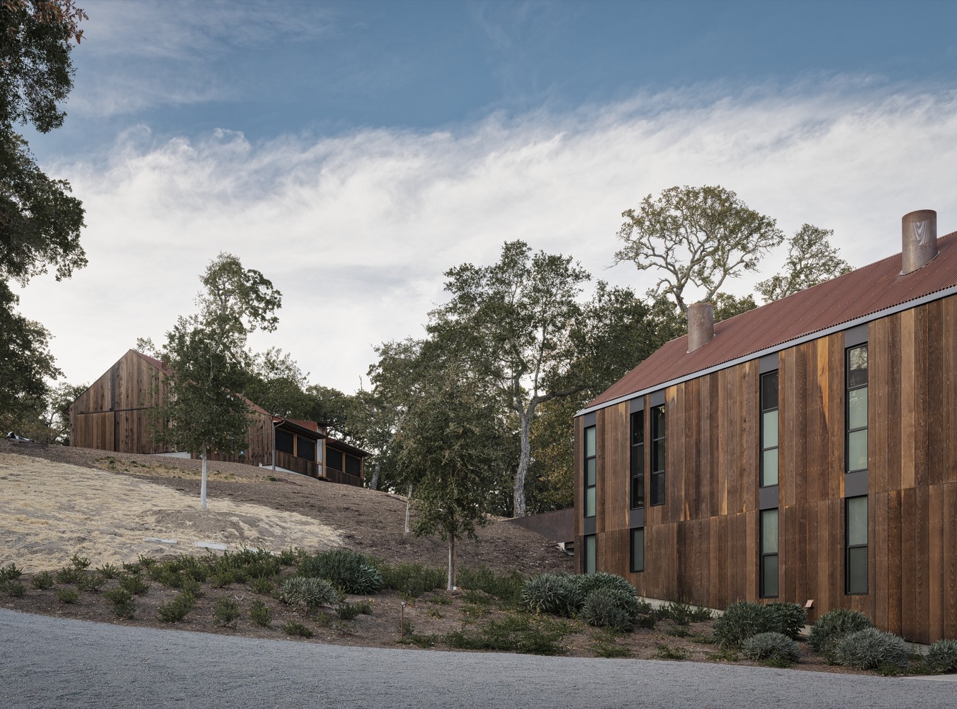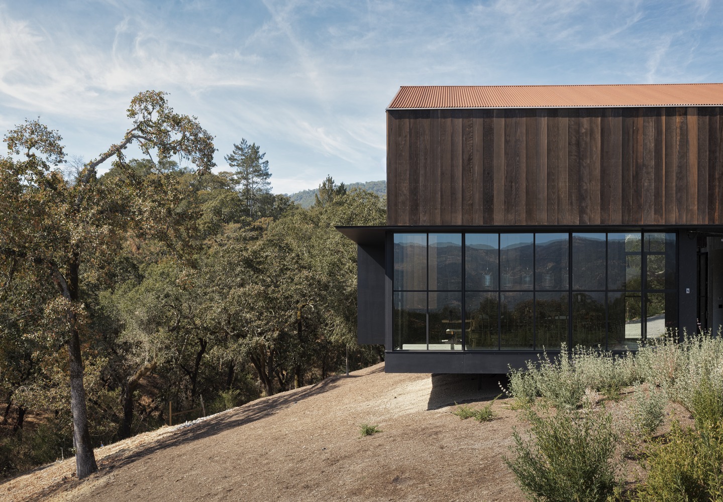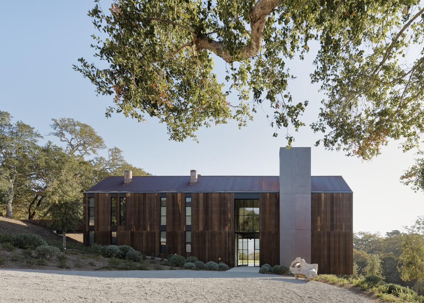 The material palette reinforces Big Barn’s narrative of simplicity and authenticity. Reclaimed redwood, corrugated Corten steel, and black steel sash windows give form to a restrained exterior, while California oak unifies floors, walls, and ceilings inside, imparting warmth and tactile richness. Radiant heated floors and enhanced insulation, combined with efficient mechanical systems, reduce energy use and contribute to a comfortable environment year-round.