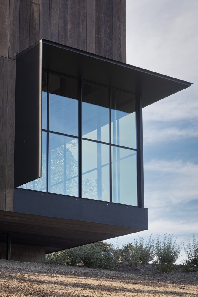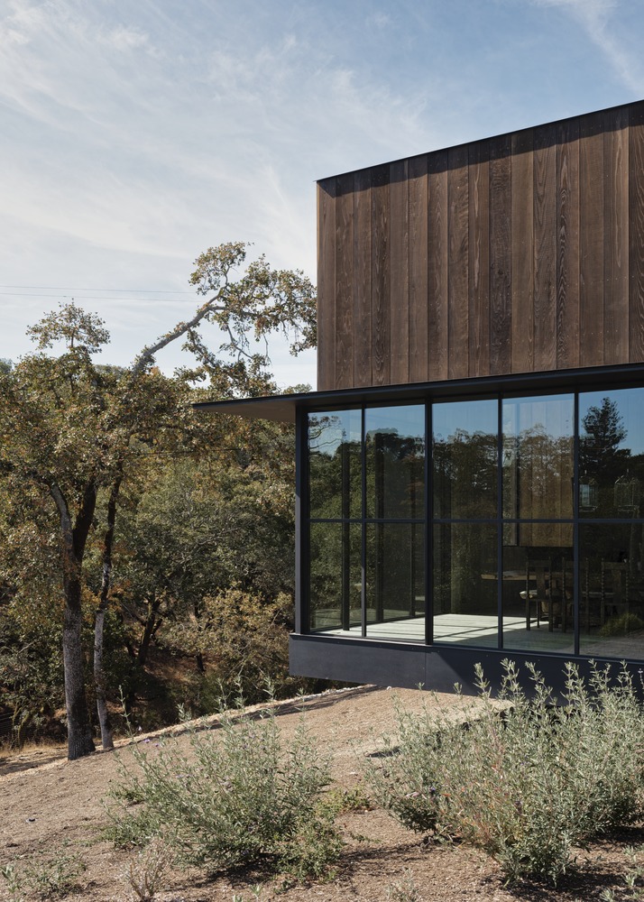 A continuous, building-sized assembly of steel sash glazing runs along the east side of the house, opening living spaces to expansive vistas of rolling oak-covered hills and inviting morning light into the interior. These large sliding doors seamlessly connect the kitchen and communal spaces to an outdoor terrace, deepening the relationship between interior and exterior and supporting a lifestyle that is both connected to nature and oriented toward retreat.
