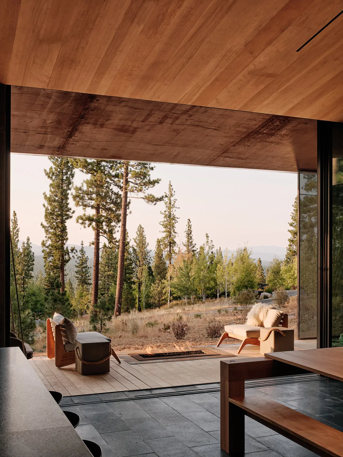 CAMPout is an exquisitely considered family retreat by Faulkner Architects situated near Lake Tahoe in the Sierra Nevada mountains of northern California, where the landscape — steep slopes, towering Jeffrey and sugar pines, and proximity to Martis Valley — informs every design decision. Conceived for a San Francisco family with a passion for mountaineering and outdoor life, this 3,800 sq ft residence delicately balances protection, privacy, and panoramic views within a context increasingly defined by wildfire risk.
