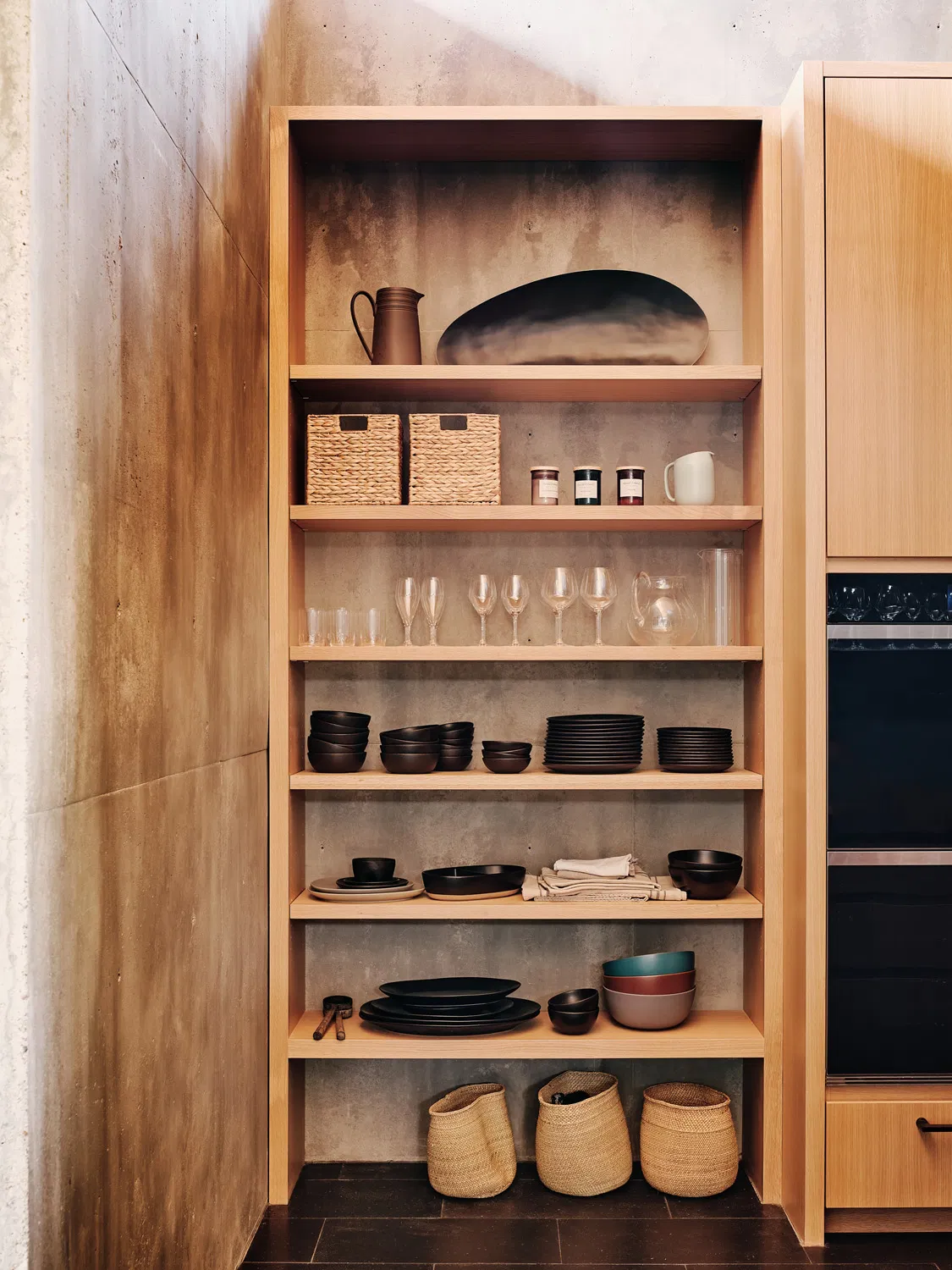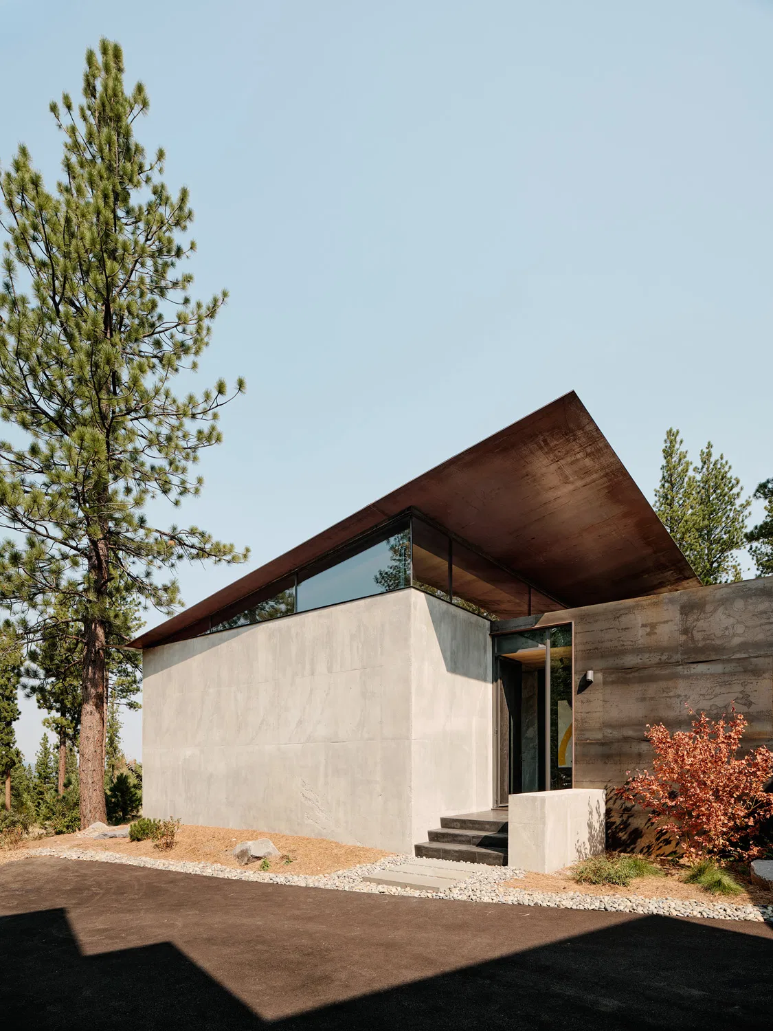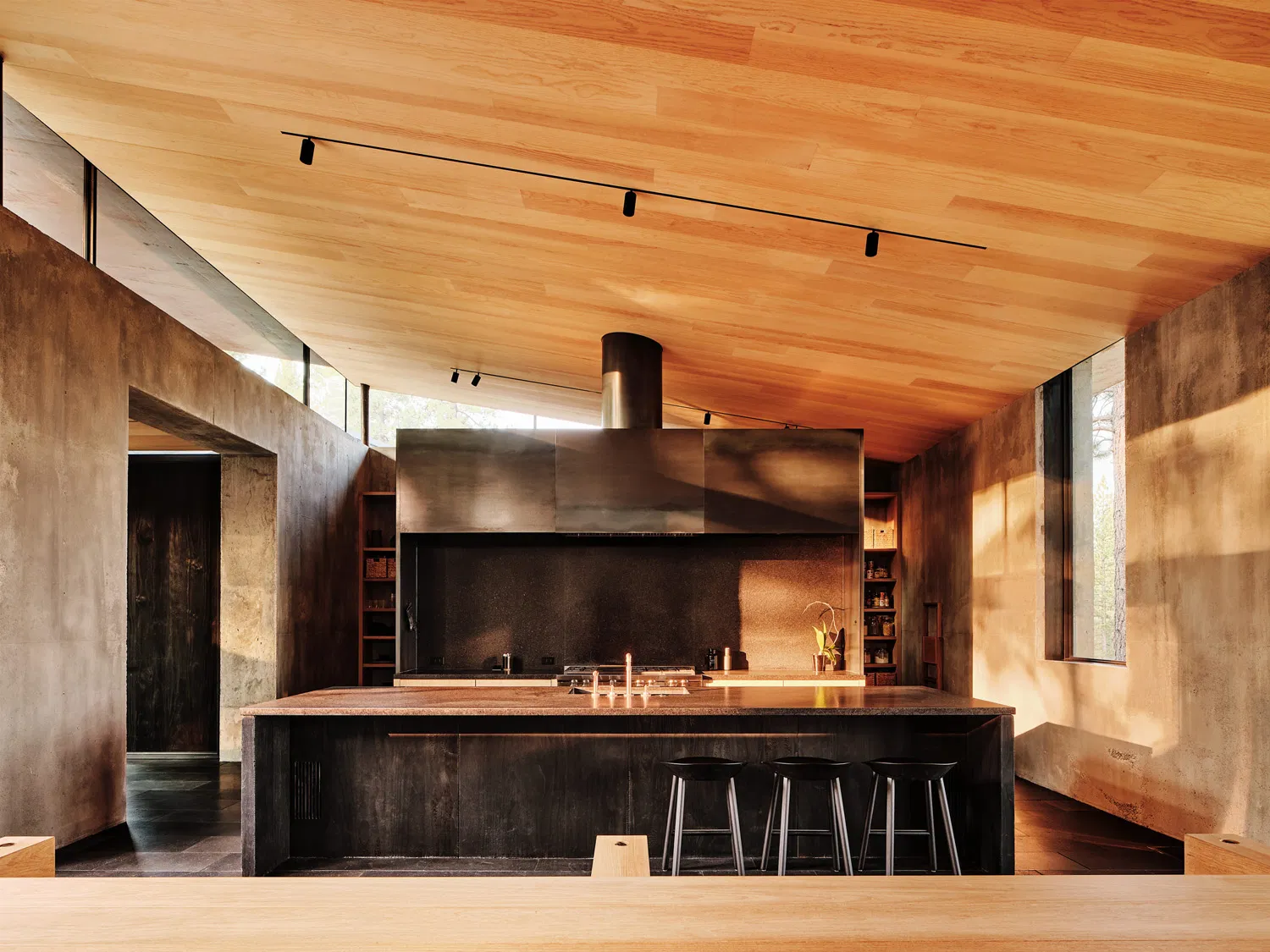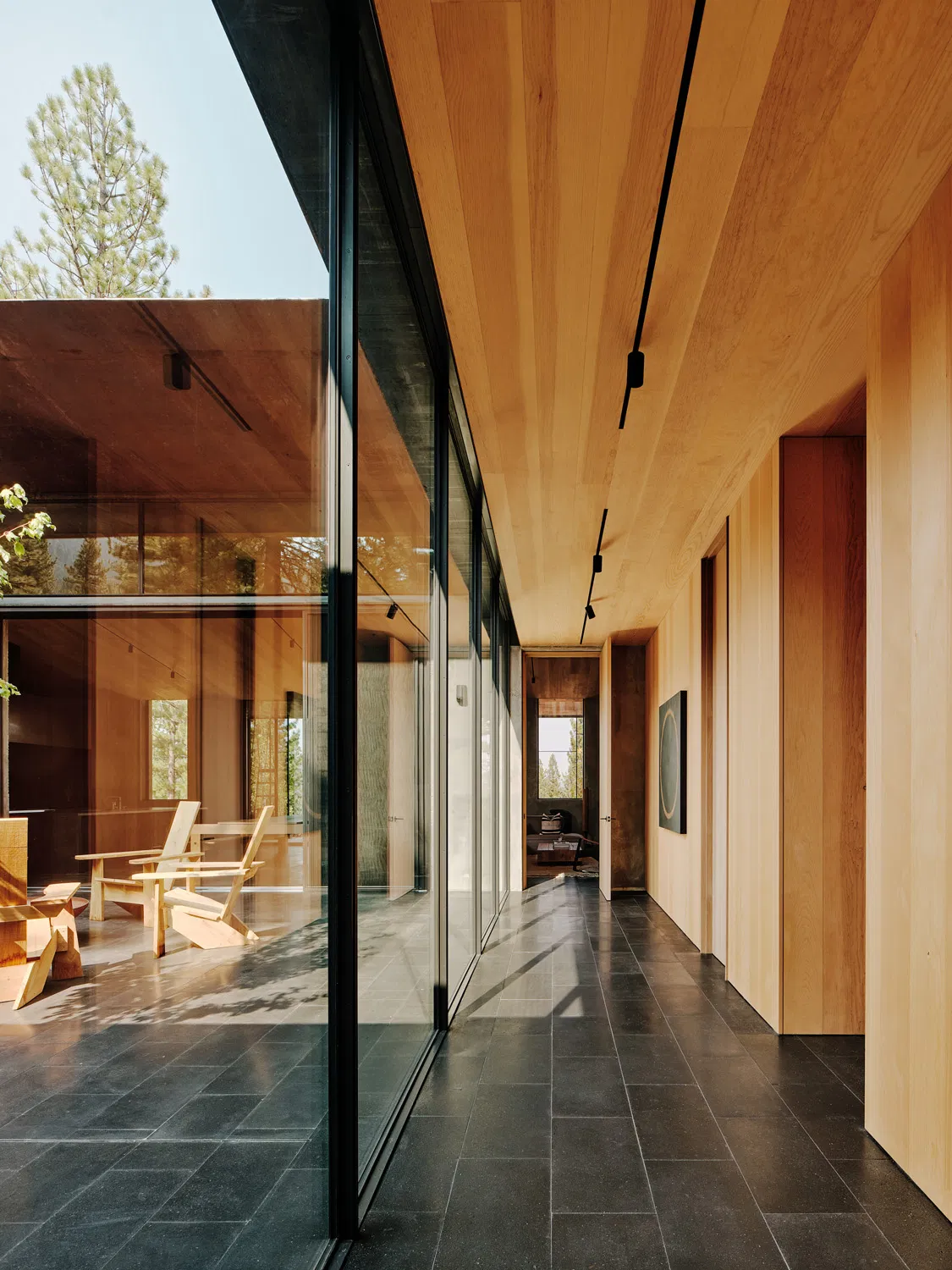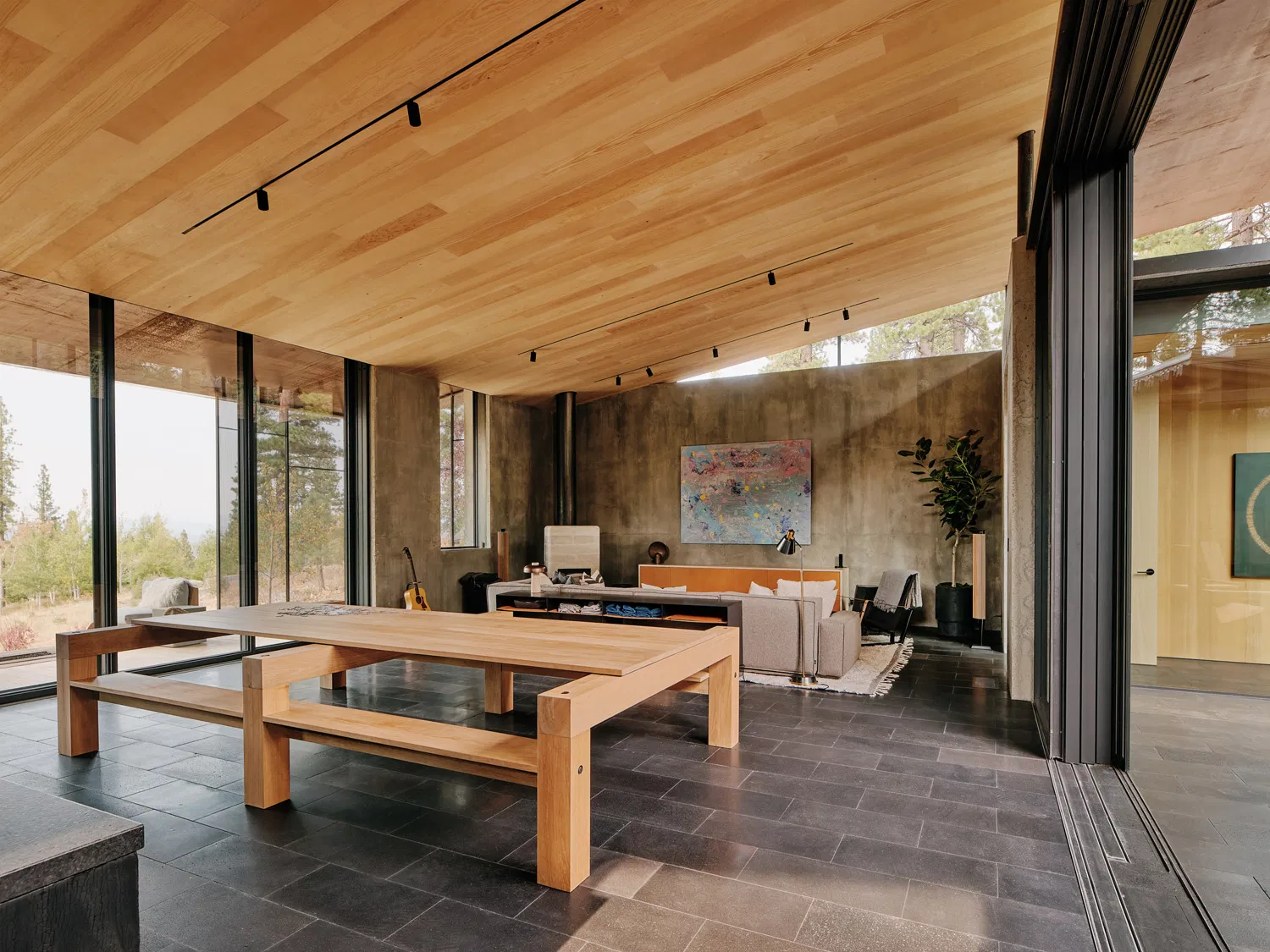 Materiality is deeply tied to site realities. The palette draws from basalt boulders and pine needles of the forest floor, expressed through basalt flooring and concrete walls that resonate with the natural terrain. Native cedar interiors, left unfinished to celebrate their organic character, and blackened steel casework further unify the home with its wooded setting. Such consistency in material deployment instills a calmness throughout the assemblage and reinforces the architecture’s holistic connection to place.