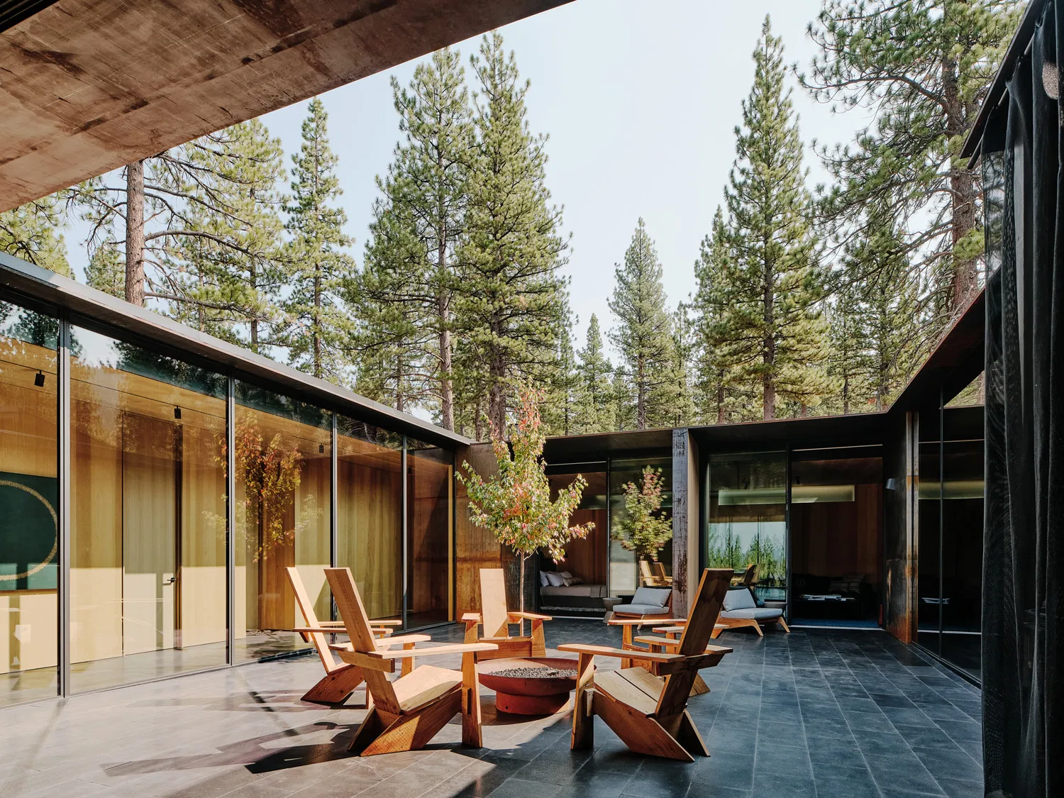 The architectural strategy at CAMPout is rooted in contextual responses: glazing is judiciously limited at the combustible periphery to enhance fire resistance while maximized facing the protected courtyard, creating a secure yet luminous interior environment. A slender steel shed roof tilts upward, capturing southern light and views of adjacent ski runs, while insulated concrete walls and laminated steel sash windows form a robust shell that confronts climate forces with resilience.