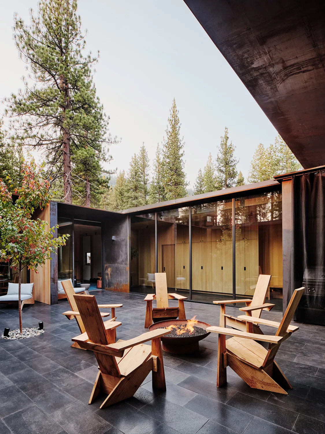 Beyond shelter, CAMPout embodies a shelter-like experience that evokes camping in the wilderness — a design metaphor where built form and landscape coexist. Its configuration around a fire-lit courtyard offers a focal space for family life, recalling the essence of communal gathering amid nature. And while engineered for safety and durability in a region challenged by wildfire threats, the project never sacrifices spatial richness, lightness of presence, or the emotional quality that makes it a restorative refuge.