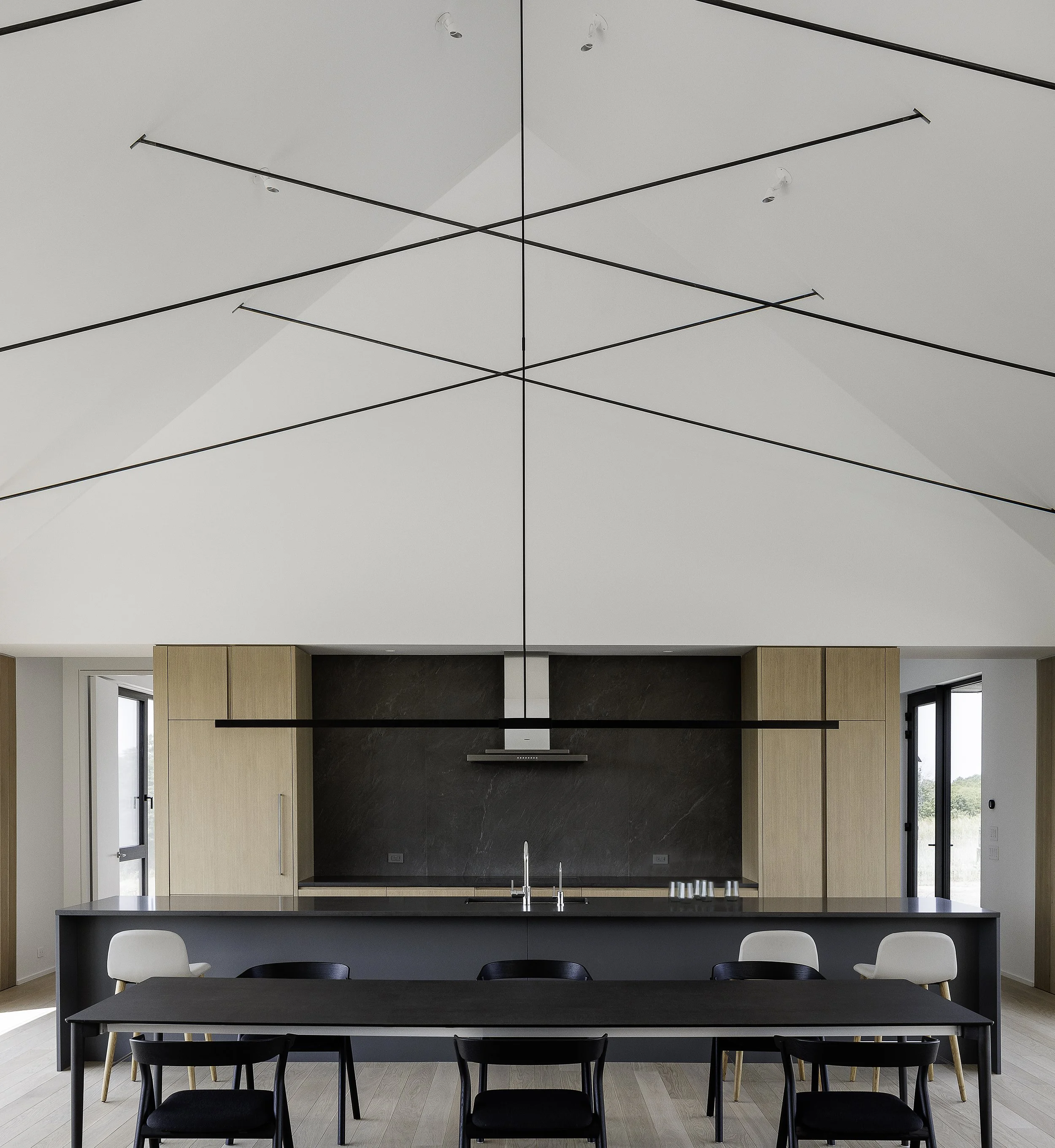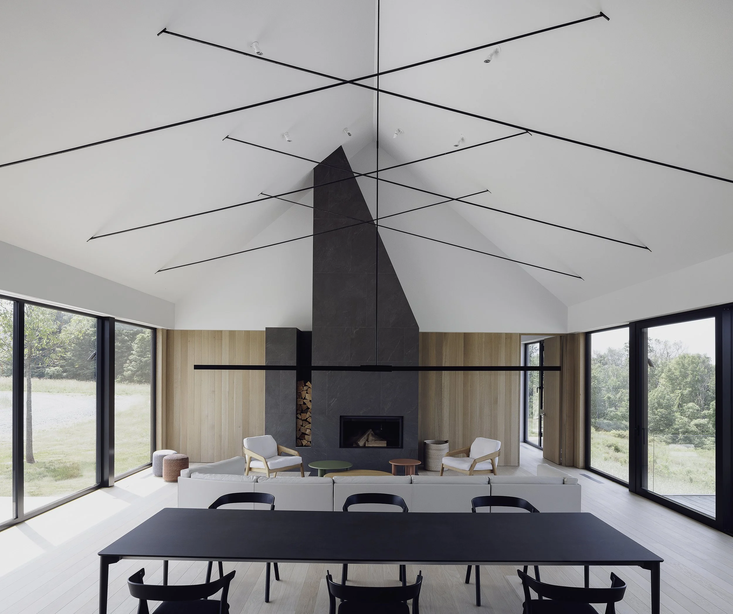 The architectural language references the agricultural heritage of the region while presenting a contemporary interpretation. The building’s form draws inspiration from traditional barns commonly found across rural New York. Inside the main living area, this concept is expressed through a vaulted interior volume. Instead of typical heavy timber barn beams, slender metal tie rods span the space, creating a lighter structural expression while emphasizing the height and openness of the room.