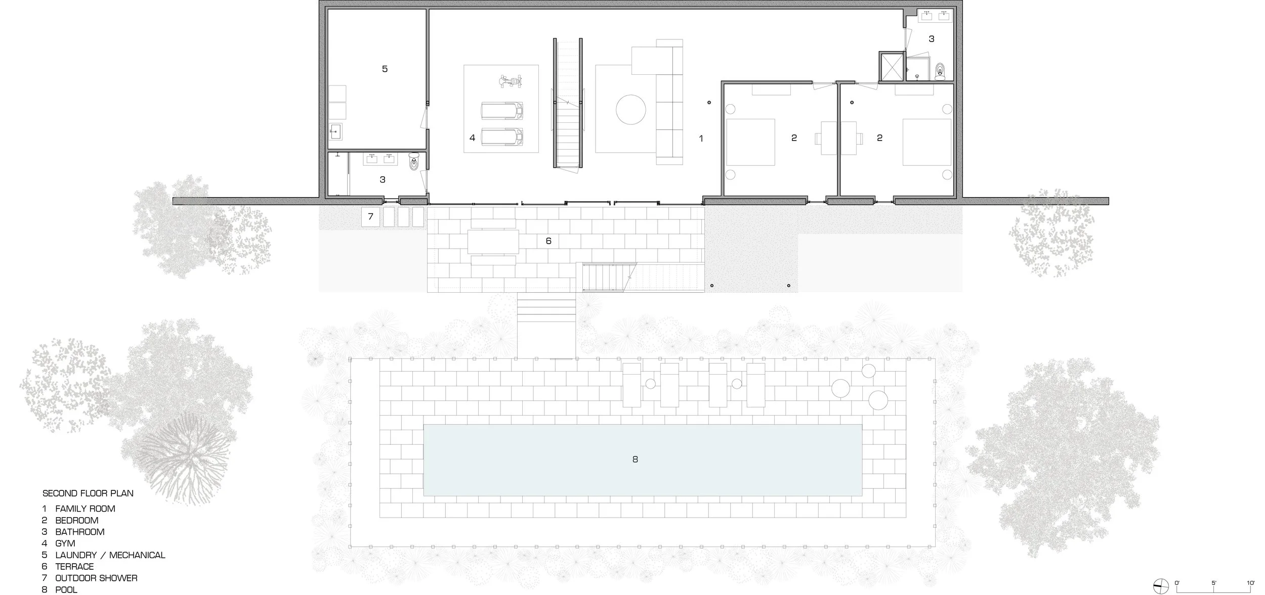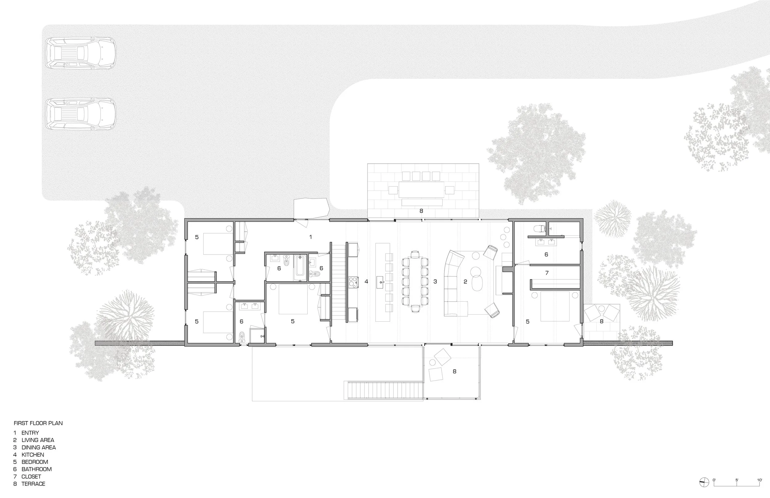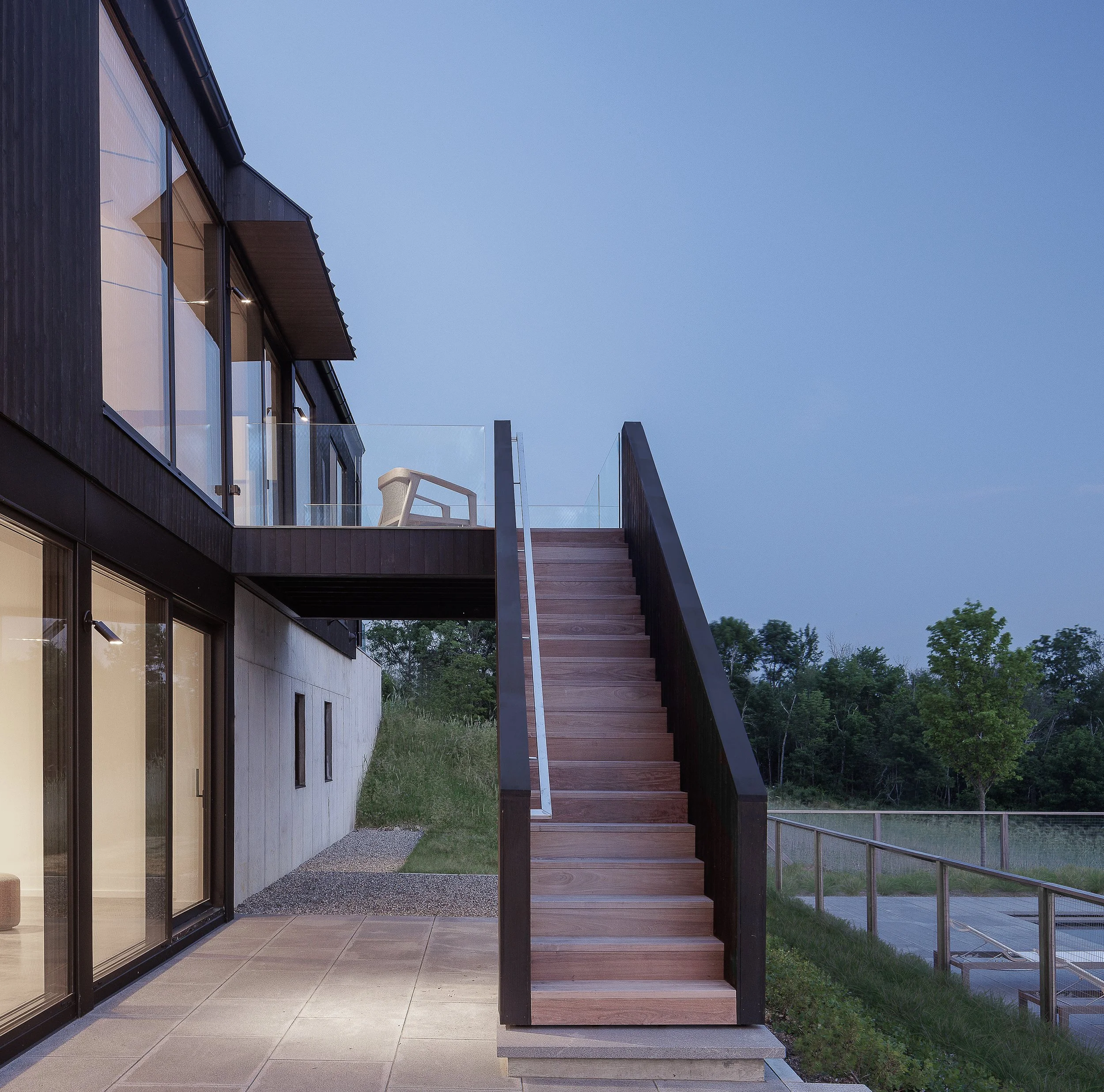 Circulation within the house runs parallel to the concrete retaining wall, creating a clear organizational spine. Along this path, carefully framed views open toward the surrounding meadow and forest landscapes. Expansive glazing on the east and west façades captures panoramic views of the rolling hills and tree canopy. Five outdoor terraces extend the living areas into the landscape—three located at the main level and two on the lower level—encouraging movement between interior and exterior spaces. A sculptural exterior stair connects the terraces and pool area, allowing fluid circulation between the home’s two levels of social space.