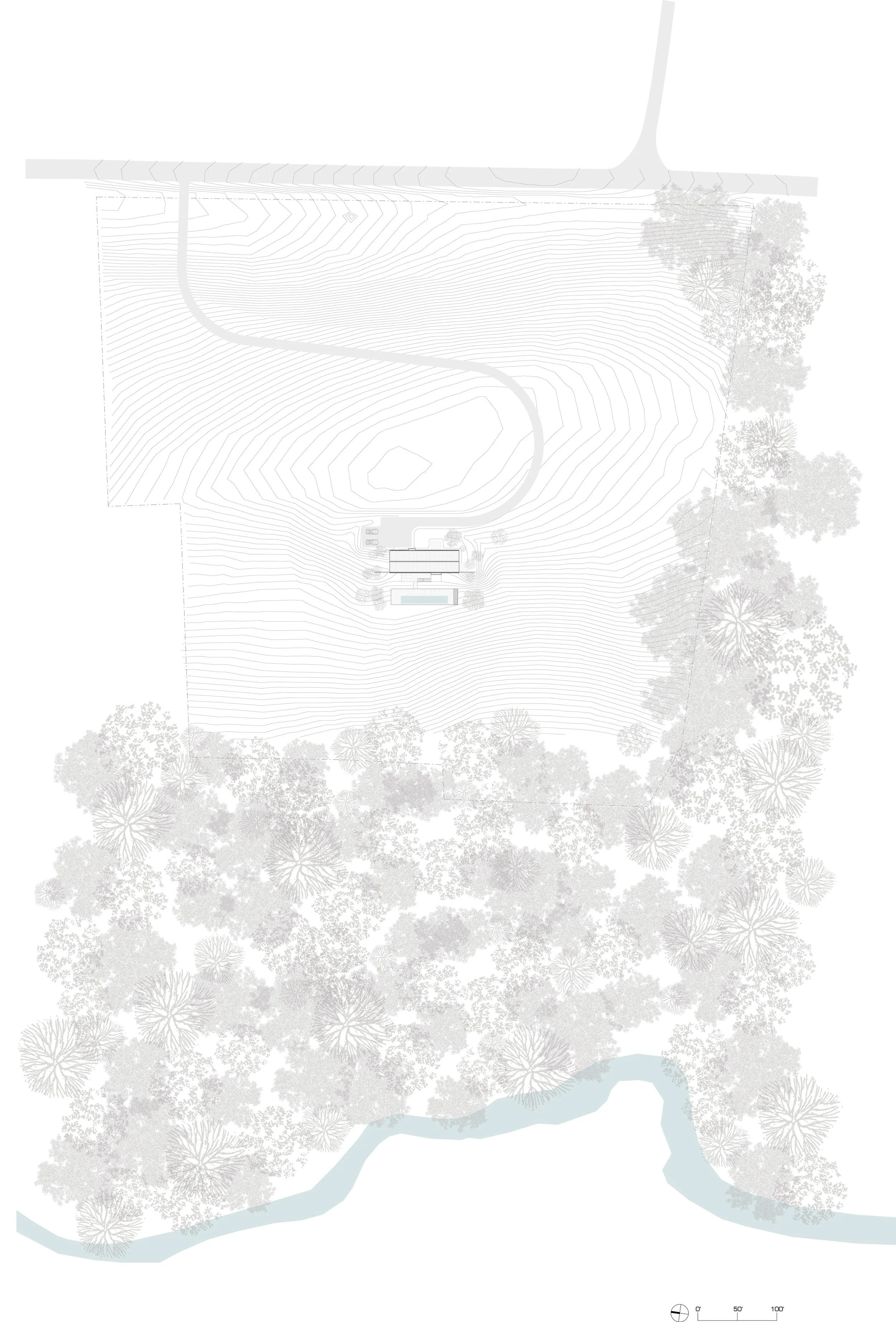Approaching the property, the gravel driveway gently curves around the crest of a grassy hill, concealing the residence from the road. Only as visitors move further into the field does the building gradually reveal itself, emerging subtly from the terrain. The house initially appears as a single-story structure, but a concrete retaining wall positioned perpendicular to the hillside allows two levels to maintain direct ground-level access to the landscape. This strategy embeds the lower level into the slope, helping stabilize interior temperatures while visually integrating the building into the rolling topography.