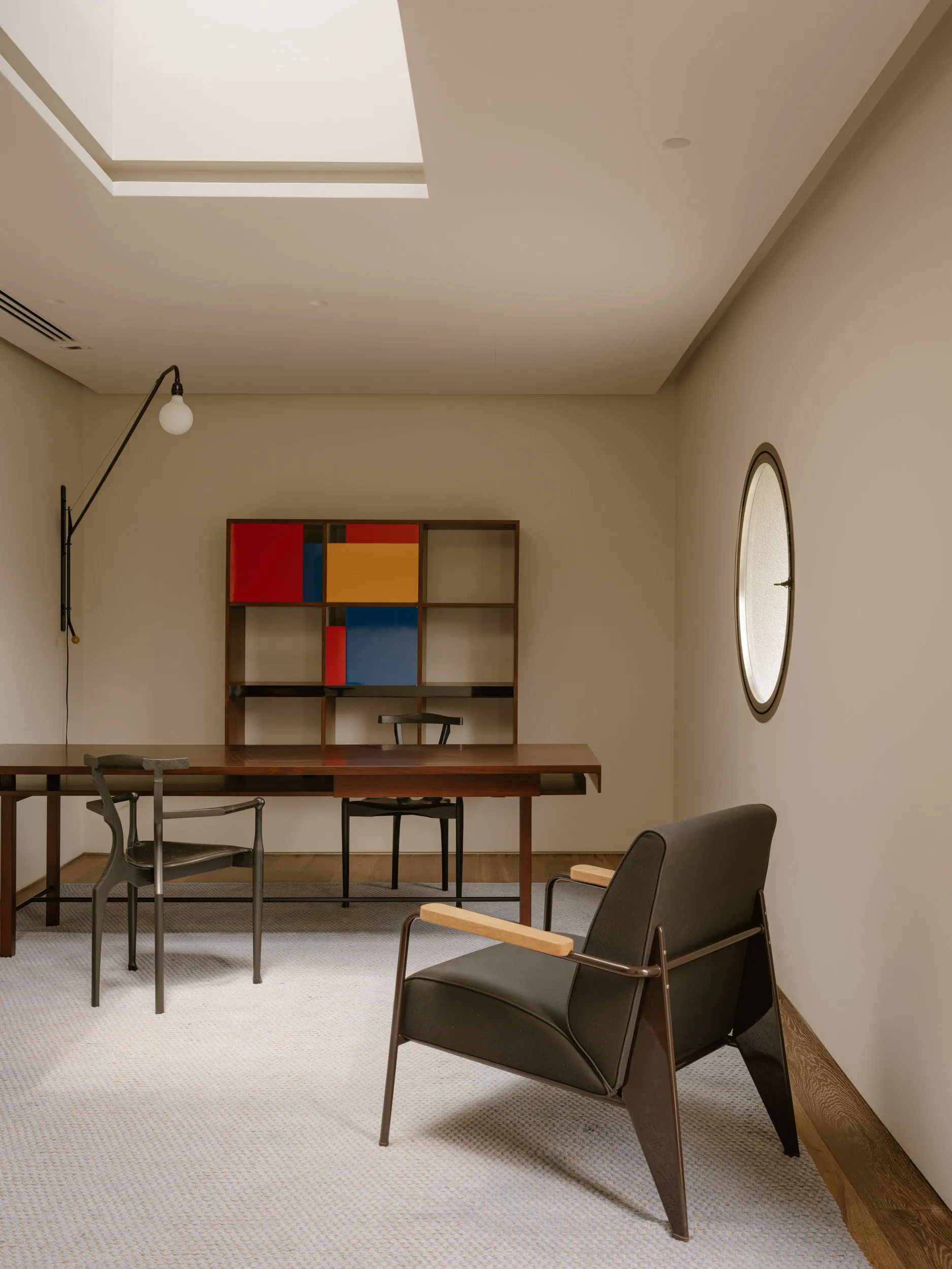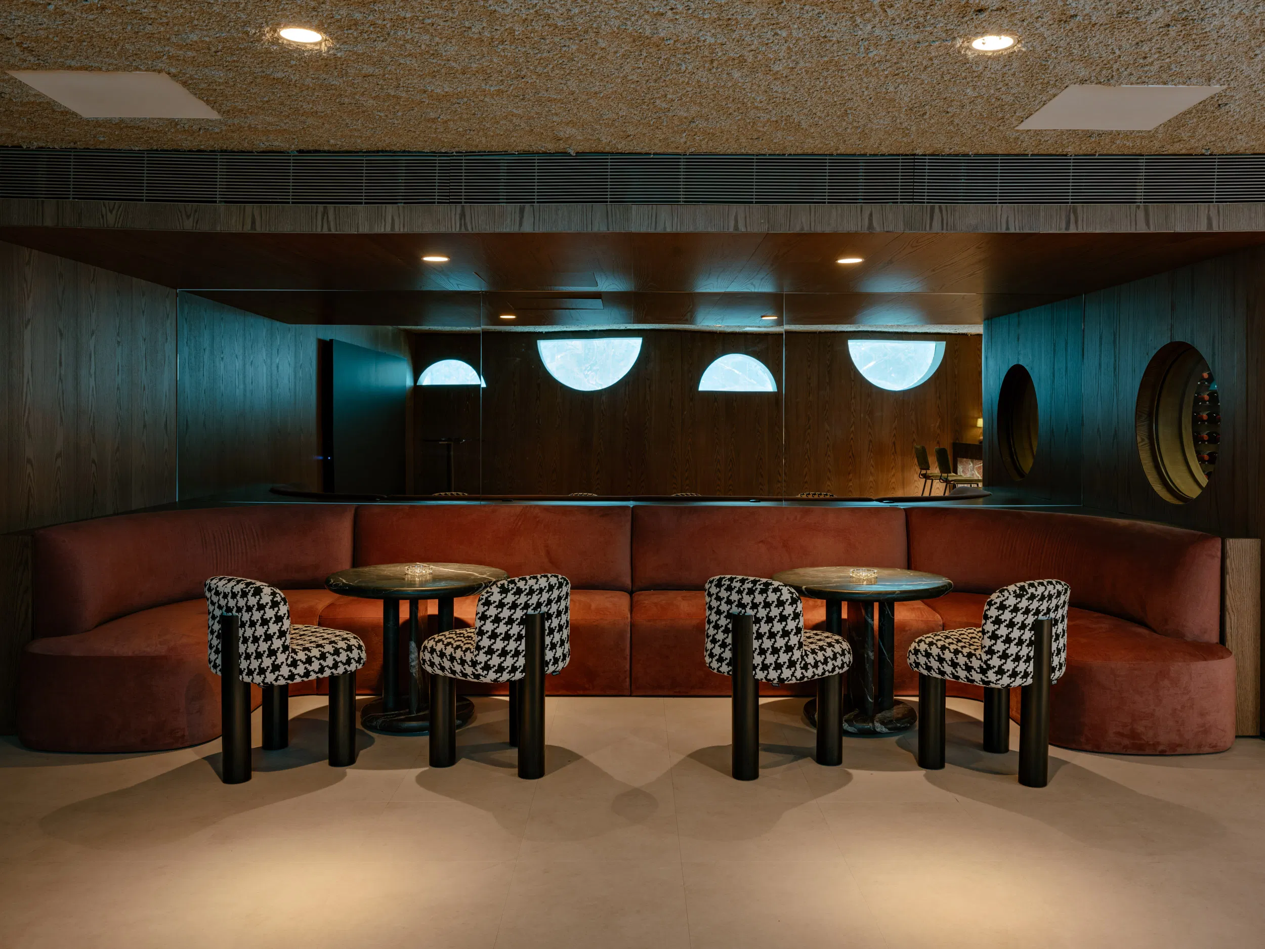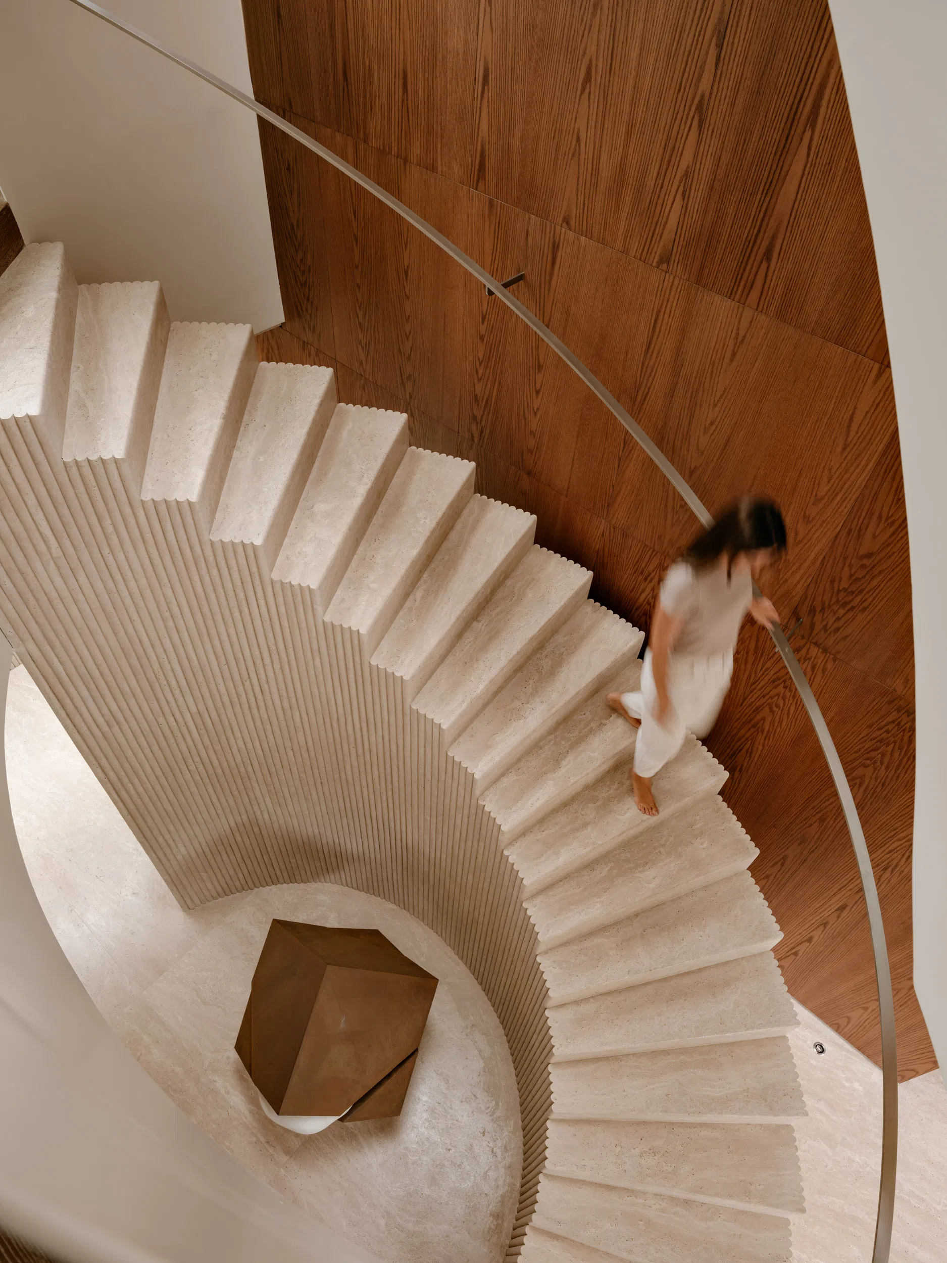 The interior atmosphere is shaped by a careful balance of natural materials and curated furnishings. Wood-clad walls, exposed stone, and filtered daylight establish warmth and texture, while contemporary furniture pieces define intimate zones for gathering and relaxation. Vertical circulation is treated as a spatial journey, illuminated by an organically shaped skylight that gradually reveals shifting perspectives as one ascends.