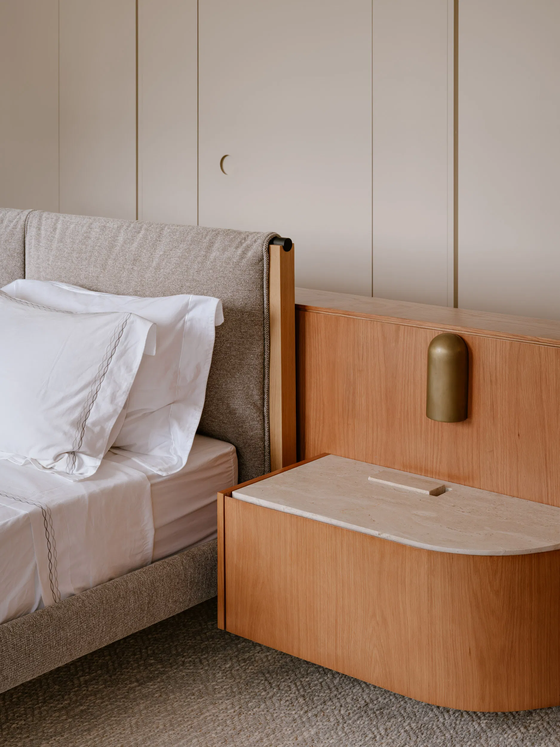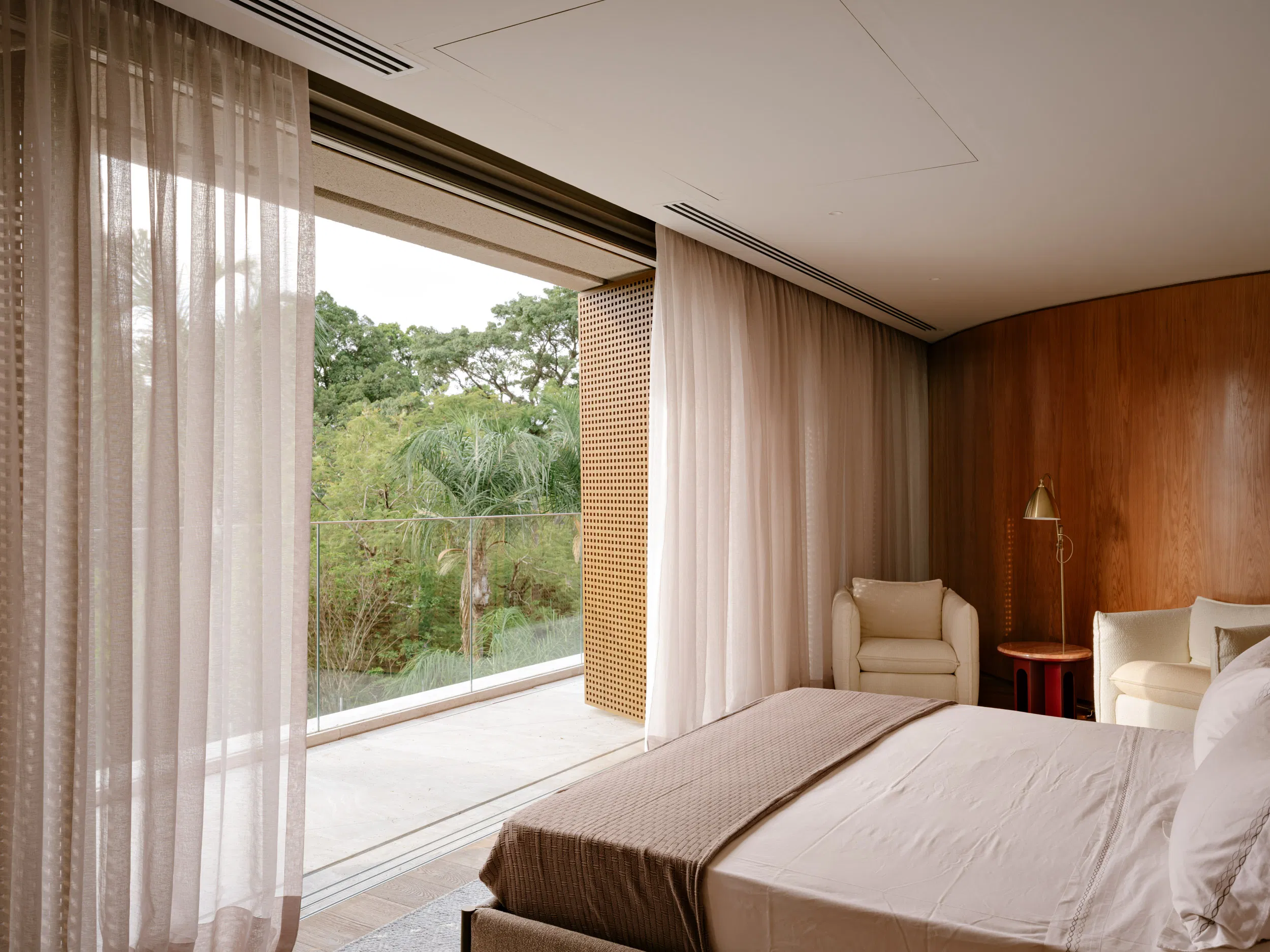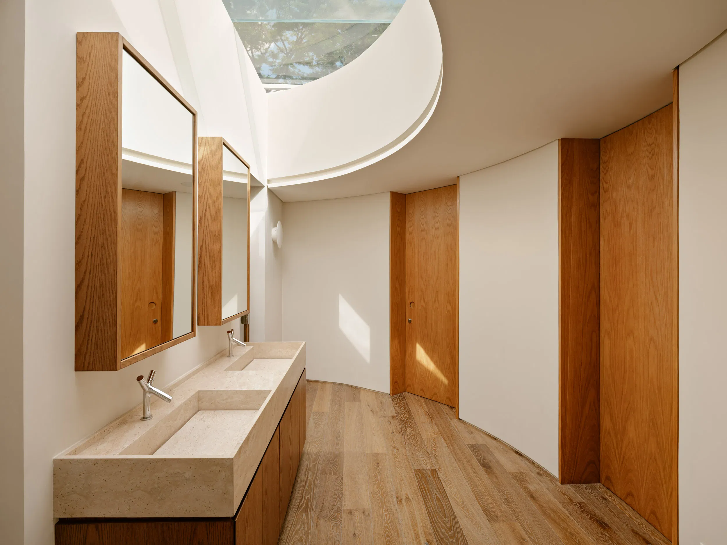 Private areas on the upper floor prioritize comfort and adaptability. Layered façade elements regulate light, acoustics, and privacy, allowing the master suite to alternate between openness and retreat. Throughout the house, natural light functions as a primary architectural material—highlighting surfaces, marking time, and reinforcing the seamless dialogue between built form and landscape.