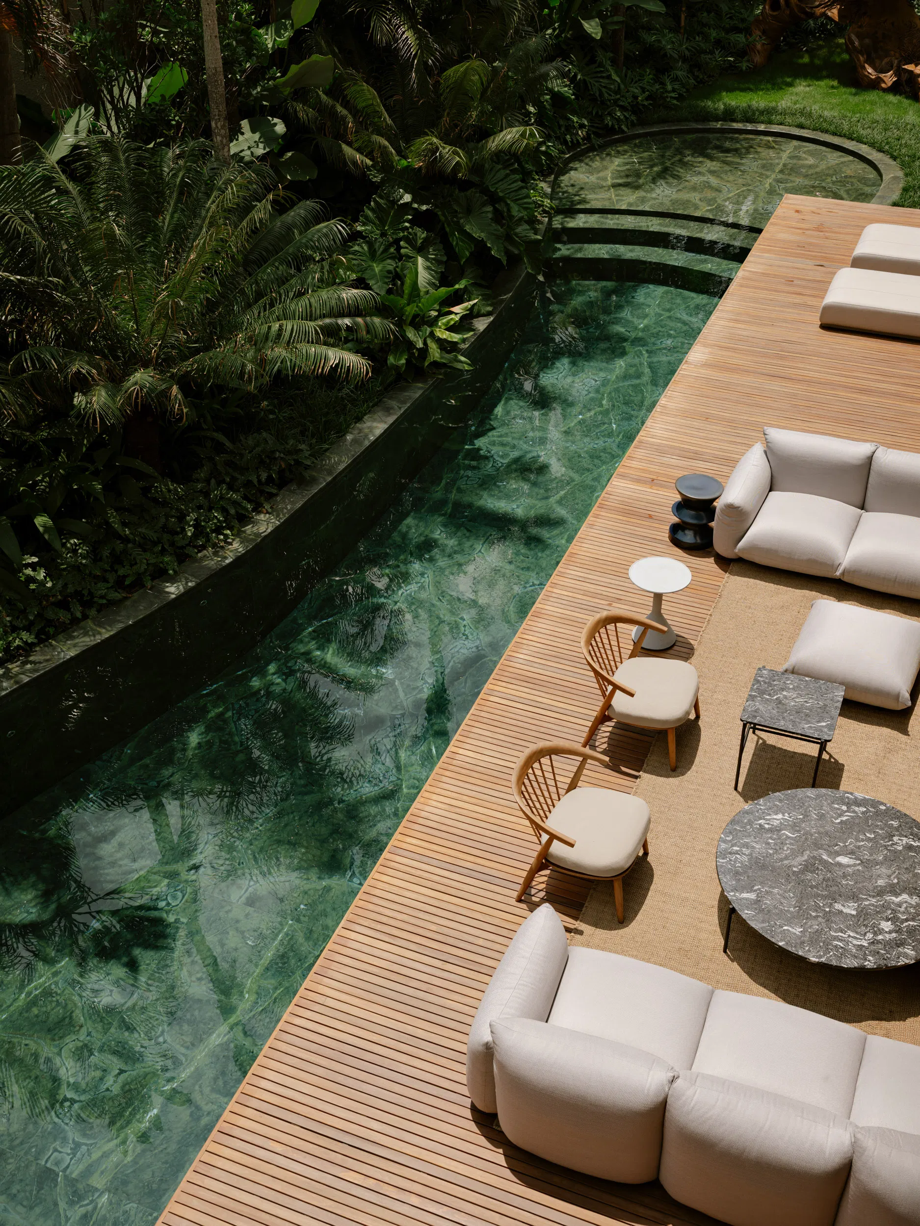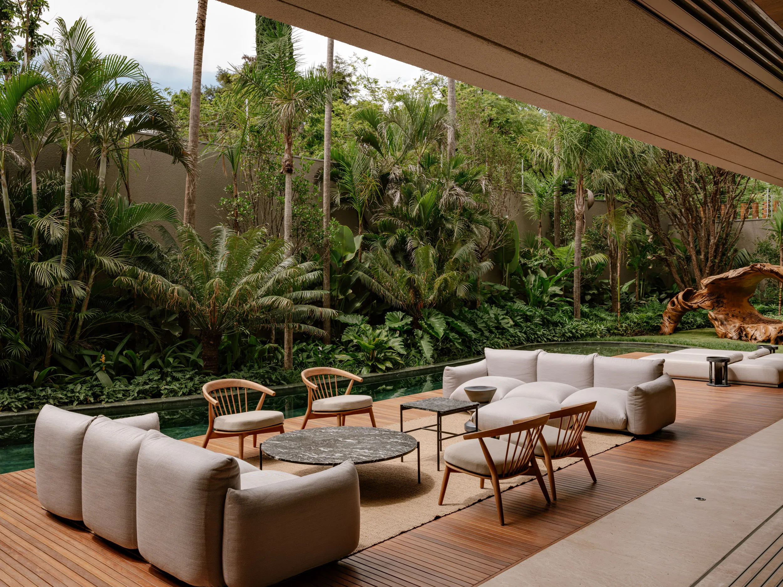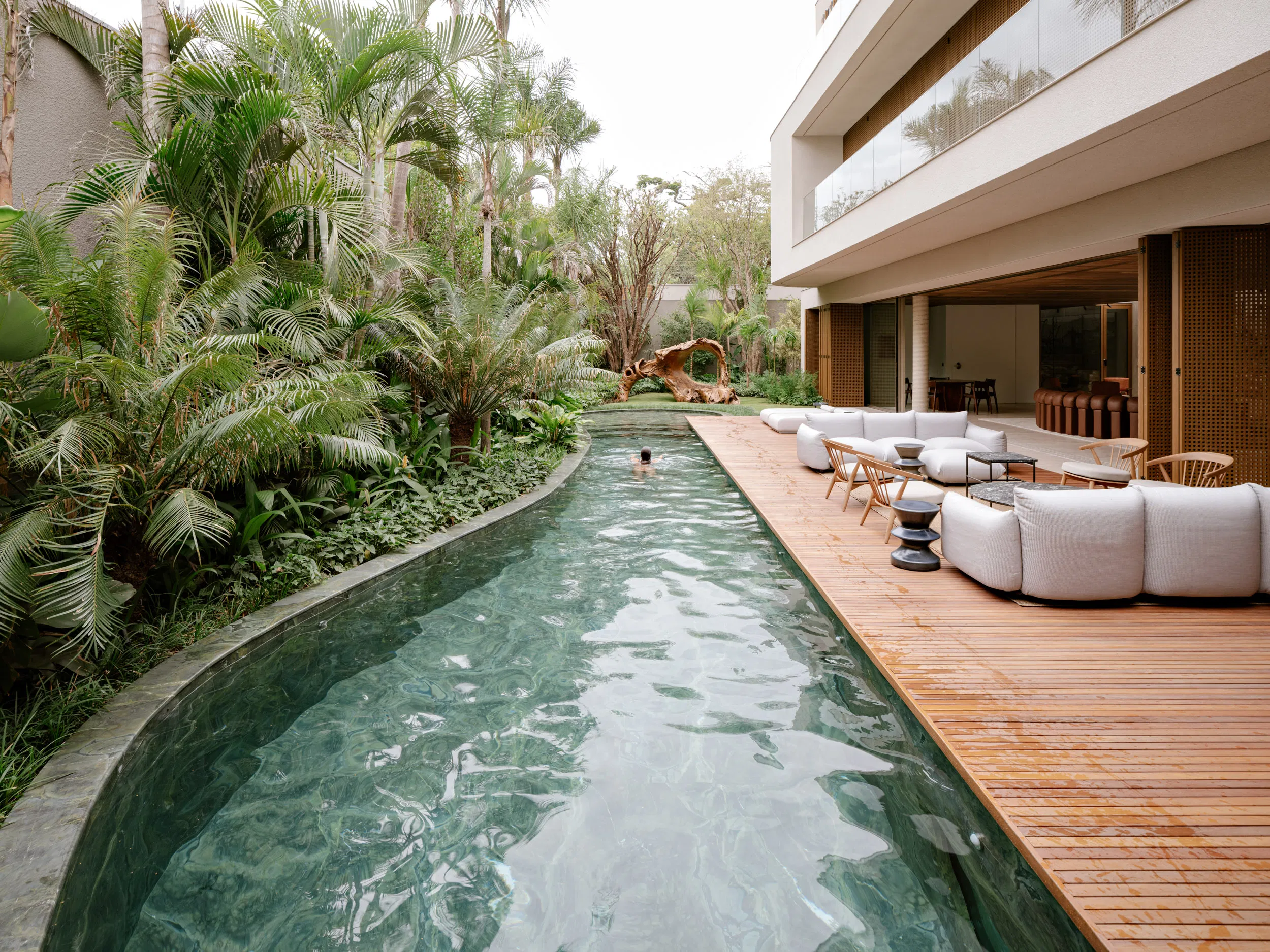 At ground level, social spaces unfold openly toward the garden. Living, dining, kitchen, and terrace areas are unified by a continuous stone floor that dissolves the boundary between interior and exterior. Large sliding glass panels and adjustable wooden screens provide flexibility, enabling the spaces to adapt to climate, light, and use throughout the day. The outdoor terrace extends this experience with a barbecue area, organically shaped pool, and a lush green wall that acts as a living backdrop.