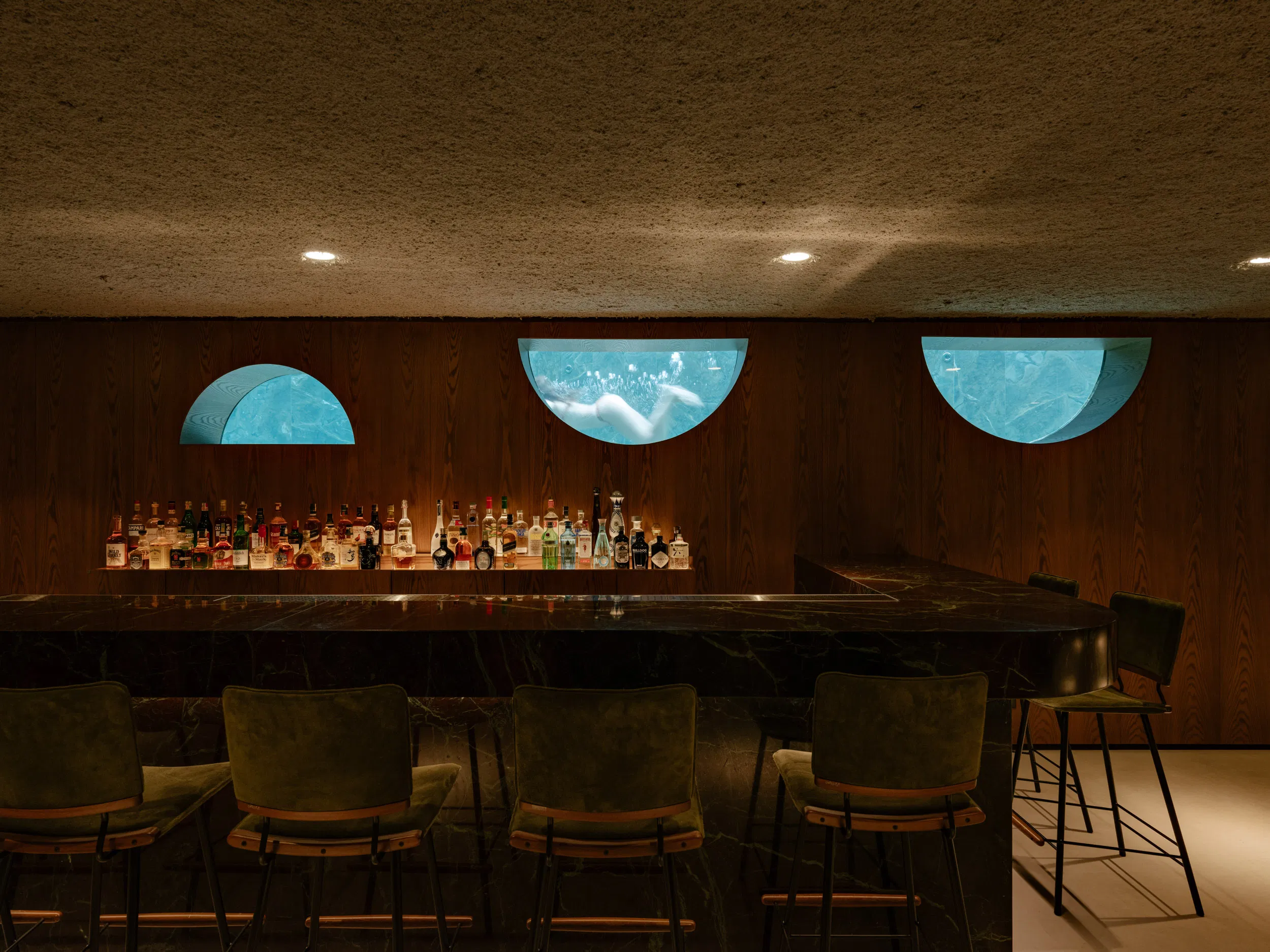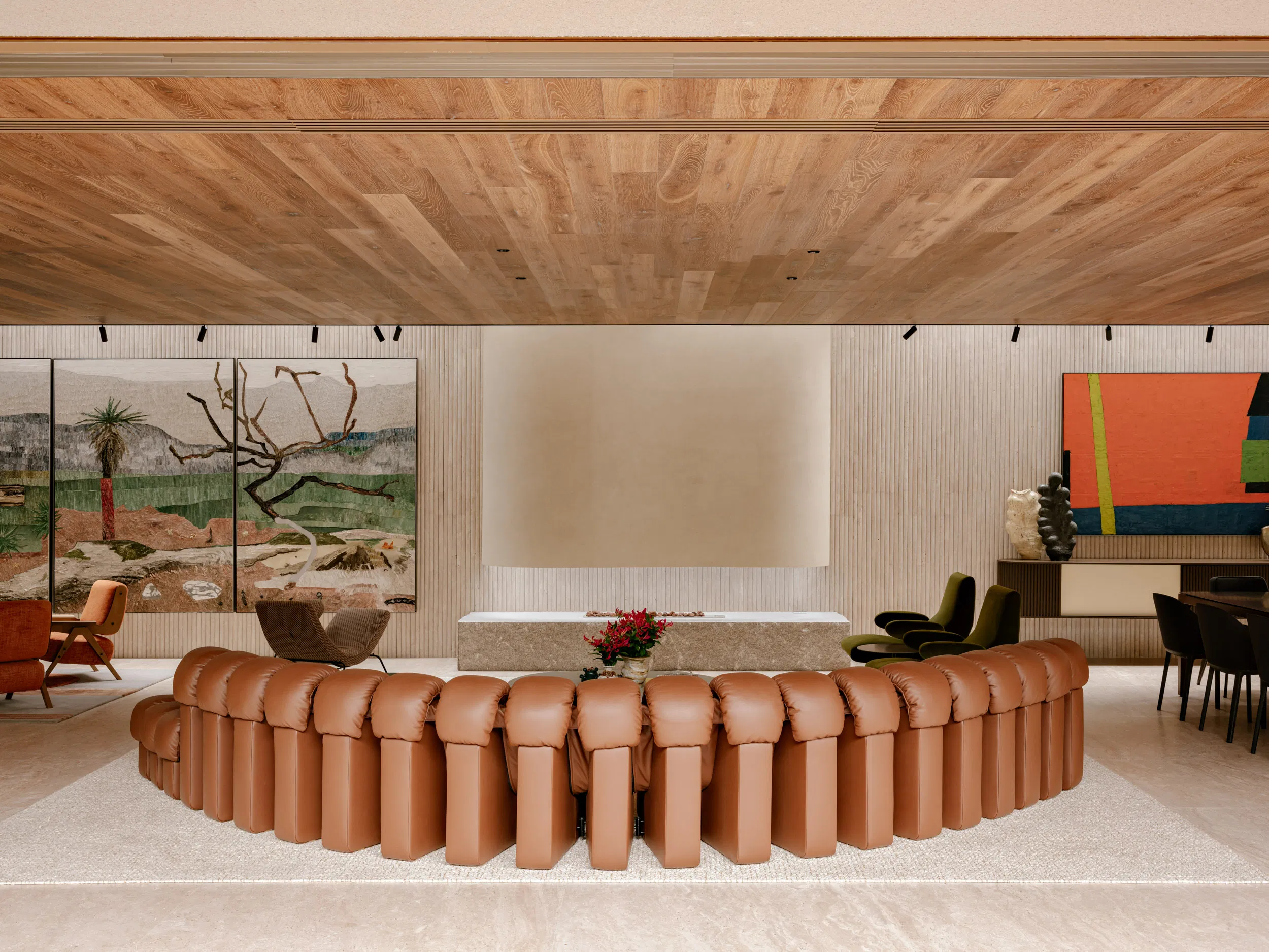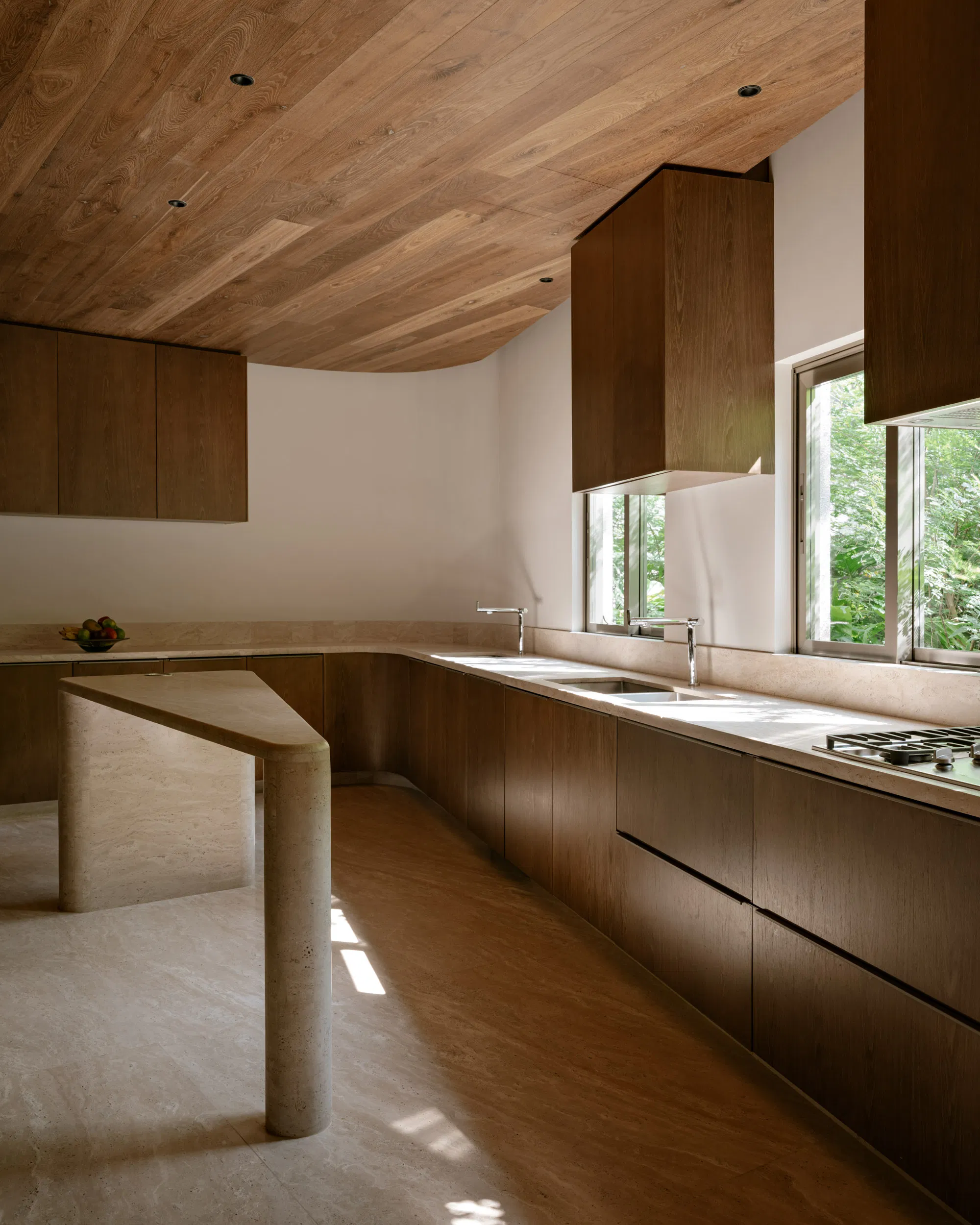 At ground level, social spaces unfold openly toward the garden. Living, dining, kitchen, and terrace areas are unified by a continuous stone floor that dissolves the boundary between interior and exterior. Large sliding glass panels and adjustable wooden screens provide flexibility, enabling the spaces to adapt to climate, light, and use throughout the day. The outdoor terrace extends this experience with a barbecue area, organically shaped pool, and a lush green wall that acts as a living backdrop.