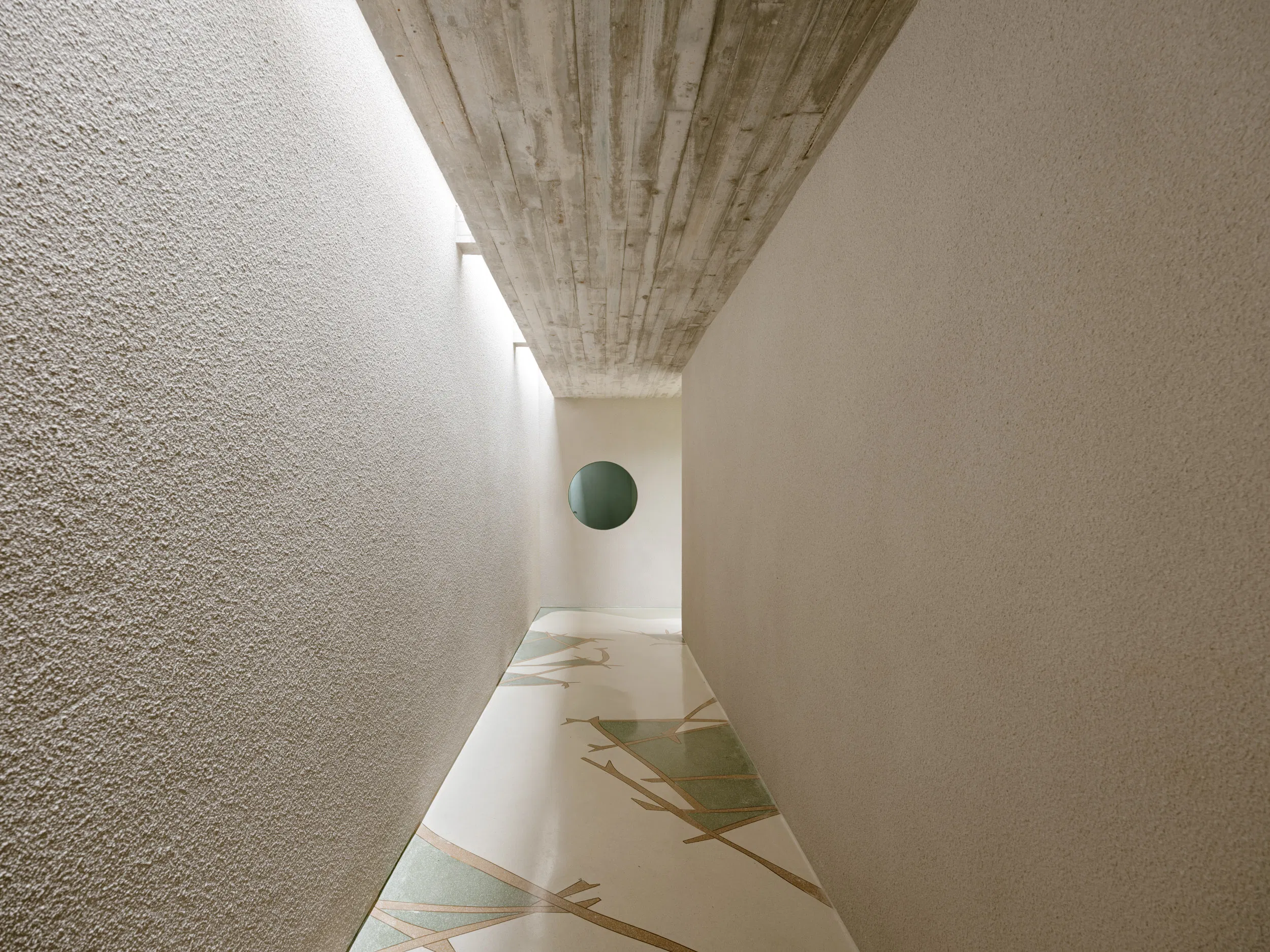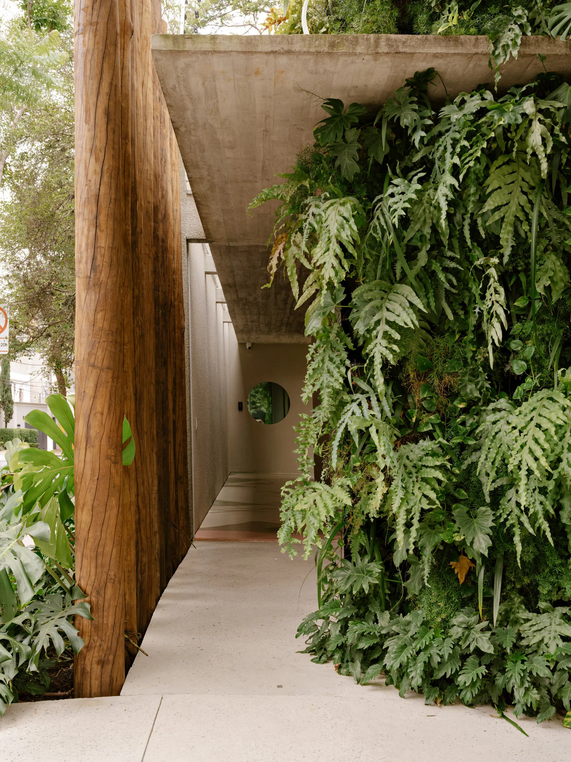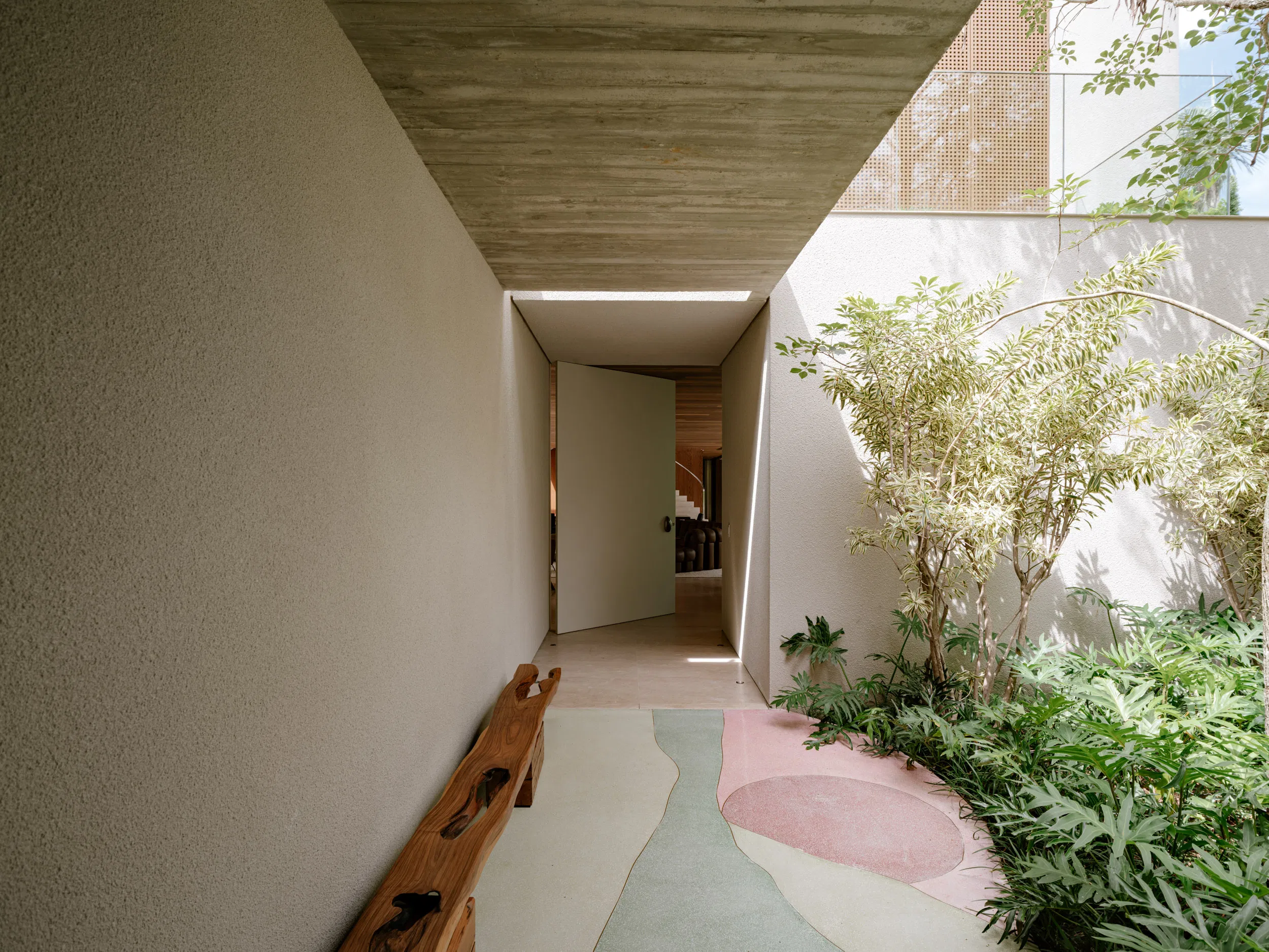 Arrival is marked by a linear entrance gallery that transitions gently from the public street into the private interior. Vertical wooden elements and dense tropical planting establish rhythm and depth, while an offset exposed-concrete canopy allows narrow shafts of daylight to trace the circulation path. A restrained use of color on the flooring introduces an artistic accent, reinforcing the contemplative character of the threshold.