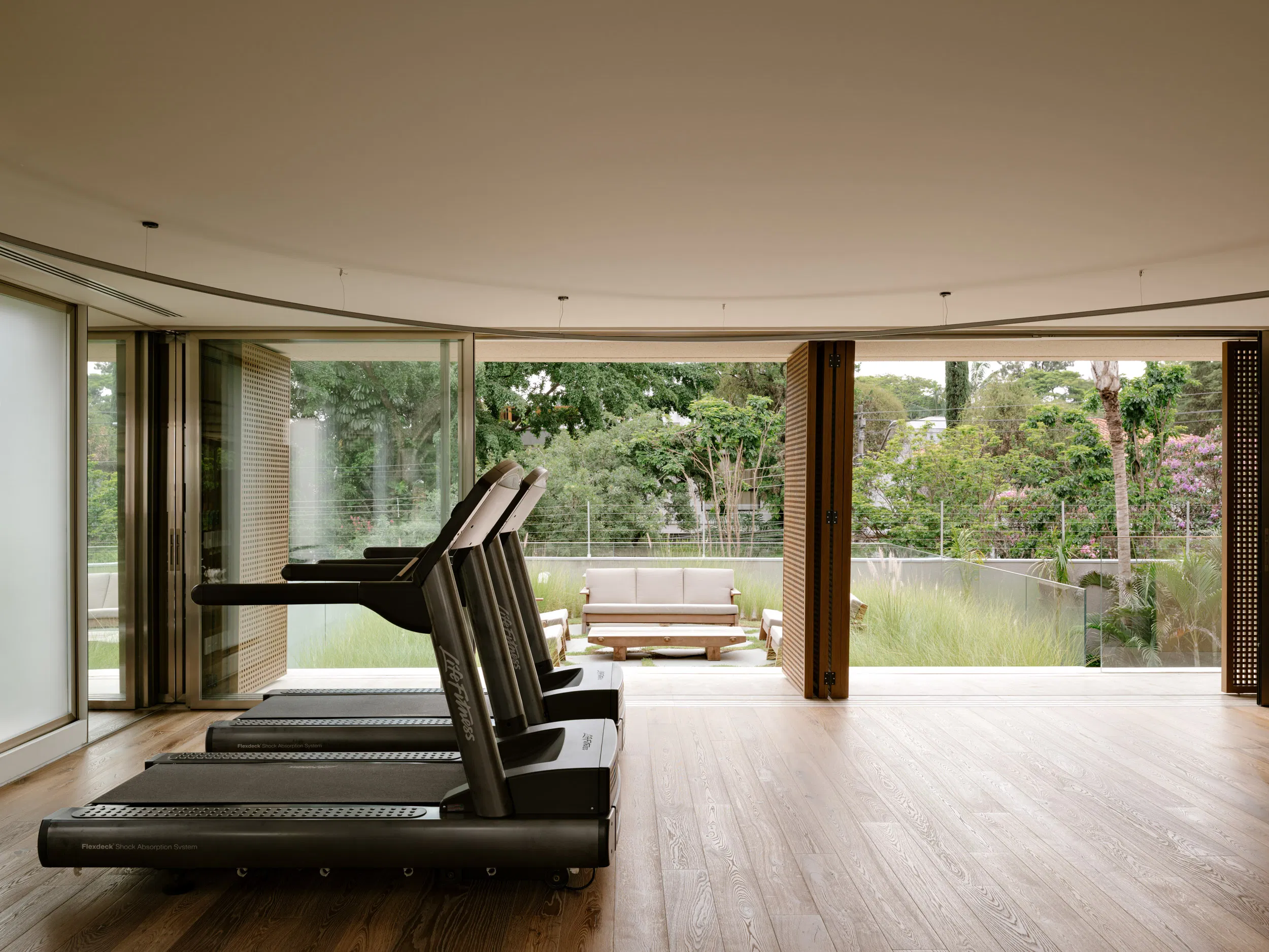 The architectural composition is defined by three prismatic volumes of varying proportions. Each volume introduces a distinct layer of environmental mediation through the use of wood brise-soleil, glazed surfaces, and opaque panels. These elements work together to filter natural light, airflow, and visual privacy, allowing the house to respond subtly to its surrounding greenery.