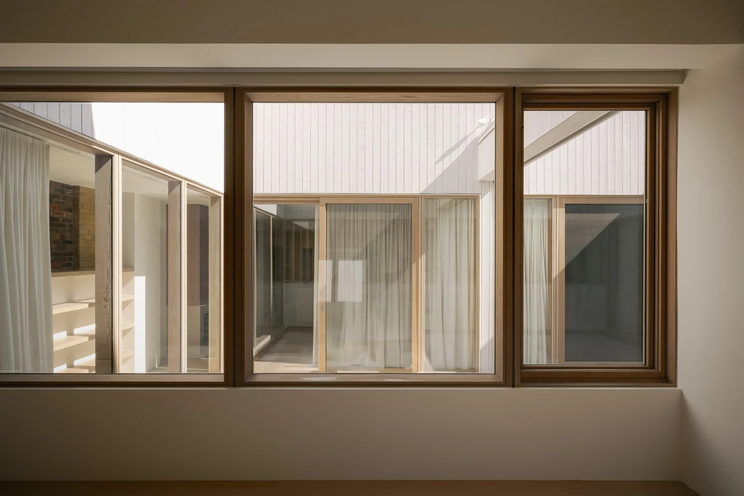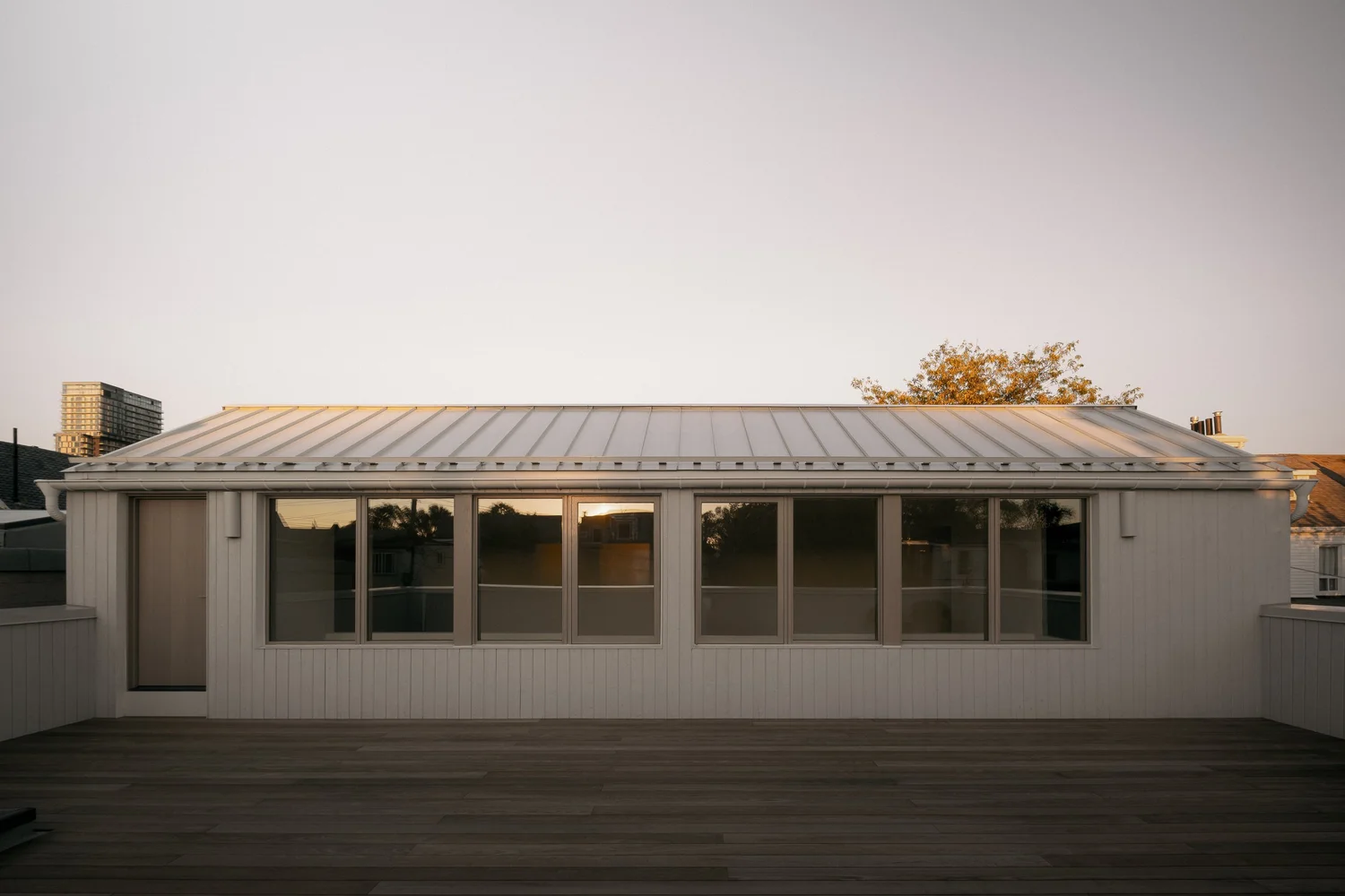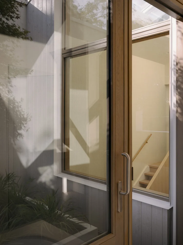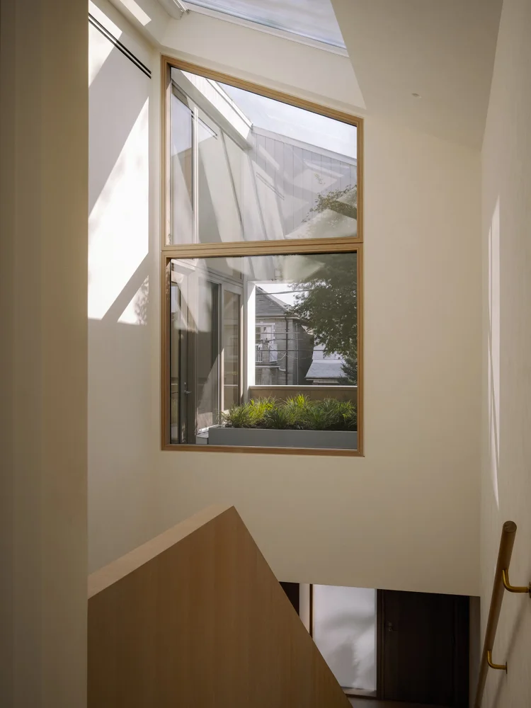 The original building spanned the full depth of the site and offered a robust architectural foundation. Instead of demolishing the structure, StudioAC adopted an adaptive reuse strategy, maintaining the steel frame, exposed timber beams, and brick envelope. The design divides the home into two equal residential units arranged north-south, allowing two generations of the same family to live side-by-side while sharing key outdoor and circulation spaces. Shared elements include the entry sequence, courtyard, terraces, and rooftop garden, creating opportunities for everyday interaction.