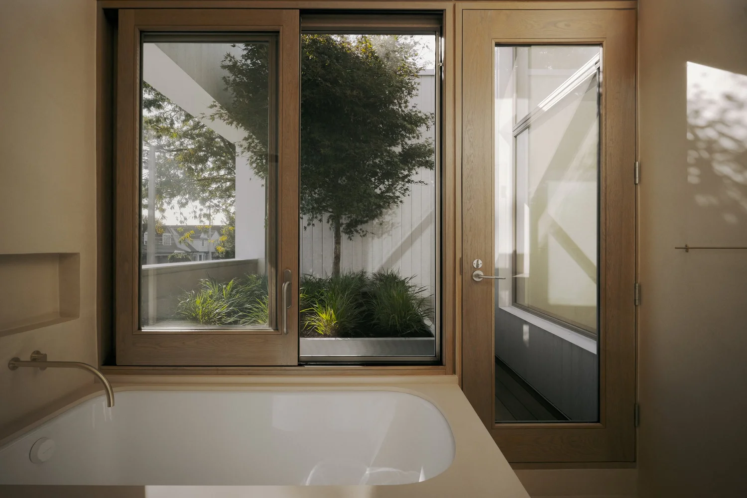 The upper level follows a more additive architectural strategy, where private bedroom volumes open onto terraces and shared outdoor areas. A double-height atrium near the entry, illuminated by skylights and large windows, visually connects the two floors and allows natural light to cascade through the interior. Within the courtyard, a Japanese maple tree serves both as a sculptural landscape element and as a natural privacy screen, reinforcing the project’s connection between architecture and nature.