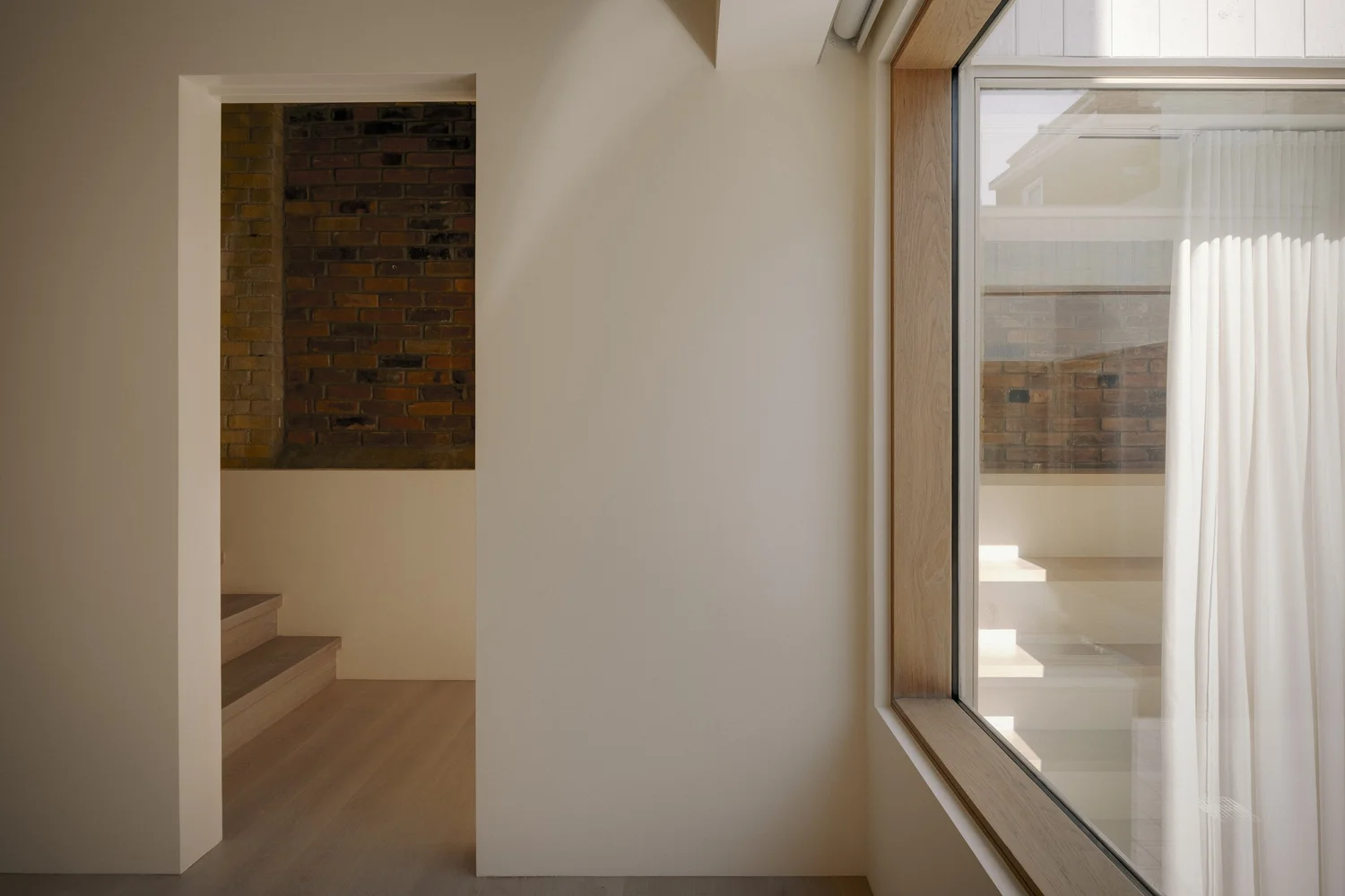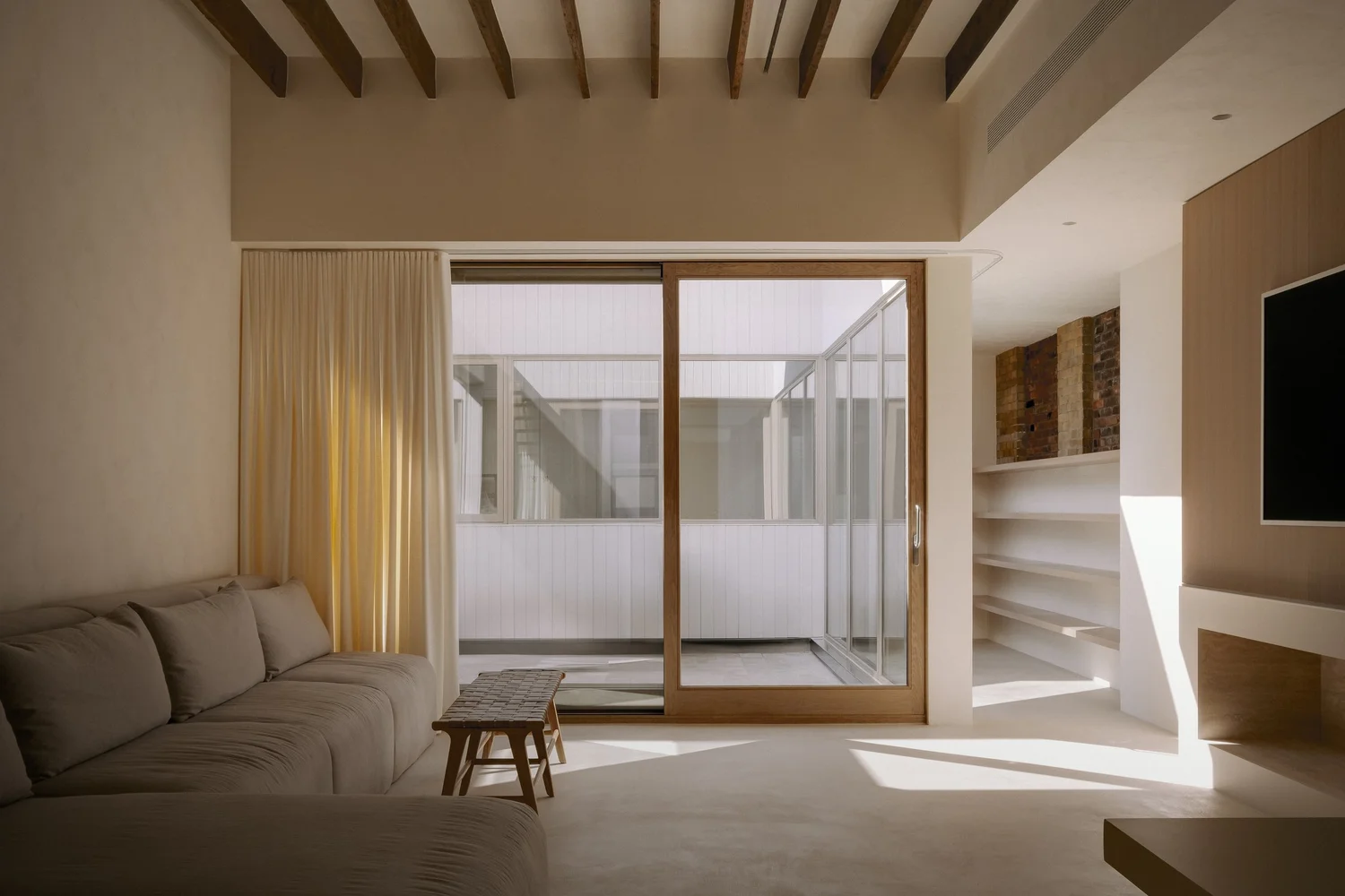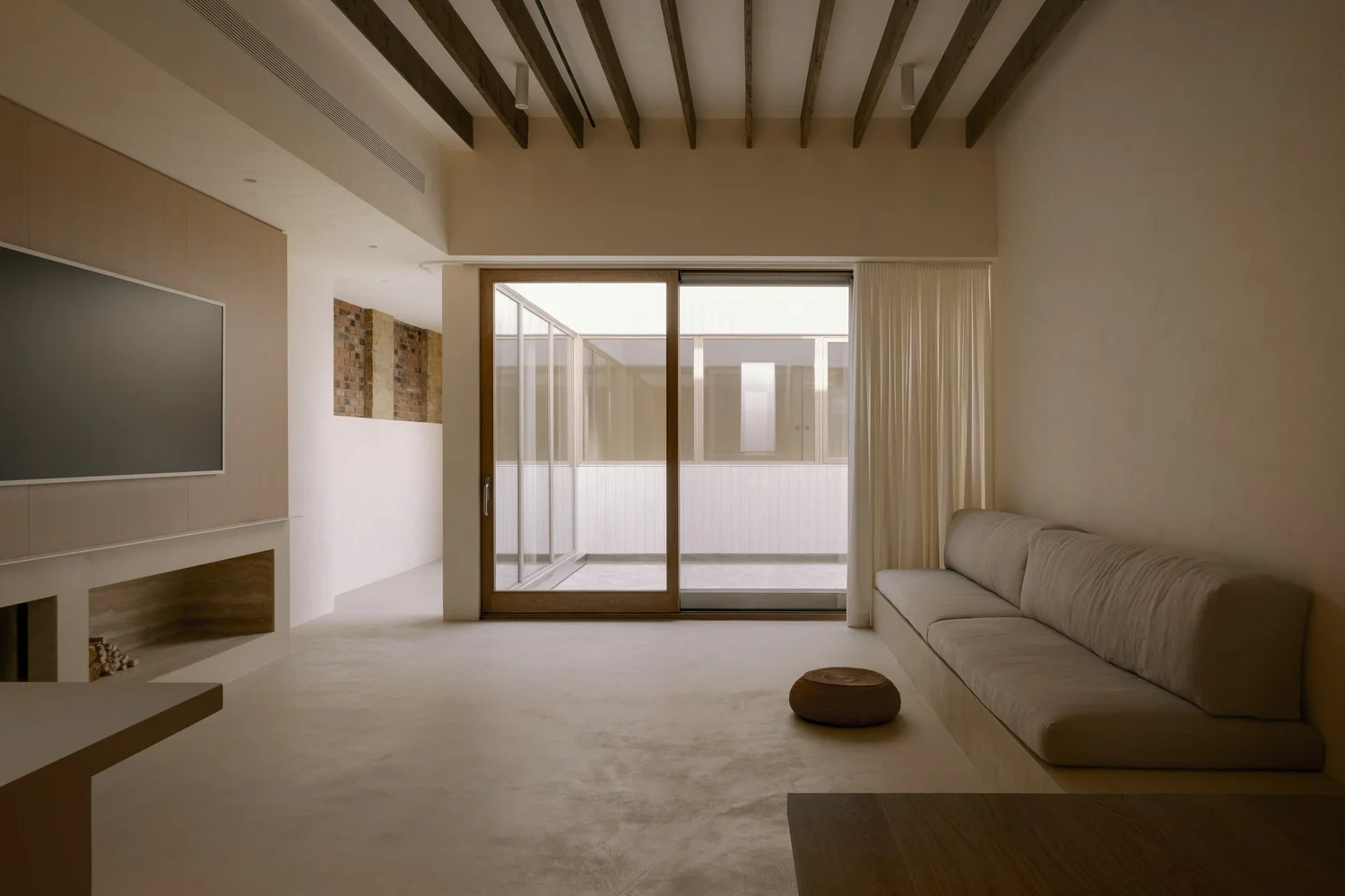 Materiality plays a crucial role in reinforcing the dialogue between the building’s past and present. The palette combines limewash walls, microcement floors, exposed wood beams, and preserved brickwork to create a restrained yet tactile interior environment. Rather than relying on strong colors, the design emphasizes texture, light, and subtle material contrasts. These surfaces reflect daylight throughout the house, amplifying the sense of openness while maintaining a warm residential atmosphere.