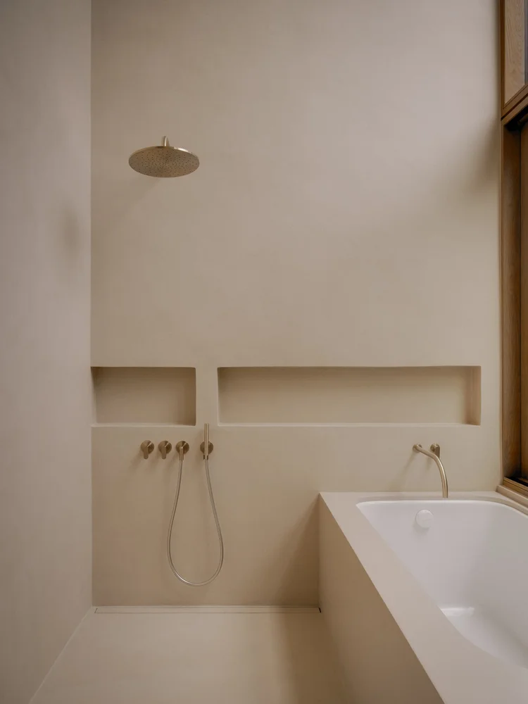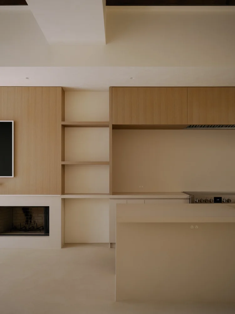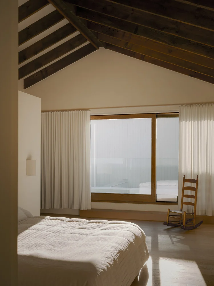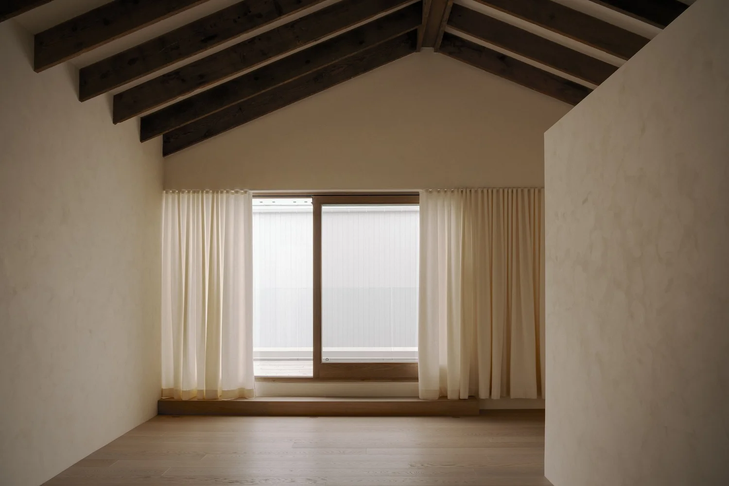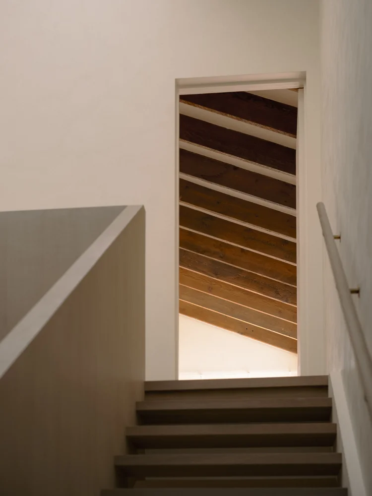 Materiality plays a crucial role in reinforcing the dialogue between the building’s past and present. The palette combines limewash walls, microcement floors, exposed wood beams, and preserved brickwork to create a restrained yet tactile interior environment. Rather than relying on strong colors, the design emphasizes texture, light, and subtle material contrasts. These surfaces reflect daylight throughout the house, amplifying the sense of openness while maintaining a warm residential atmosphere.