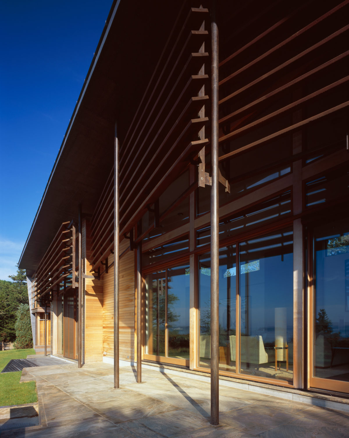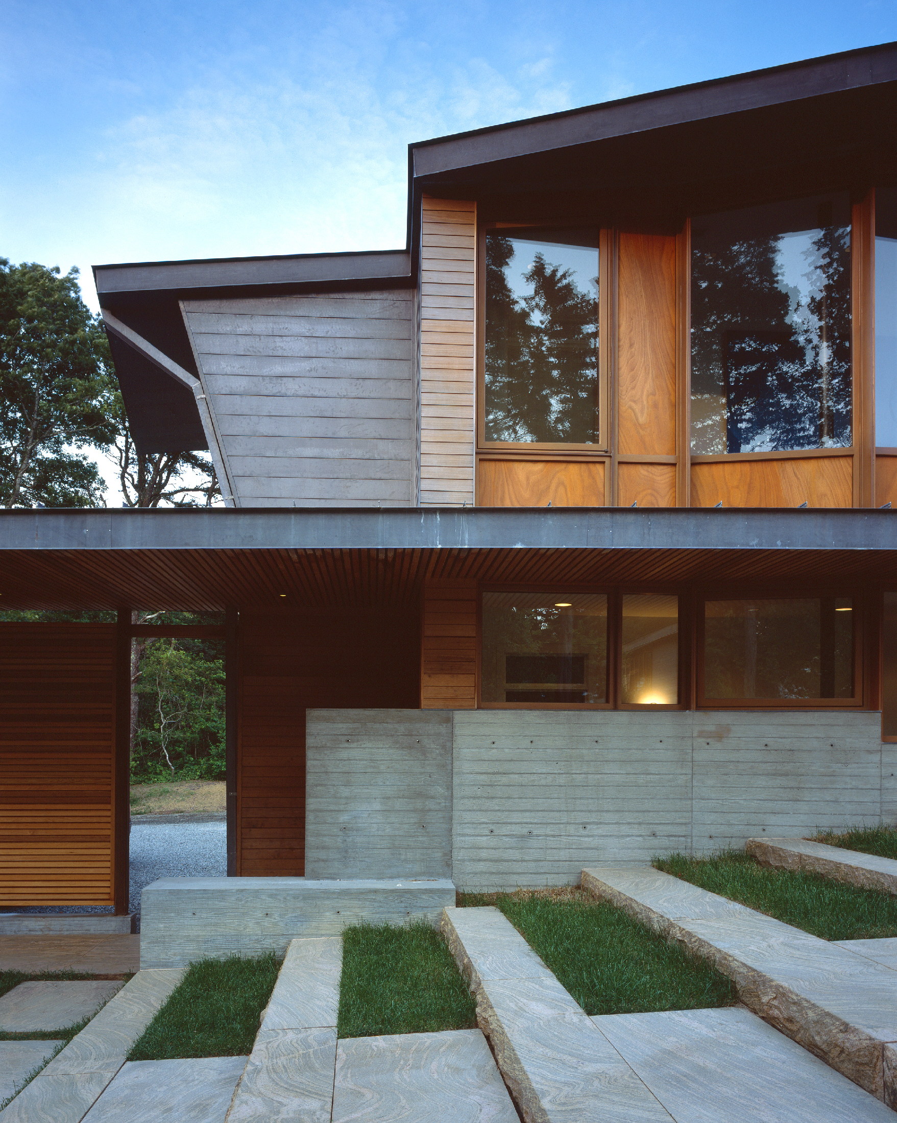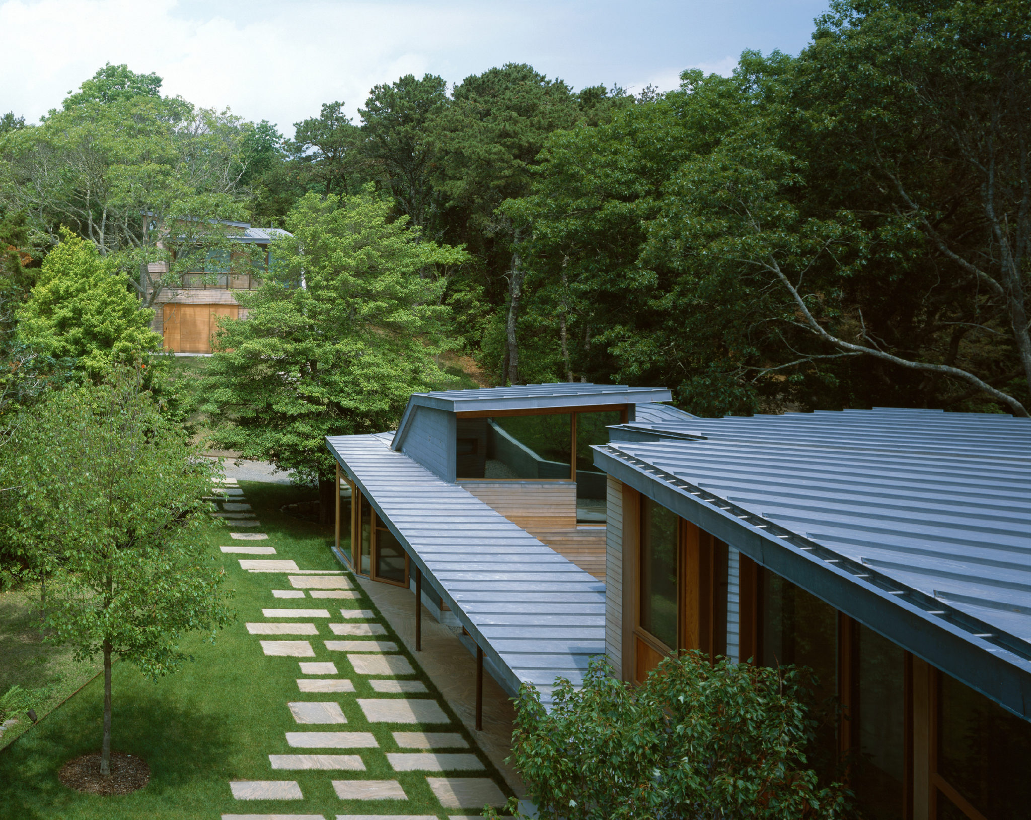 Orleans House is a coastal residential project located in Orleans, Massachusetts, positioned on a bluff overlooking the Atlantic Ocean. Designed by Charles Rose Architects, the house responds directly to a site shaped by salt water, wind, tides, marshland, barrier beach, and open sky. The project is conceived as a set of active forms that follow the natural ridgeline of the site, beginning at the bunkhouse and rising toward the main entry before turning dramatically toward the water. This spatial progression gives the home a strong sense of movement while grounding it in the rhythms of the surrounding landscape.