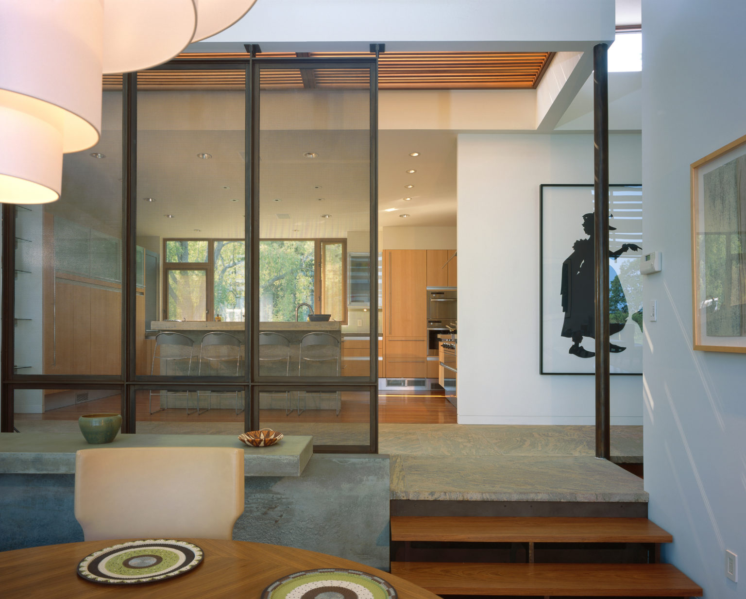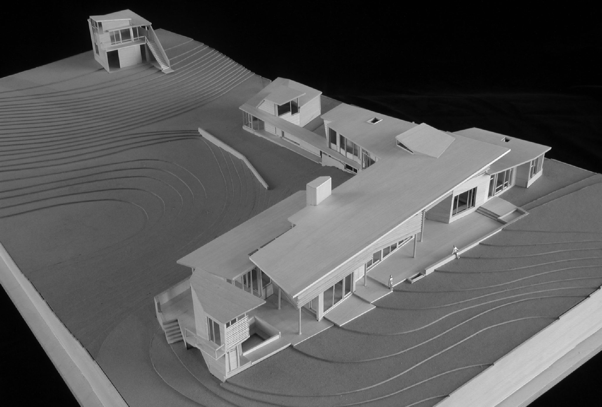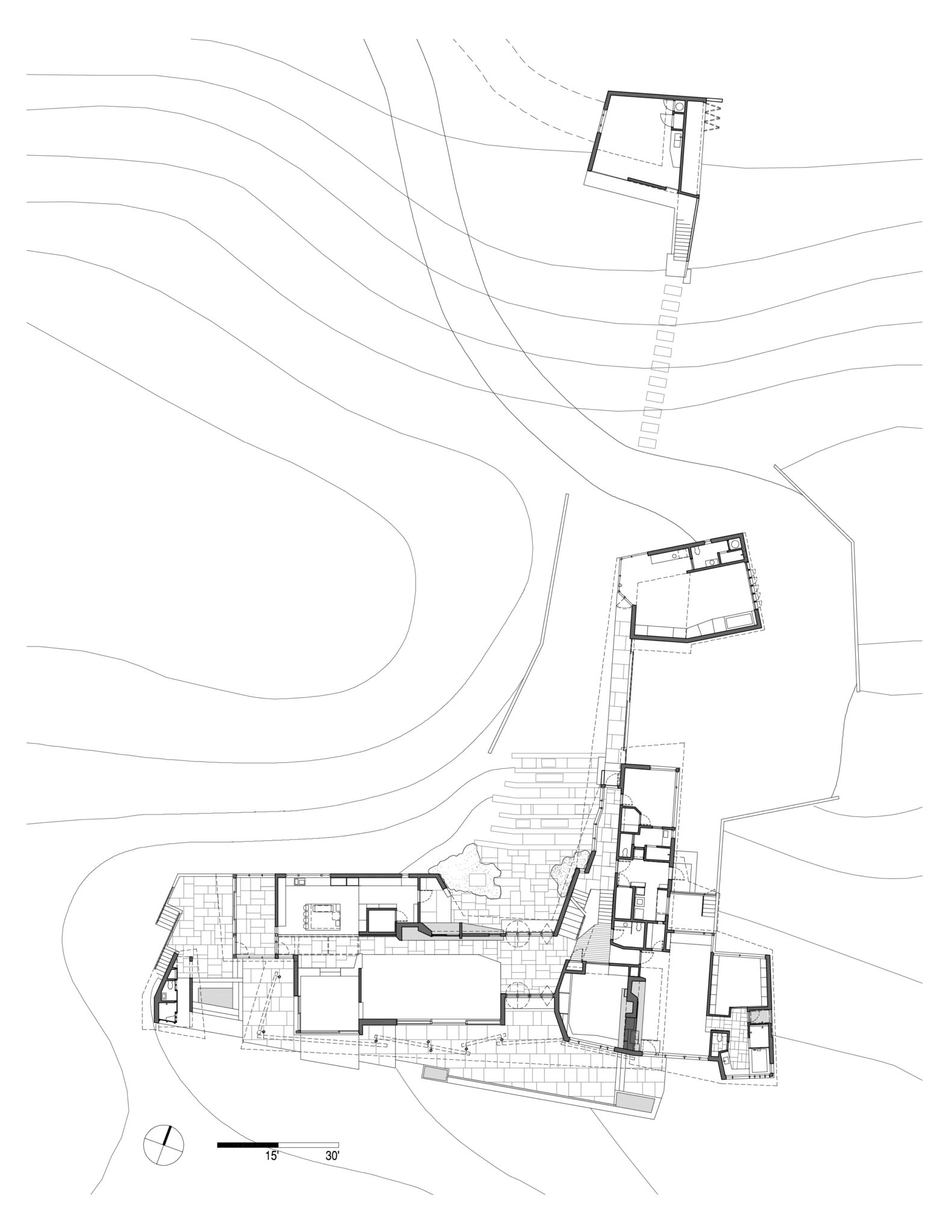 The main composition organizes private and public functions with clarity. One side contains the primary bedroom, while the other holds a sequence of living, dining, and kitchen spaces, anchored by an office tower. A terrace and spa separate supporting elements from the main house. The house is described as low slung and one room deep throughout, tracing the site’s natural bowl without regrading the land or removing mature trees. Additional spaces include an art studio, guest apartment, and detached office tower. Roof overhangs and sunscreen trellises help shelter exterior and interior zones, while stepped floor levels maintain distinction between interconnected public rooms.