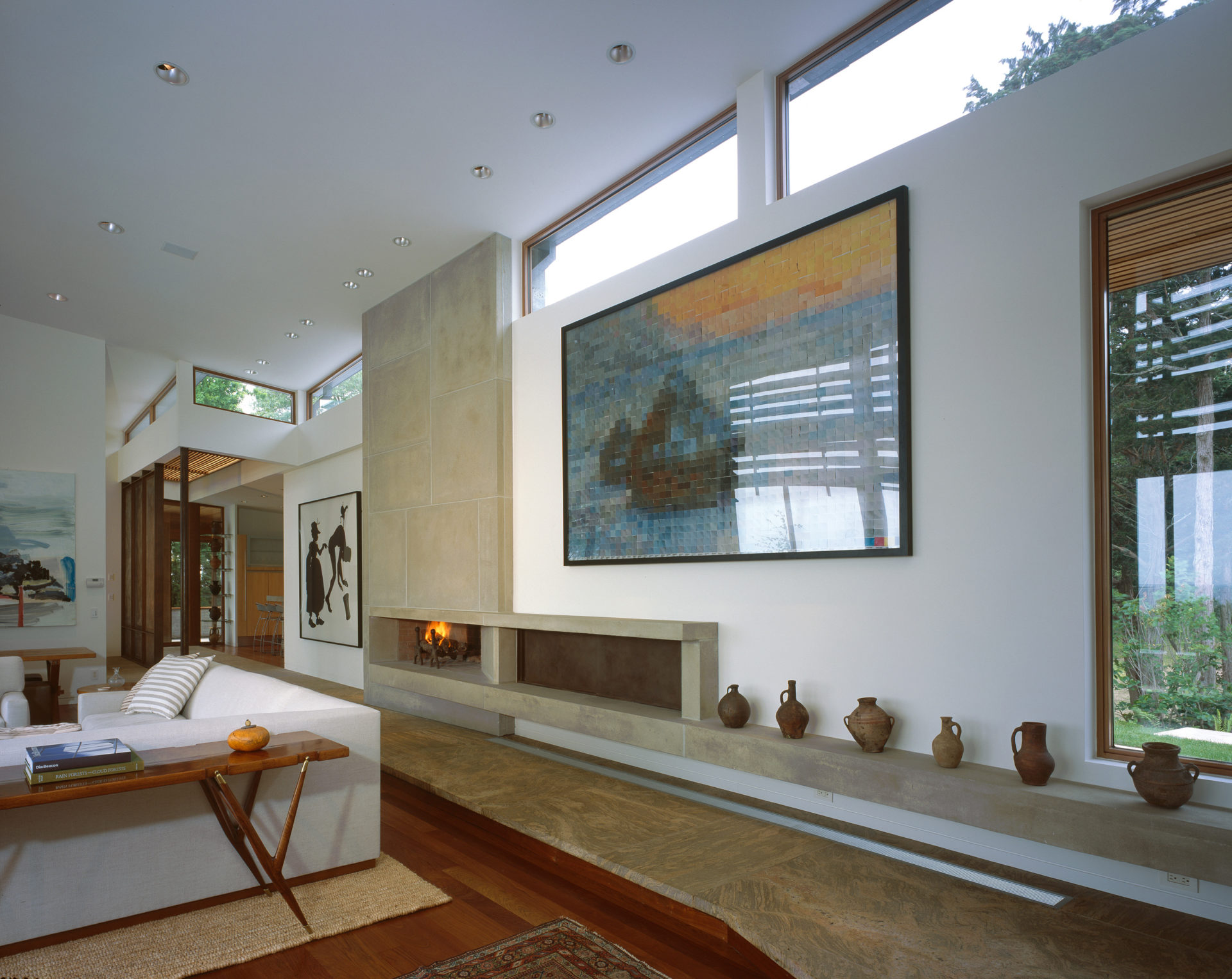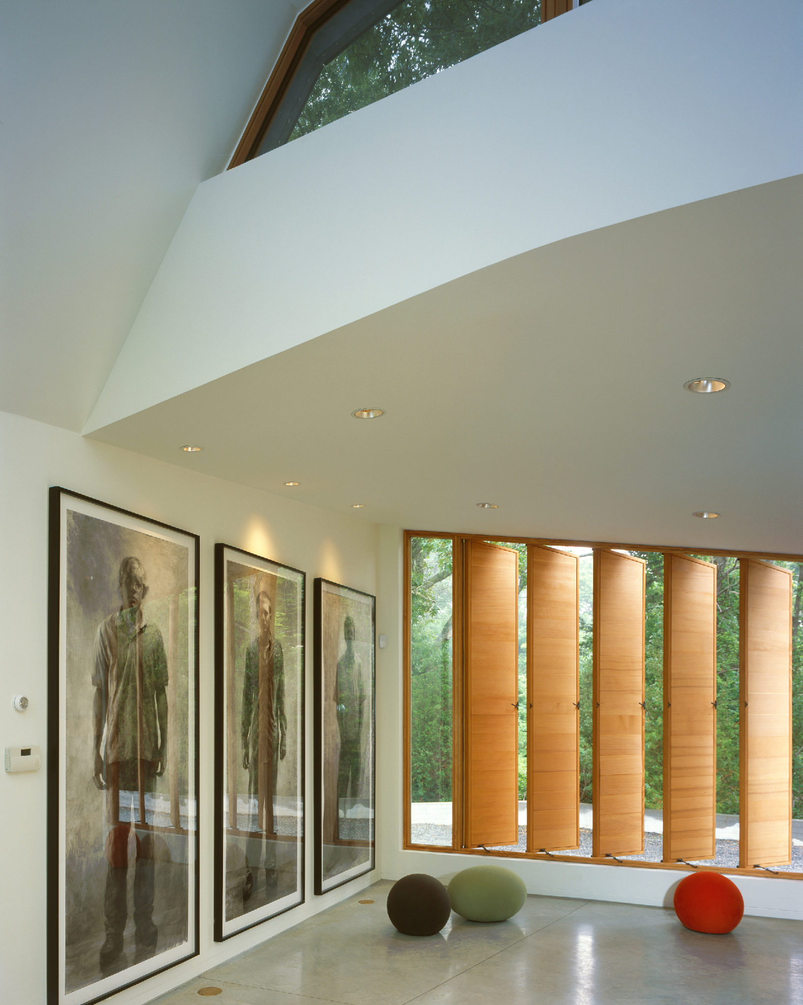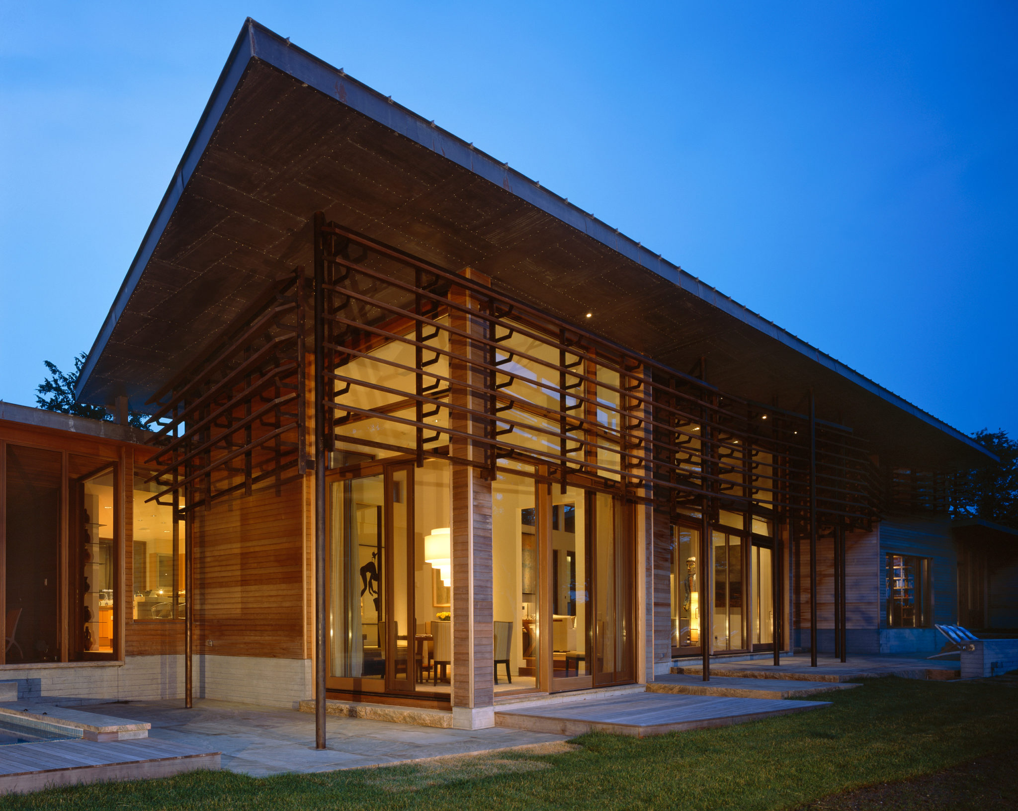 The main composition organizes private and public functions with clarity. One side contains the primary bedroom, while the other holds a sequence of living, dining, and kitchen spaces, anchored by an office tower. A terrace and spa separate supporting elements from the main house. The house is described as low slung and one room deep throughout, tracing the site’s natural bowl without regrading the land or removing mature trees. Additional spaces include an art studio, guest apartment, and detached office tower. Roof overhangs and sunscreen trellises help shelter exterior and interior zones, while stepped floor levels maintain distinction between interconnected public rooms.