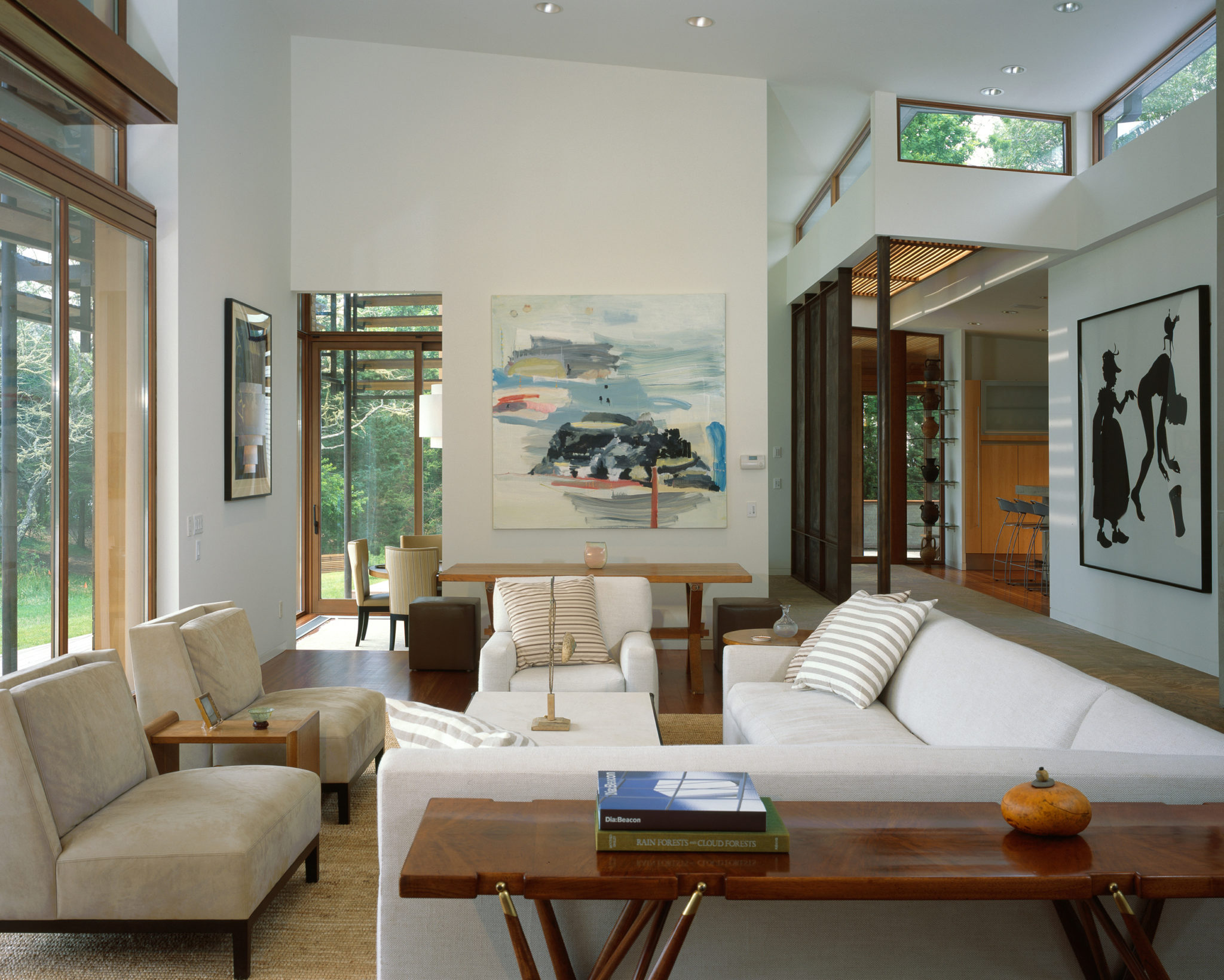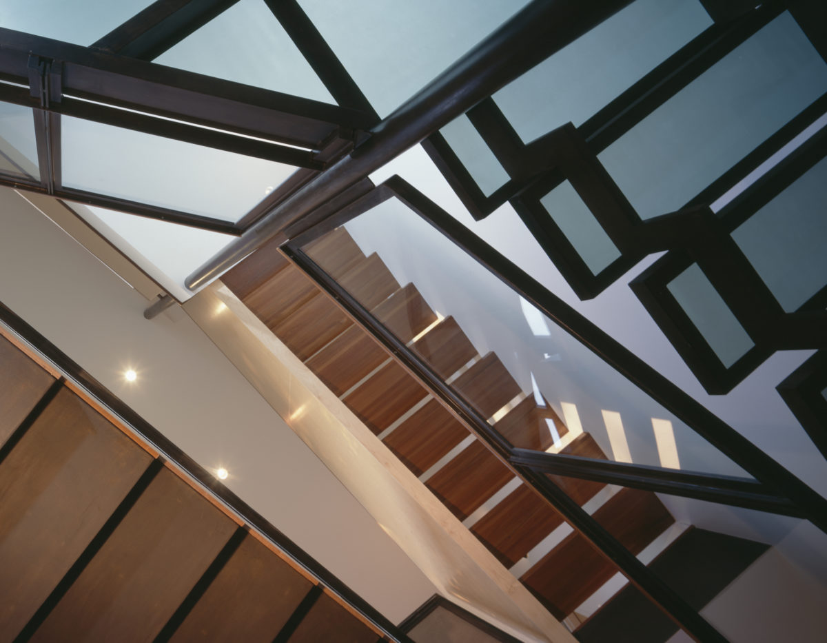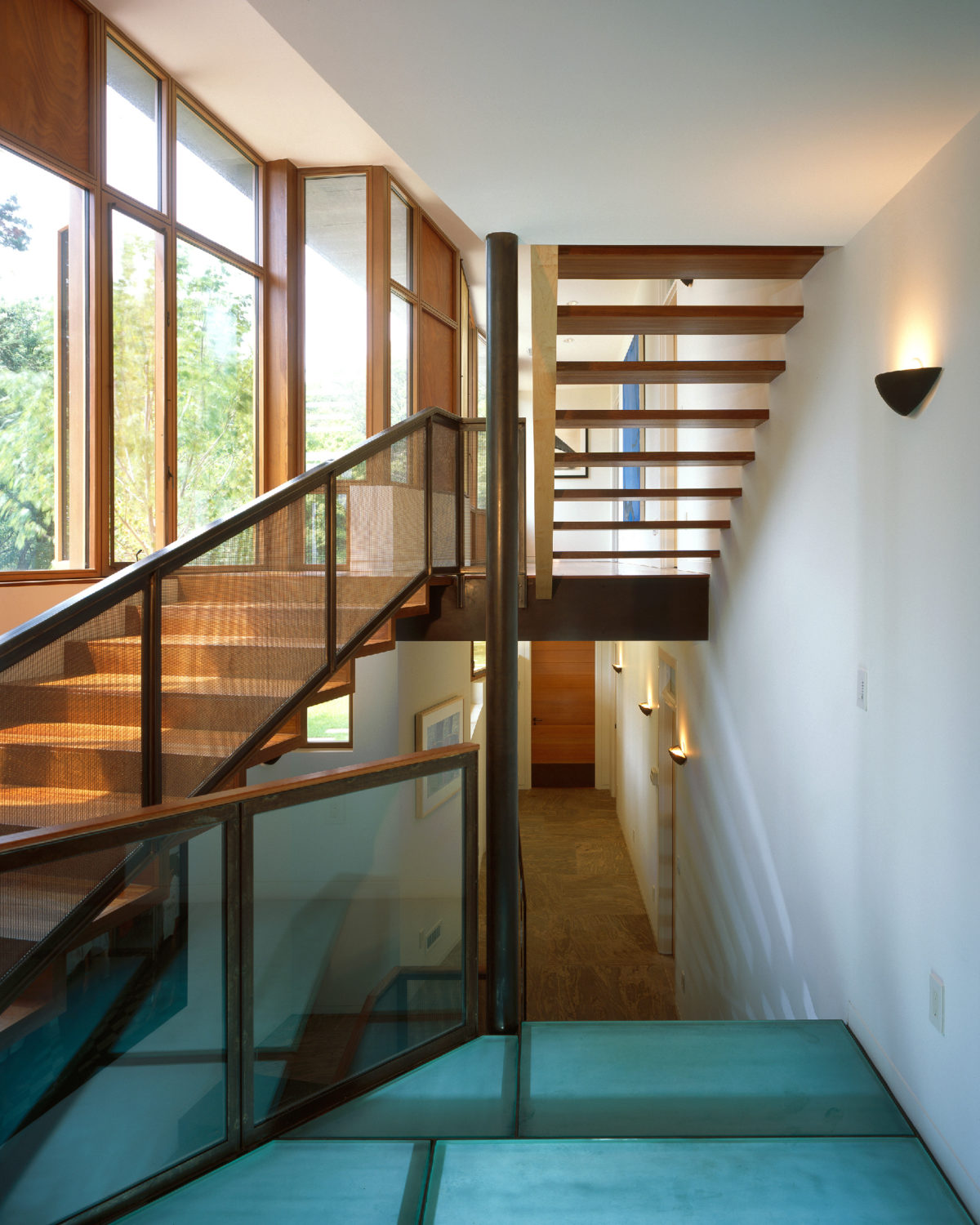 Materially and structurally, Orleans House combines load-bearing walls and clerestory windows on the landside with stainless-steel columns on the seaside, allowing expansive glass openings toward the water. Light is carefully controlled through clerestories and fixed louvers, producing an ambient interior atmosphere. A notable sculptural stair transitions from glass to folded wood to open wood risers, reinforcing the project’s crafted architectural expression. Despite its contemporary presence, the house is tightly woven into the landscape, maintaining a restrained visual impact within its Cape Cod setting. The house merges architecture and landscape, creating a seamless coastal living experience defined by light, materiality, and spatial continuity throughout.