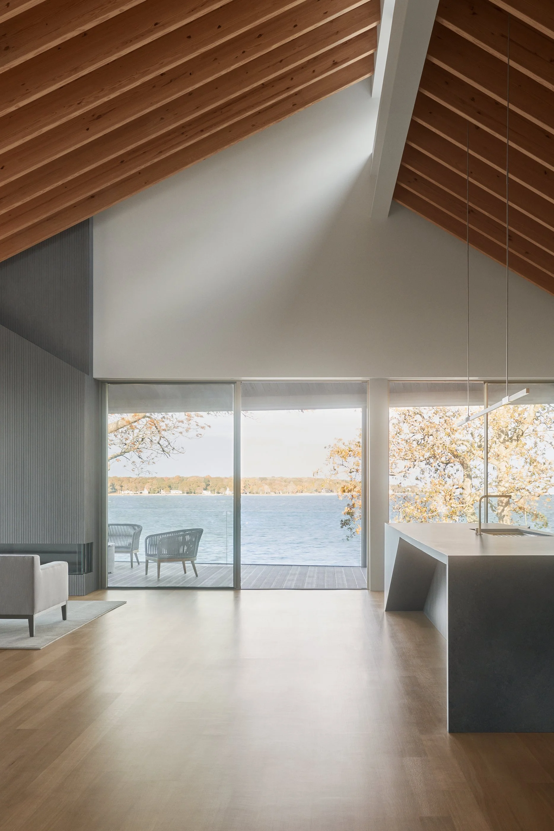 Large glazed openings along the northern façade introduce soft daylight throughout the interior while framing views of the marsh and surrounding trees. Clerestory windows and exposed timber beams enhance the spatial experience inside, emphasizing height and light. Toward the water, the building’s geometry subtly projects outward, forming covered terraces and outdoor gathering areas that extend the living spaces into the landscape.