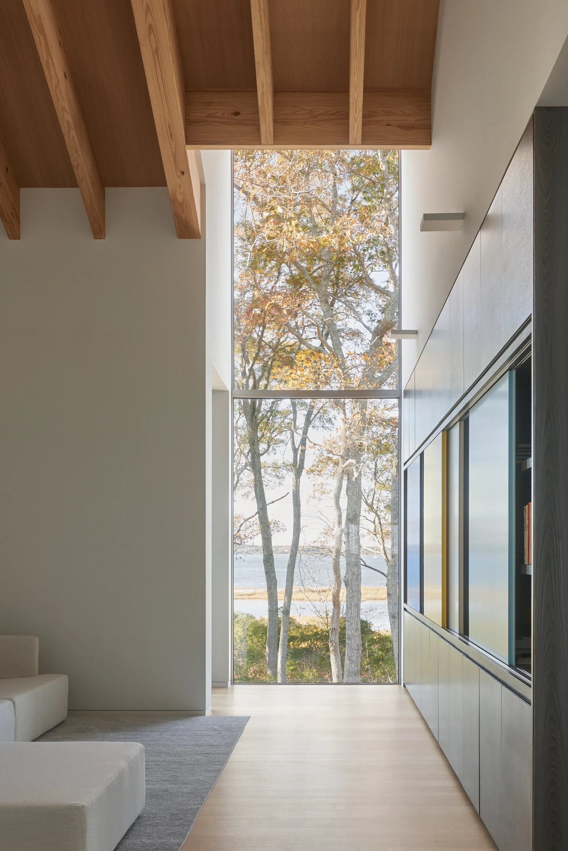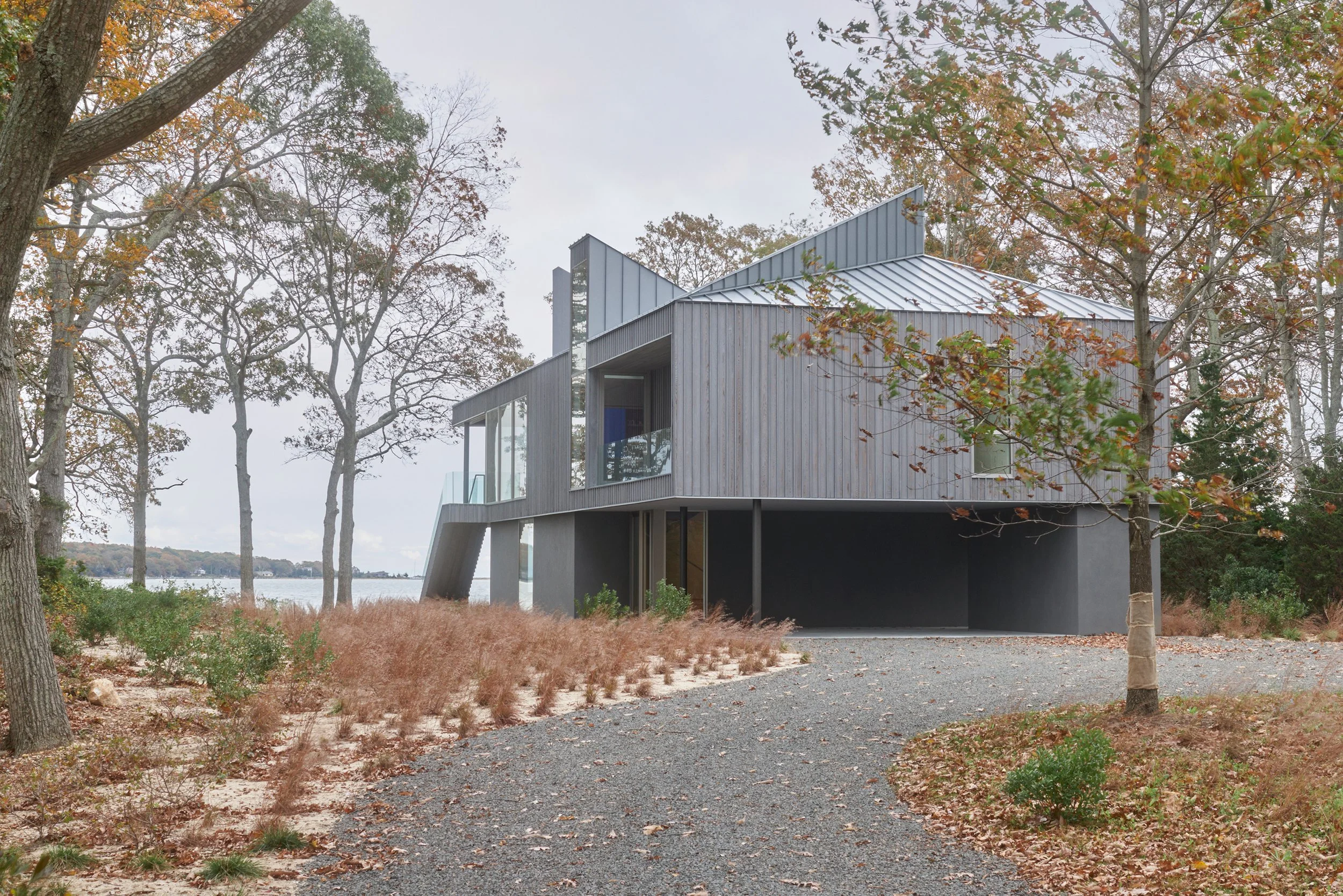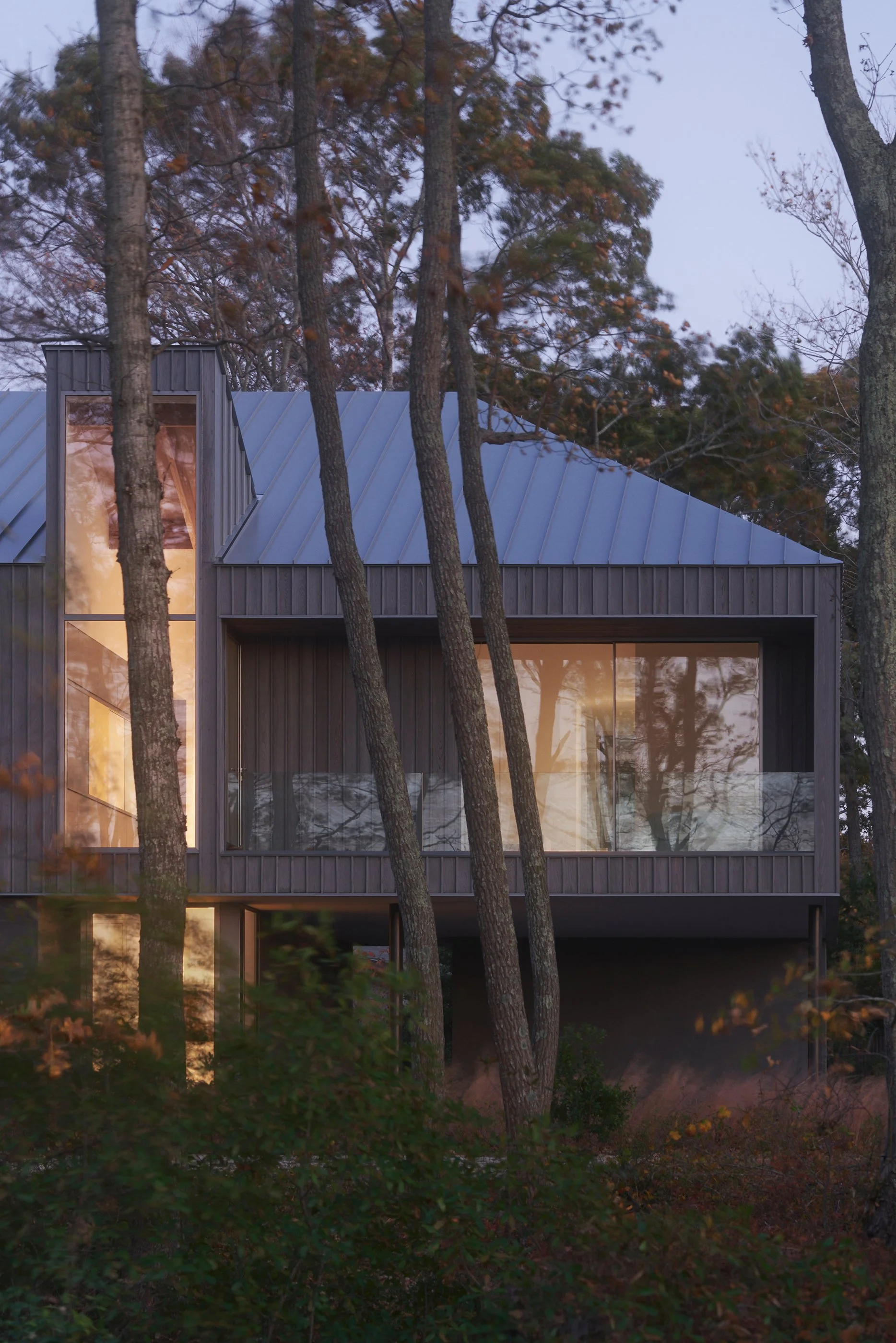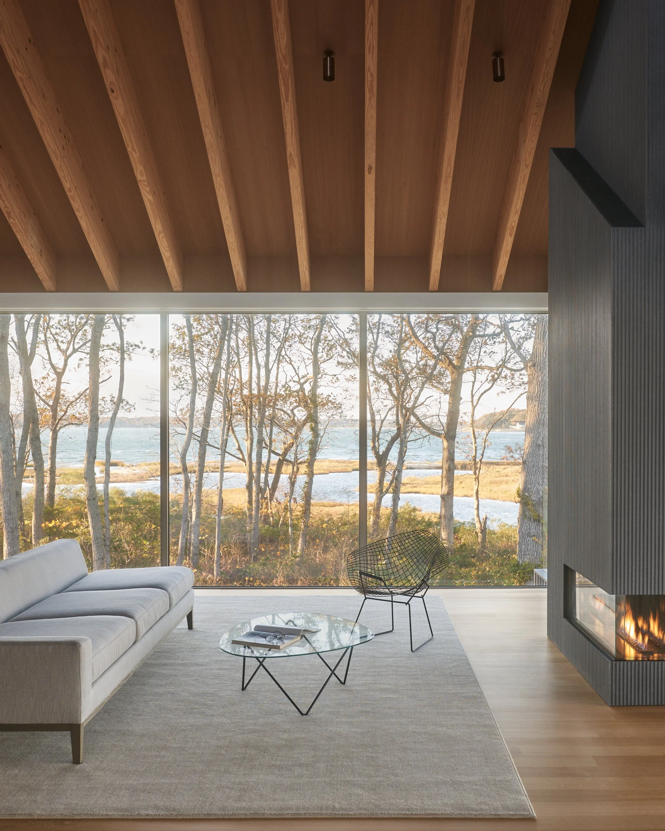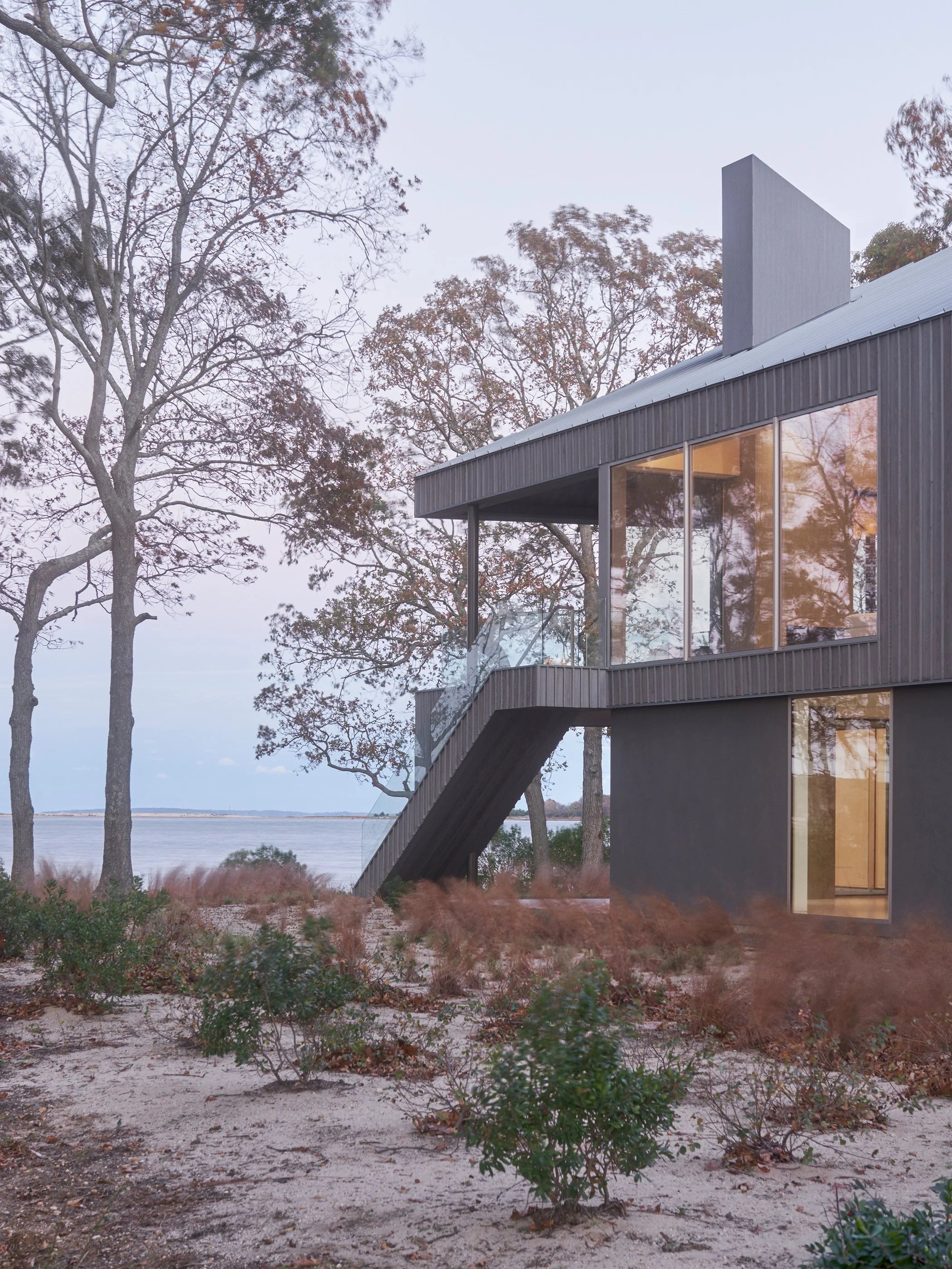 The architecture blends into the wooded site through a carefully considered material strategy. The exterior is clad in vertical gray wood siding inspired by the bird-watching “blinds” found in the nearby nature preserve. The wood is treated using the traditional Japanese shou sugi ban charring technique, which improves durability while giving the façade a driftwood-like tone that harmonizes with the coastal landscape.