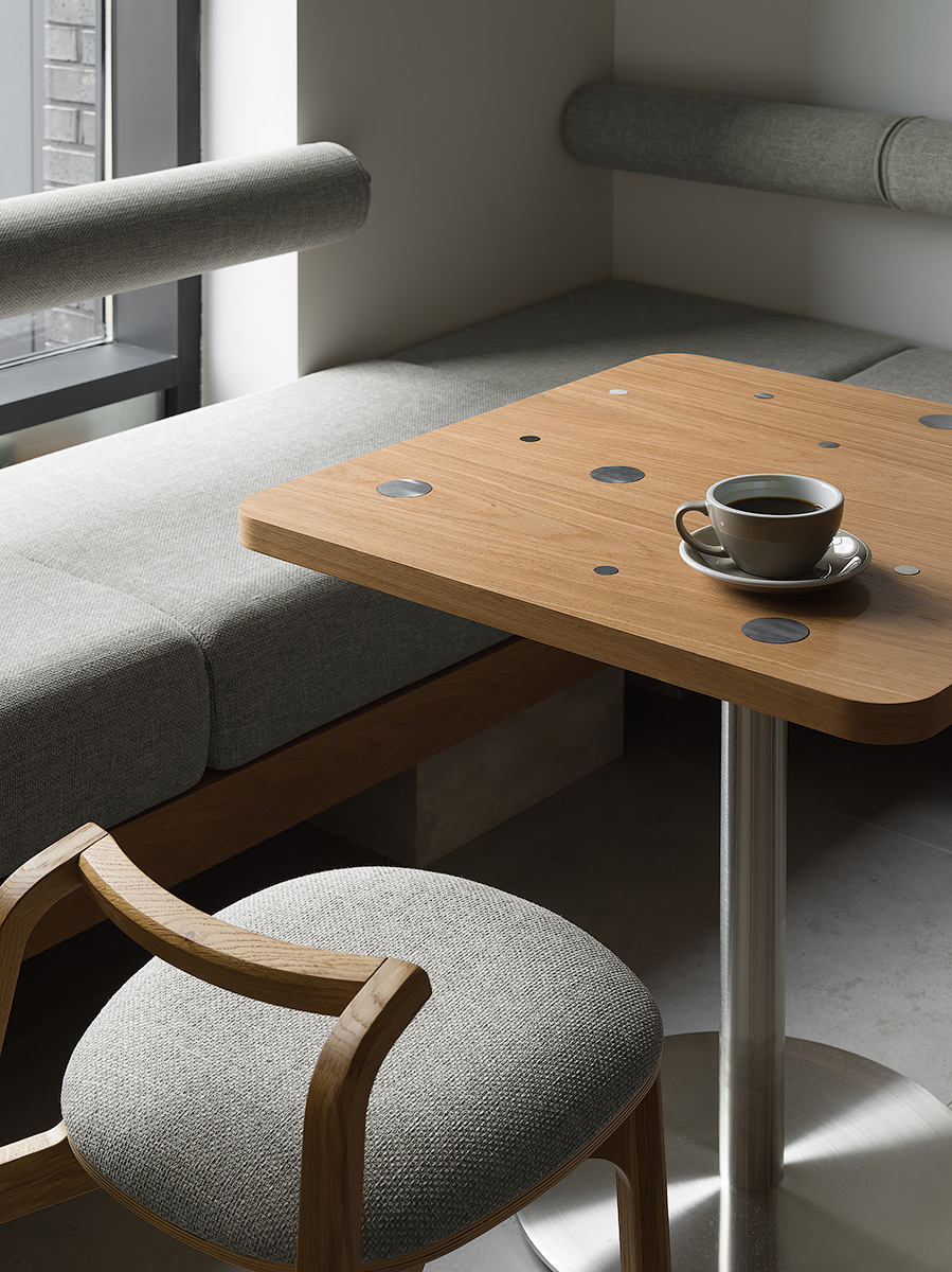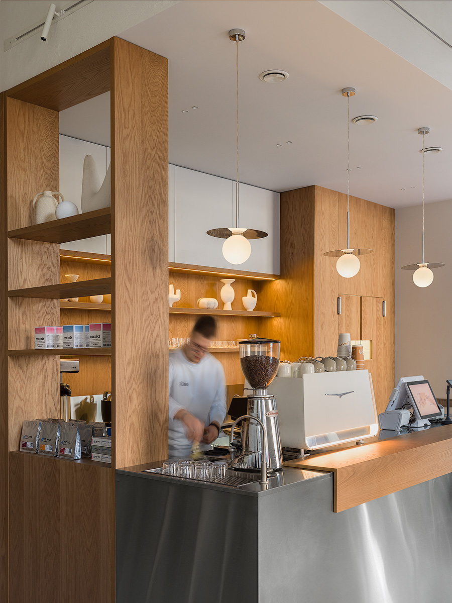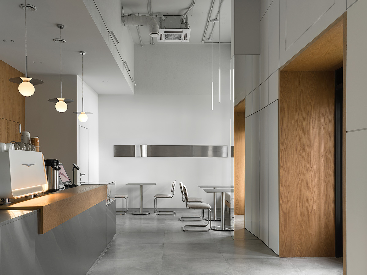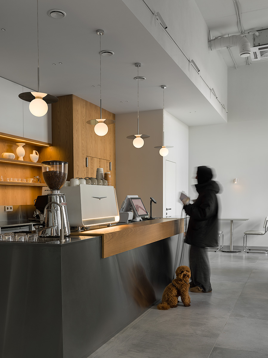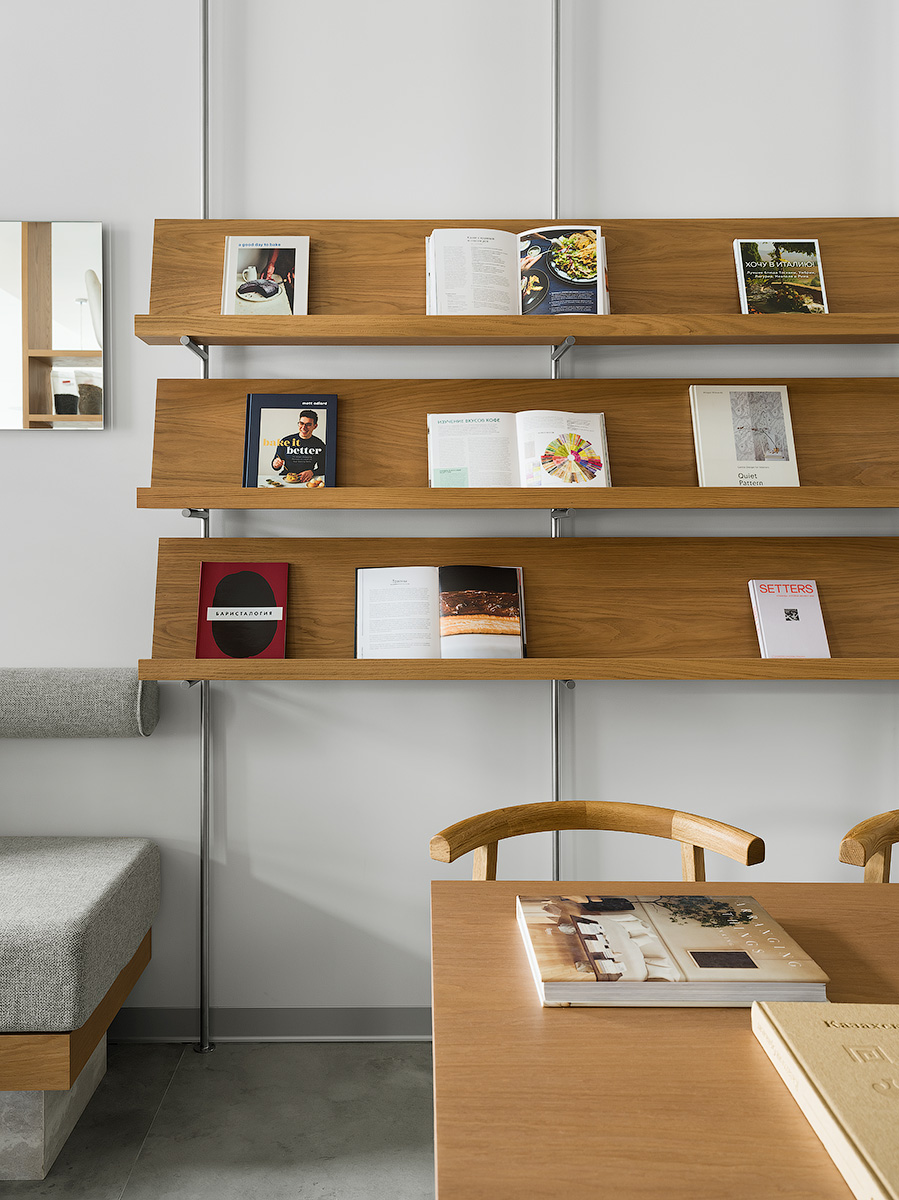 It is known that an overloaded interior reduces the quality of perception and concentration by 30%. Therefore, the solution of the coffee shop space is focused on three main accents: light walls as a clean canvas, wood and metal as the main materials from which the furniture is made.