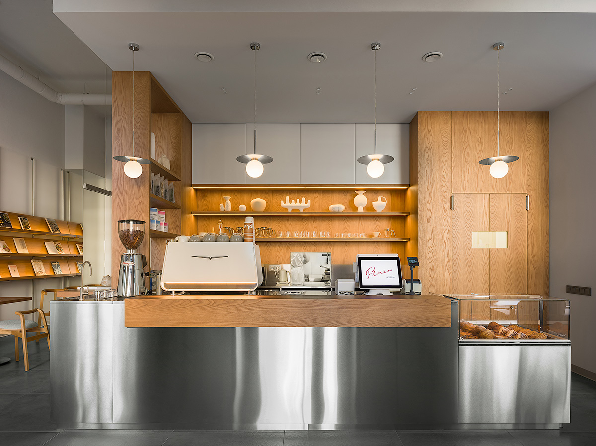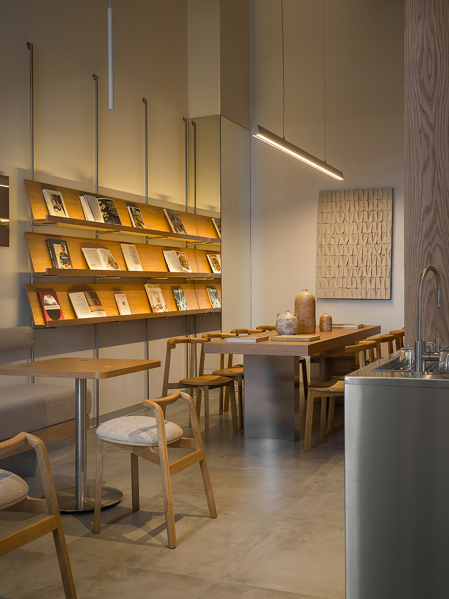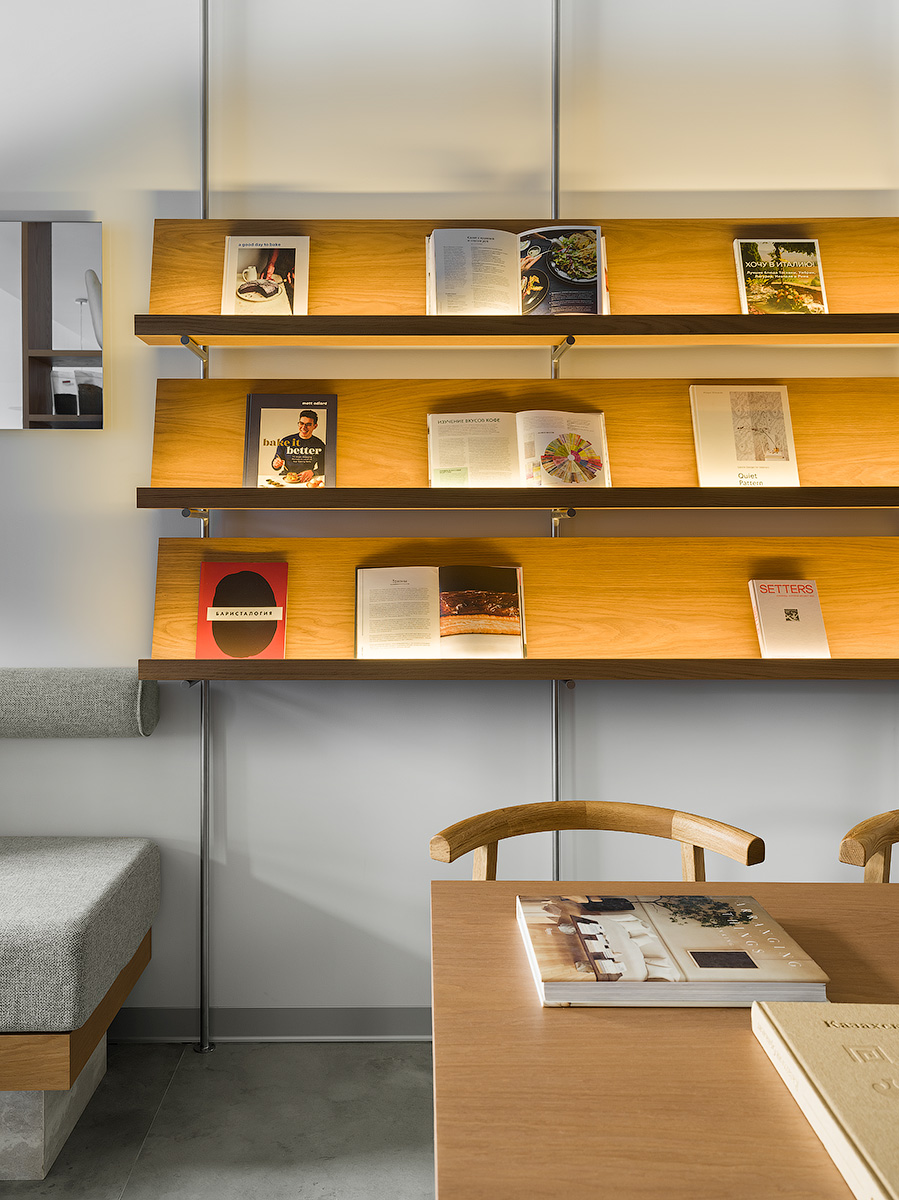 Several lamps from our bureau, a mirror strip along the wall, a bookcase with books are the main decorative elements of the interior. We wanted to give as much free space as possible to light, air and the aroma of coffee and fresh pastries.