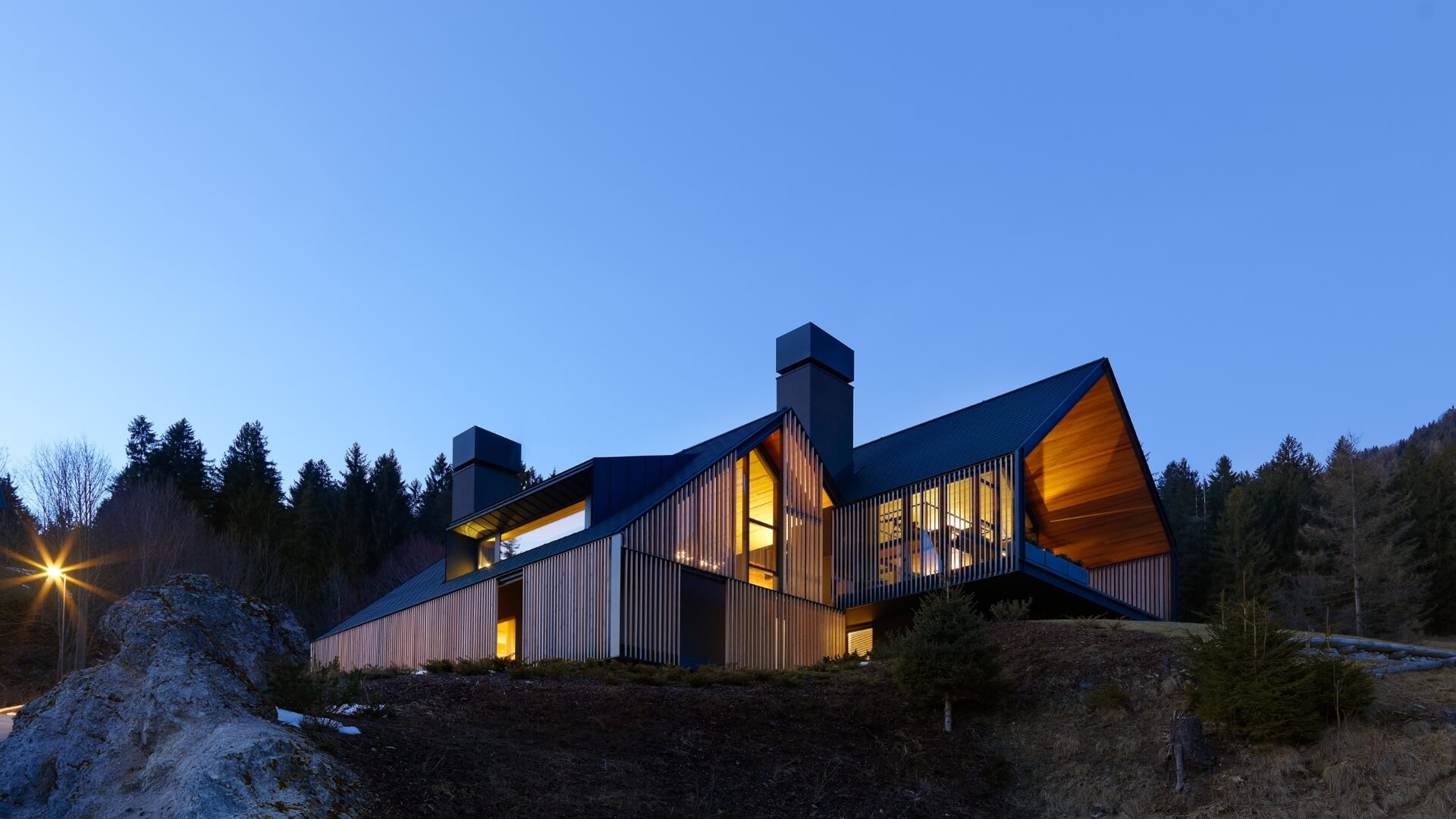 The building is intentionally positioned below the level of the main house, taking advantage of the steep slope to preserve uninterrupted views toward the mountains and surrounding forest. This placement also helps detach the structure from the terrain, protecting it from humidity while enhancing privacy. The architectural form is defined as a simple rectangular prism, allowing clarity in both spatial organization and construction logic.