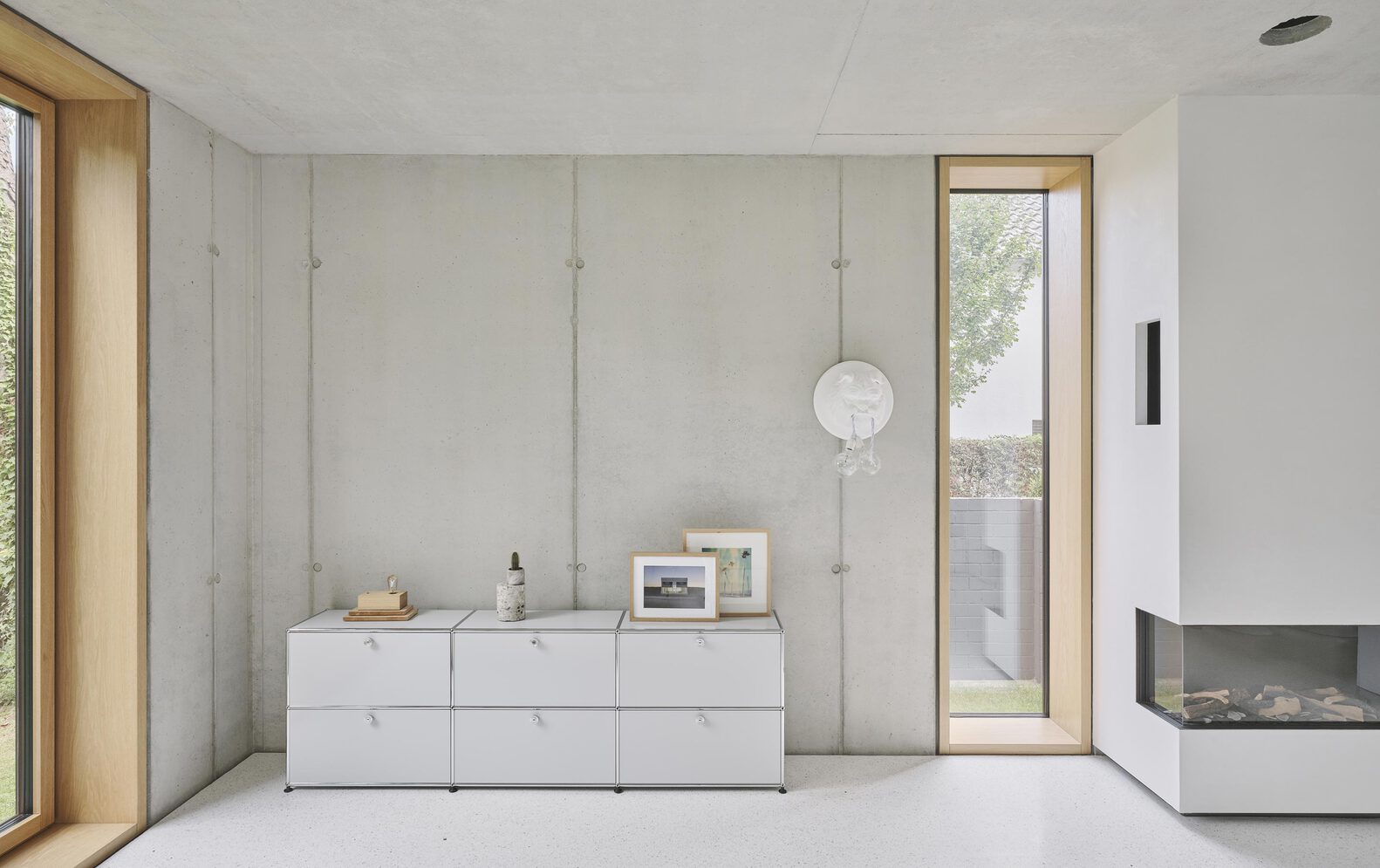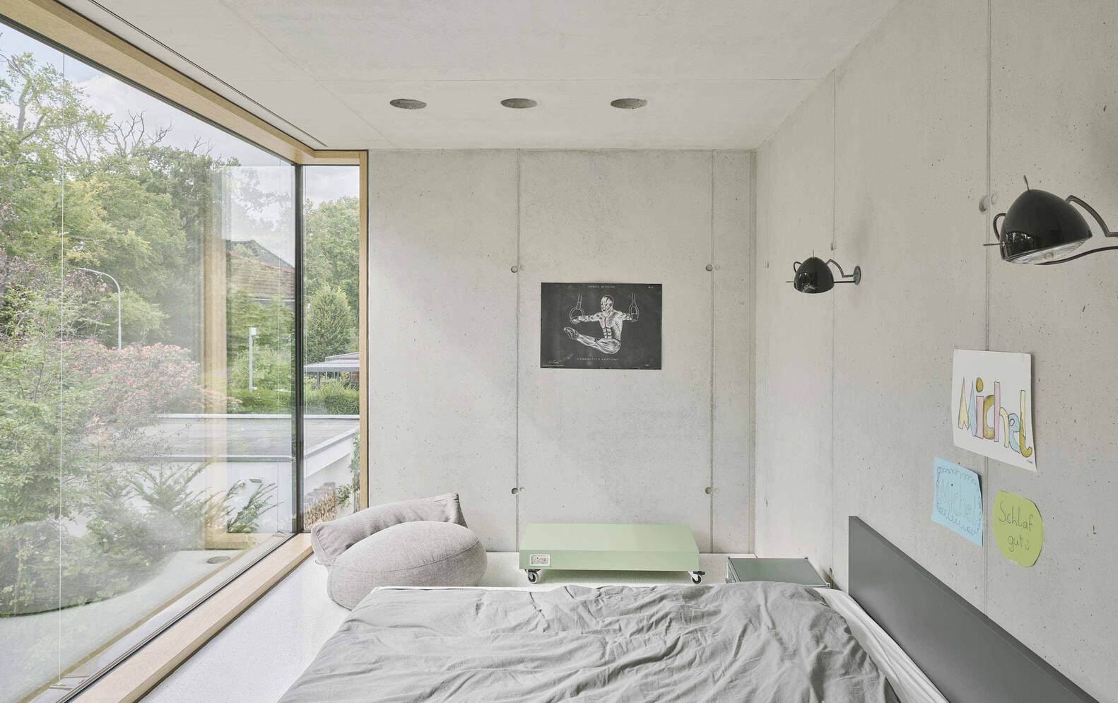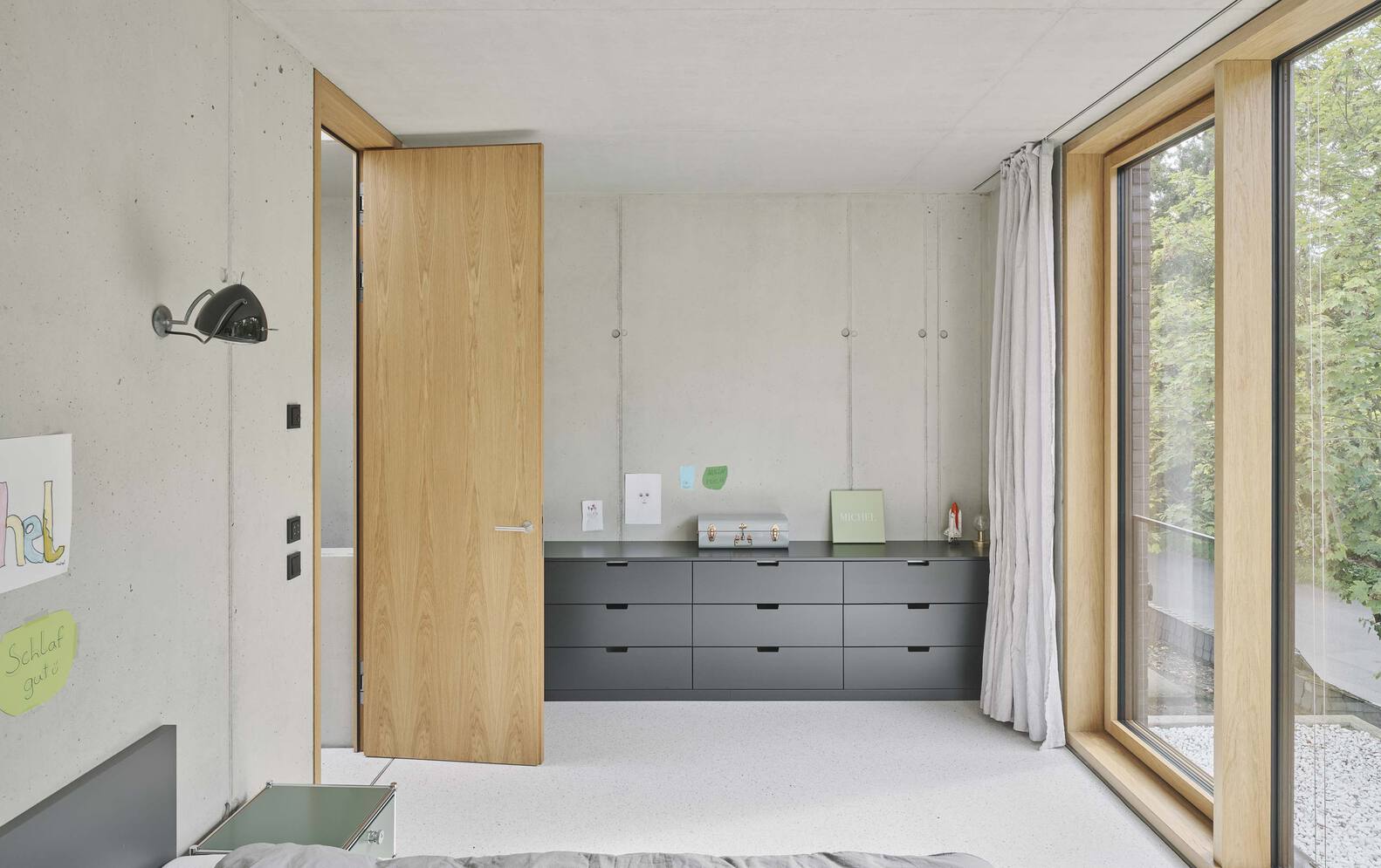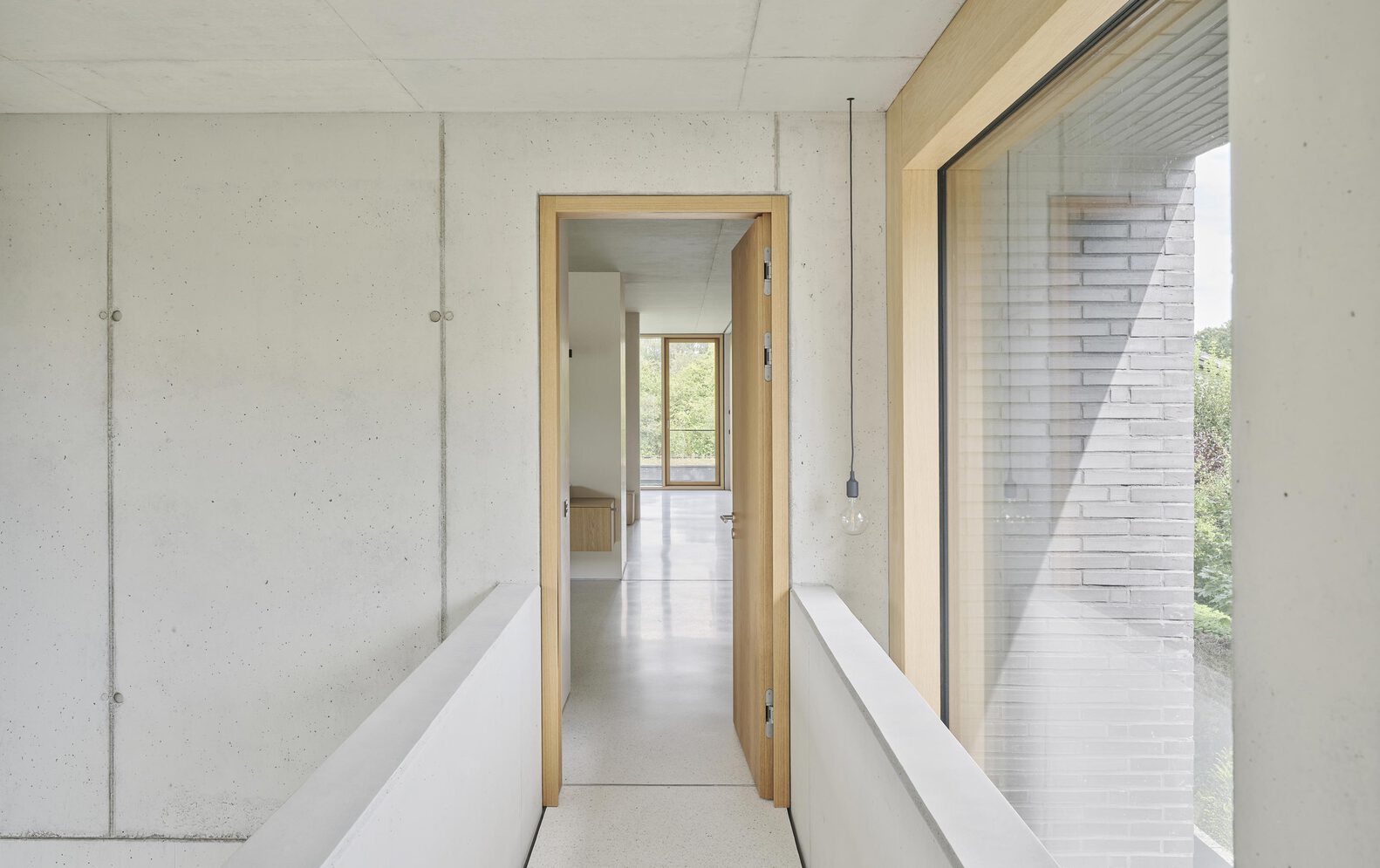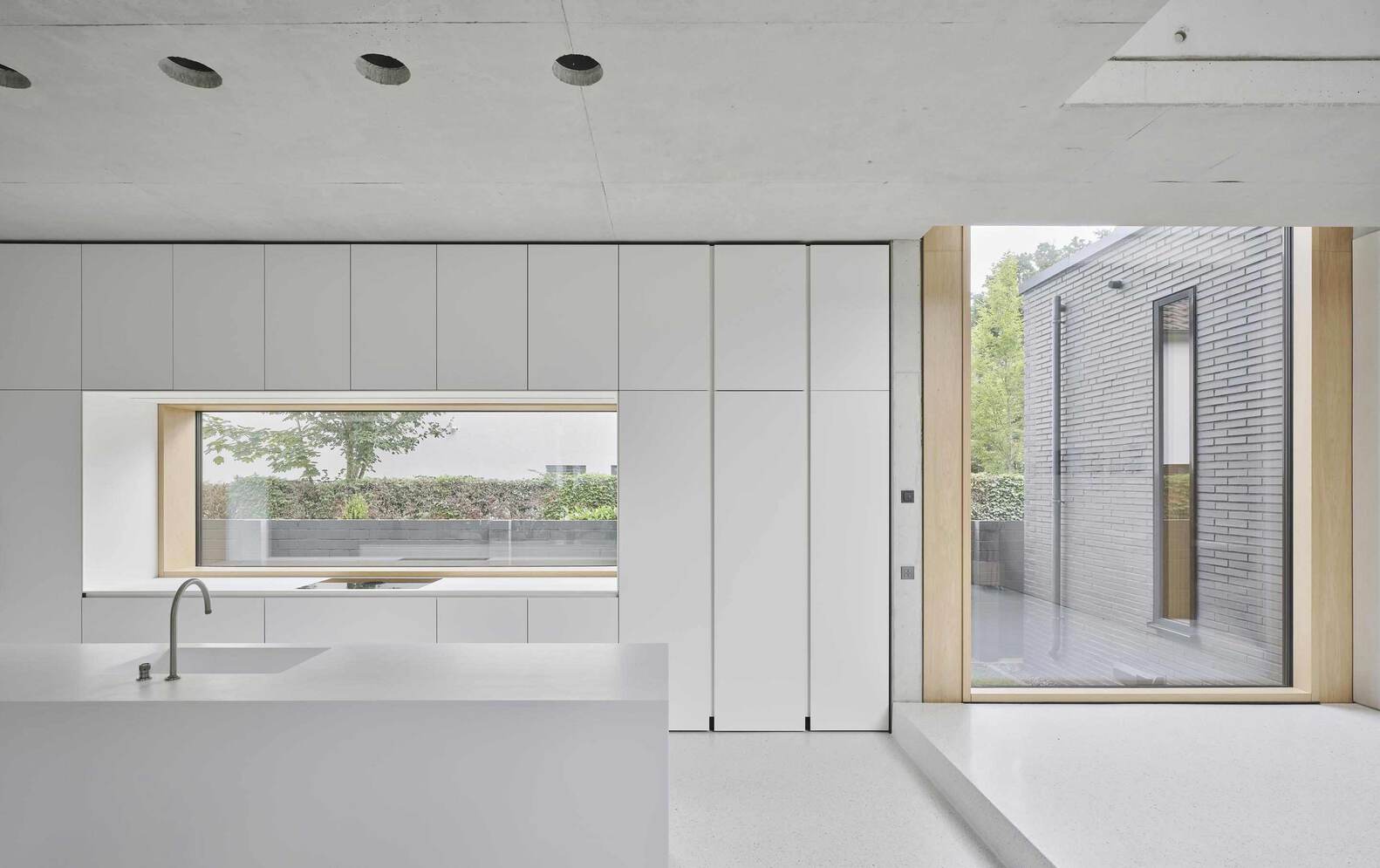 Large glazed openings are strategically oriented to the north to prevent overheating while maximizing consistent daylight. Floor-to-ceiling windows and interior oak doors further enhance spatial continuity and visual depth. The upper level is divided into private zones, including children's and sleeping areas, connected via a concrete walkway overlooking the central gallery.