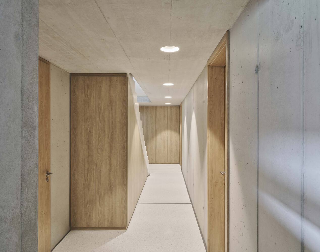 Materiality plays a defining role in the project’s architectural identity. The exterior is wrapped in a homogeneous dark façade, punctuated by carefully positioned openings that appear minimal from the outside but provide rich spatial experiences within. Inside, a contrast emerges between raw concrete surfaces, polished terrazzo flooring, and oak wood elements, creating a balanced dialogue between rough and refined textures.