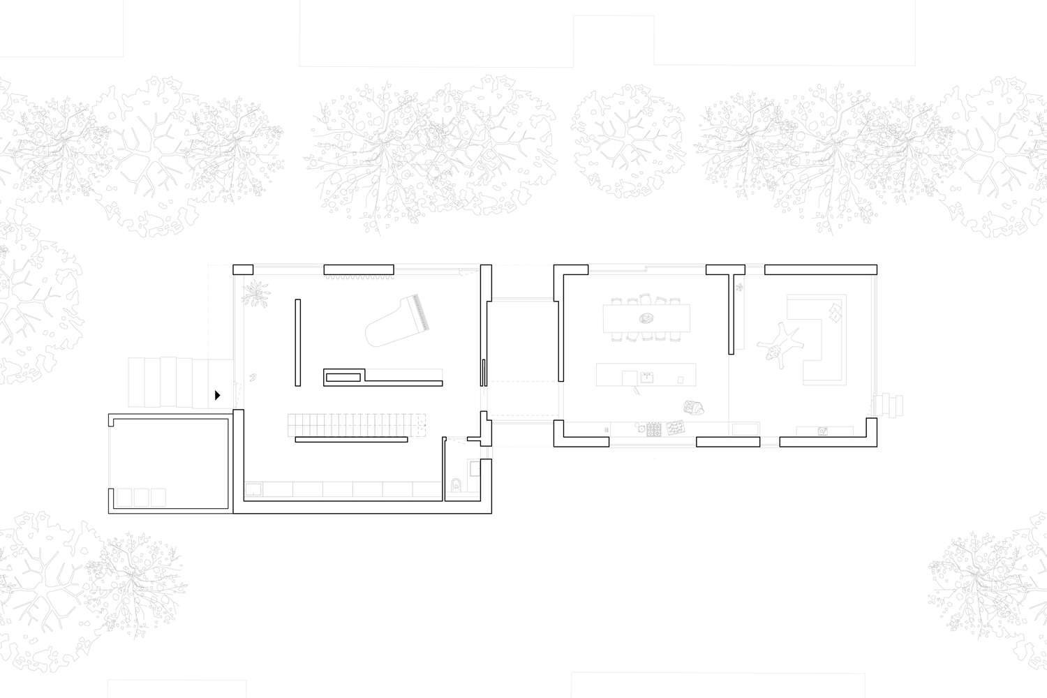 The building is slightly recessed at the ground level to define a clear entrance condition, while internally the plan is divided into two primary zones. The front section accommodates more public functions such as foyer and exhibition-like spaces, while the rear opens toward the garden, hosting the kitchen and living areas. This duality is reinforced by a continuous roof structure that unifies the composition both structurally and visually.