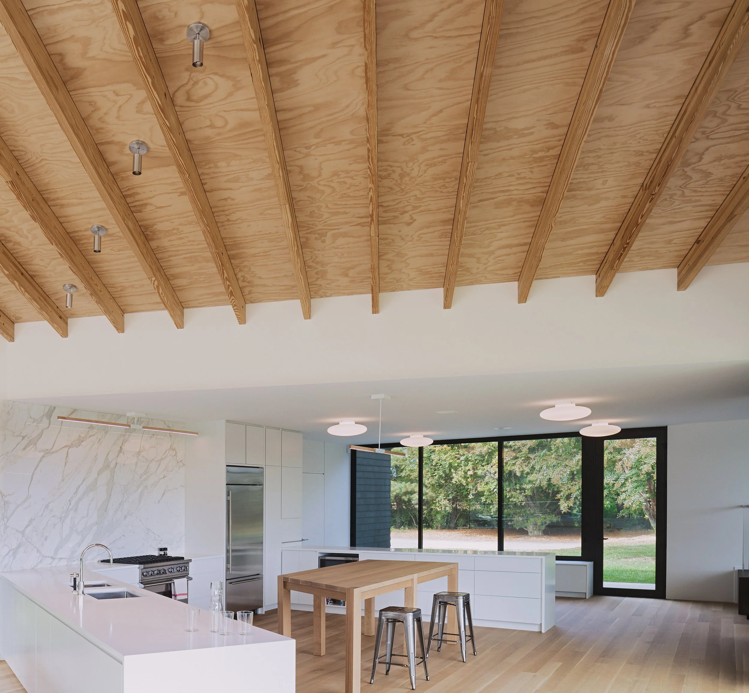 Architecturally, the new addition introduces a bold reinterpretation of traditional Hamptons forms. While the exterior references familiar vernacular materials and proportions, the interior expresses a more dynamic spatial experience. The living areas are defined by an undulating vaulted ceiling composed of exposed structural framing, creating a sculptural volume that celebrates the central gathering spaces of the house. This dramatic ceiling element contrasts with the simpler geometry of the original cottage while maintaining a cohesive architectural language.